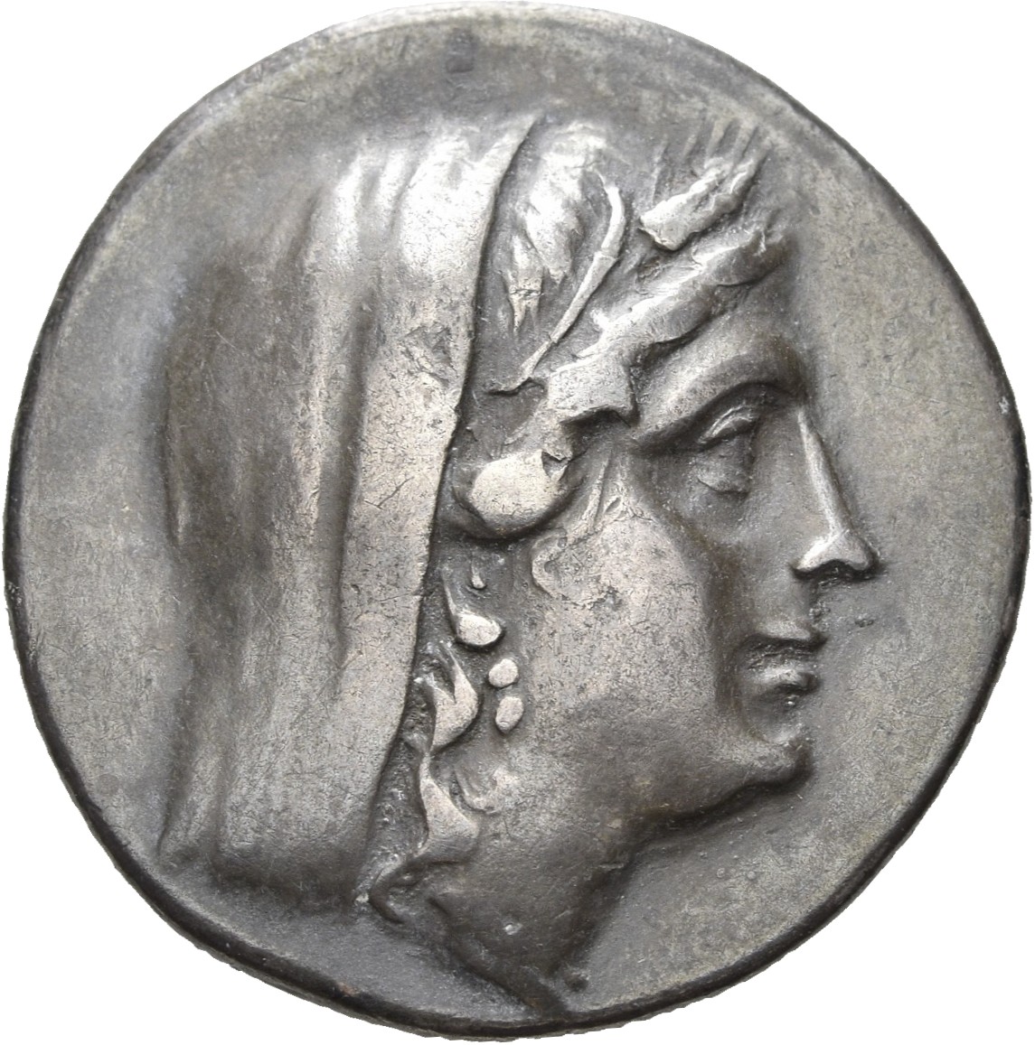 Omfalosun üzerinde duran ve elinde ok ve yay tutan bir klamys (pelerin) üzerinde oturan Apollon