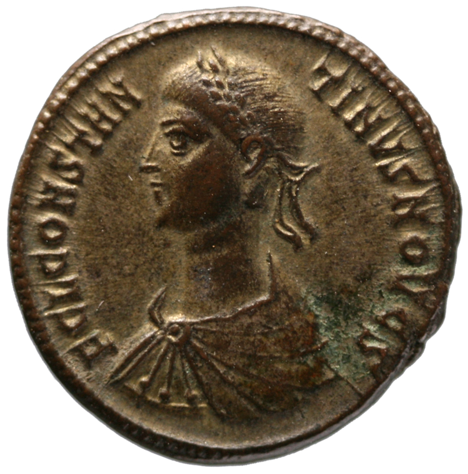 Bust of Constantine II laureate draped cuirassed left -[en]