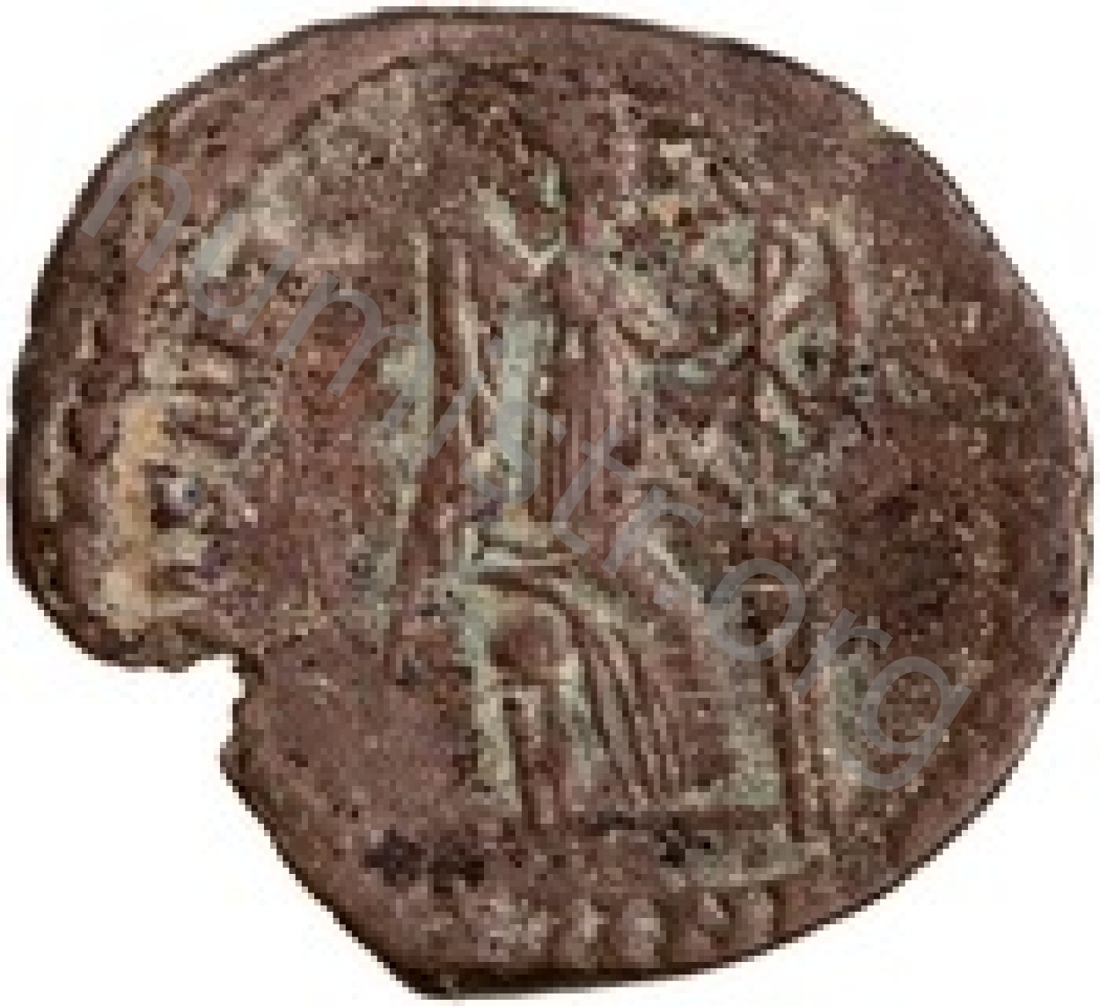 Victory winged draped seated right on cuirass pointing to a shield inscribed with a ☧ supported on a low column -[en]