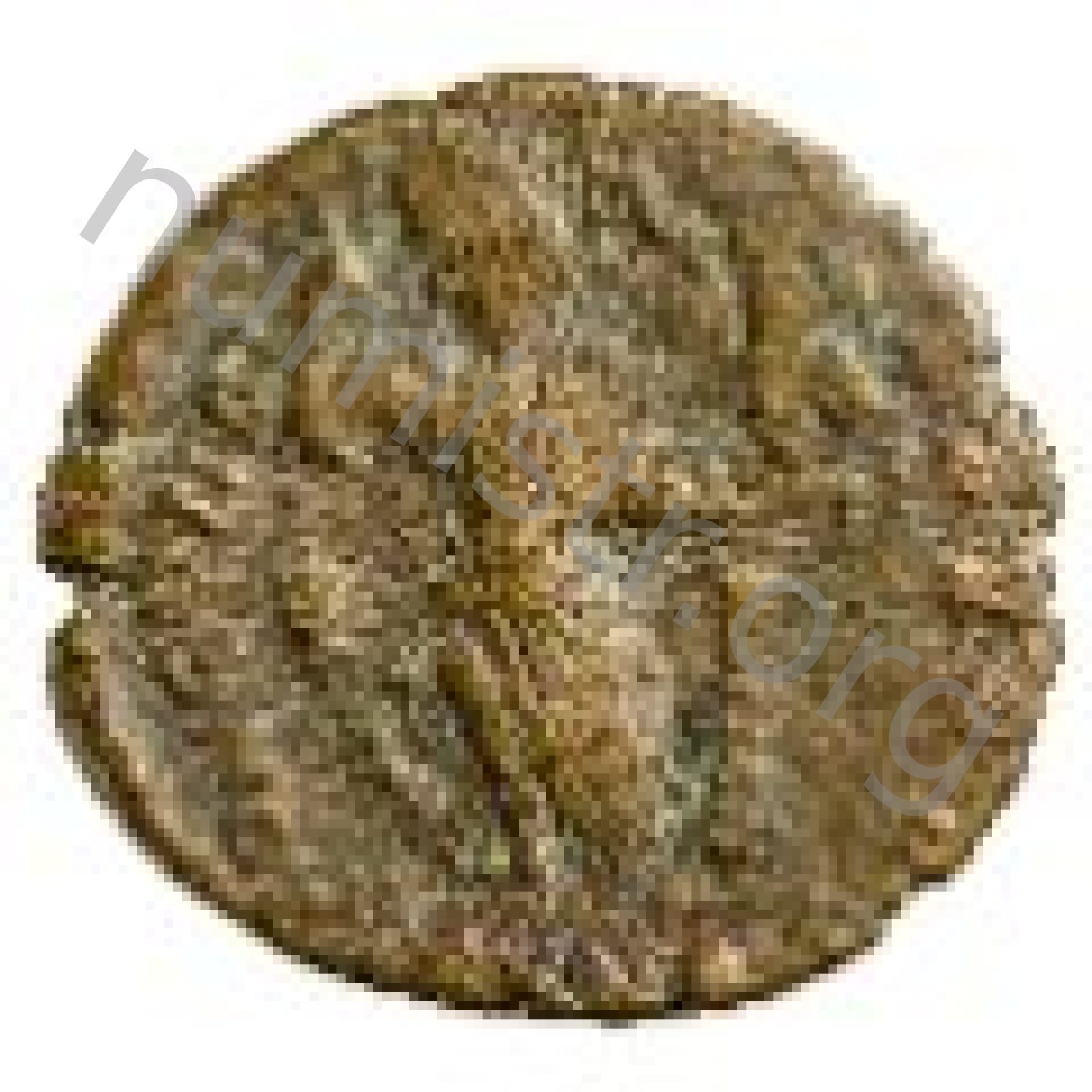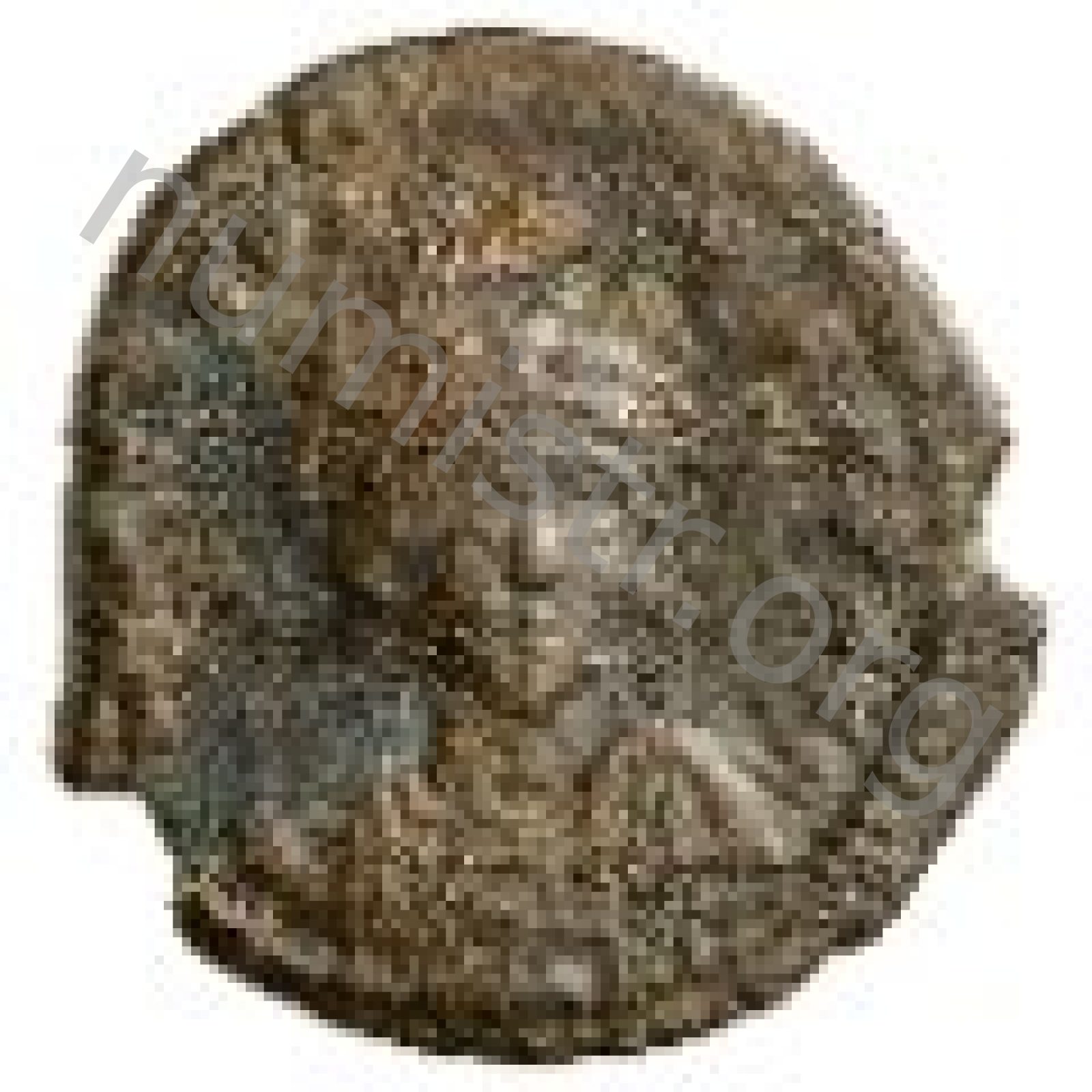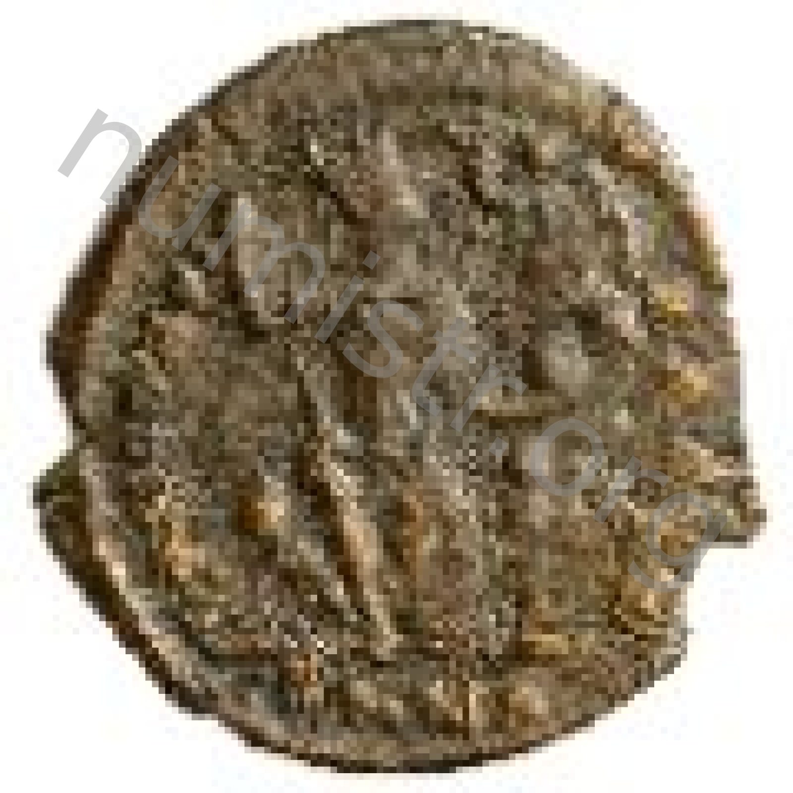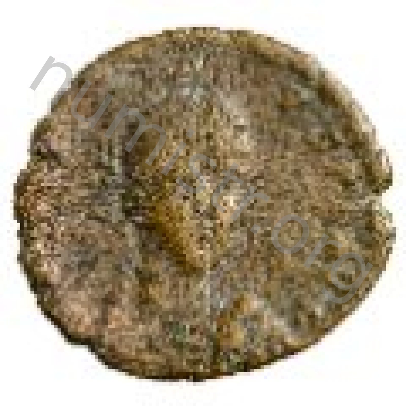 Konstantinopolis miğferli örtülü tahtta oturan öne doğru bakan başı sağa dönük sağ elinde uzun asa ve sol elinde küre üzerinde Zafer heykeli tutuyor; sağ ayağının altında pruva