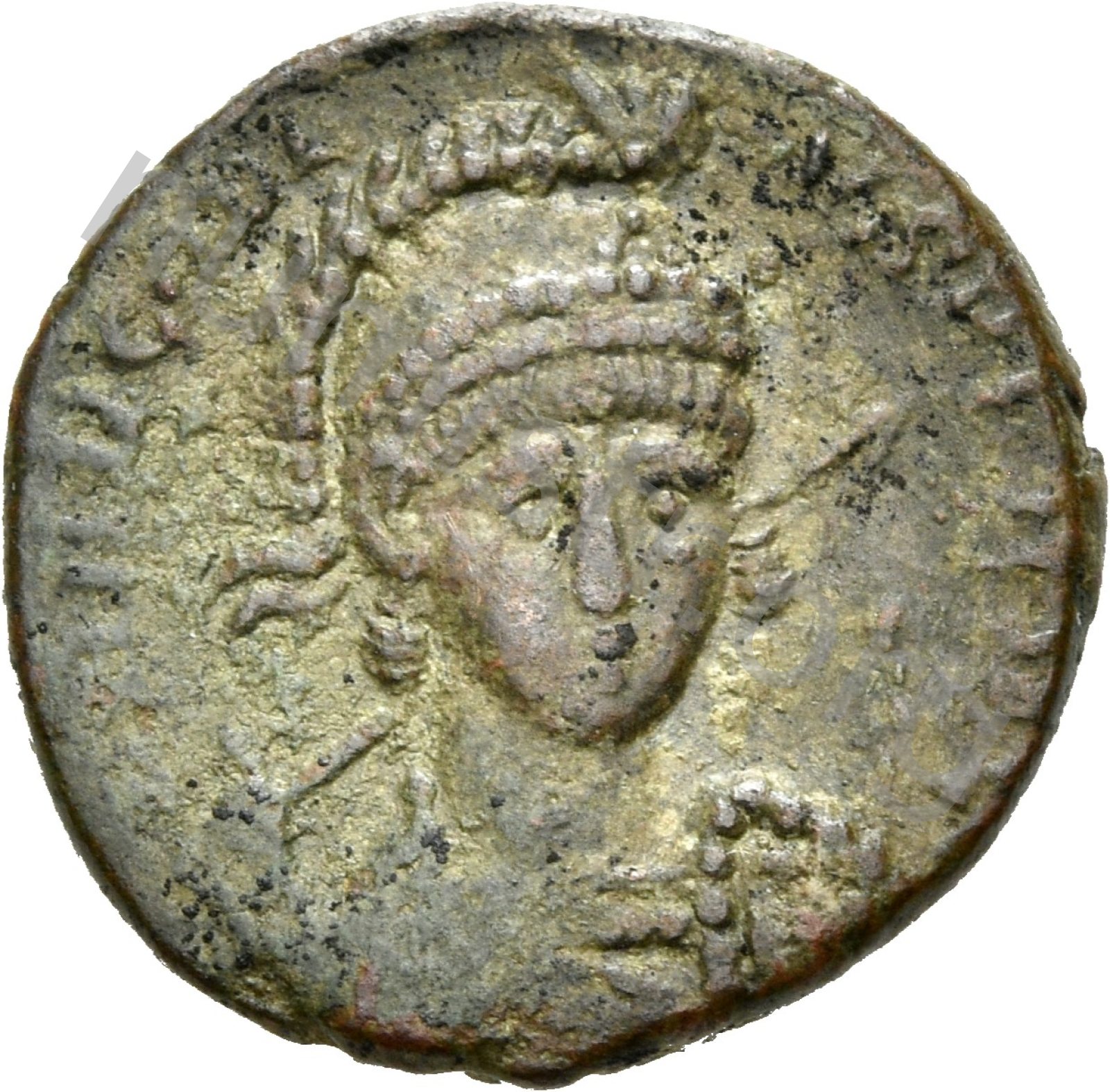 Bust of Arcadius helmeted pearl-diademed cuirassed facing front holding spear in right hand behind head and shield decorated with cross on left arm -[en]