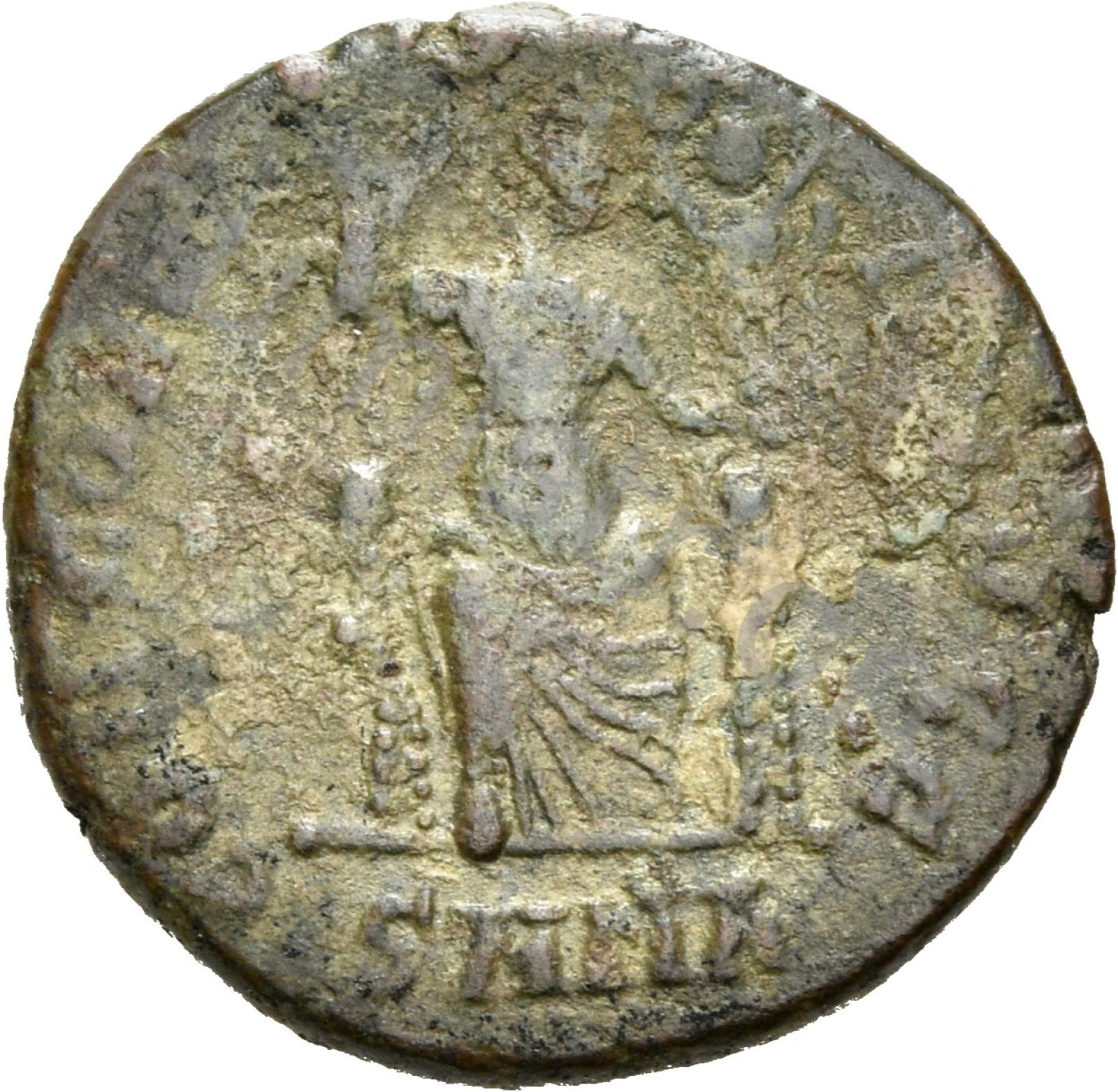 Constantinopolis helmeted draped enthroned enthroned facing front head right holding long sceptre in right hand and Victory on globe in left hand; beneath her right foot prow -[en]