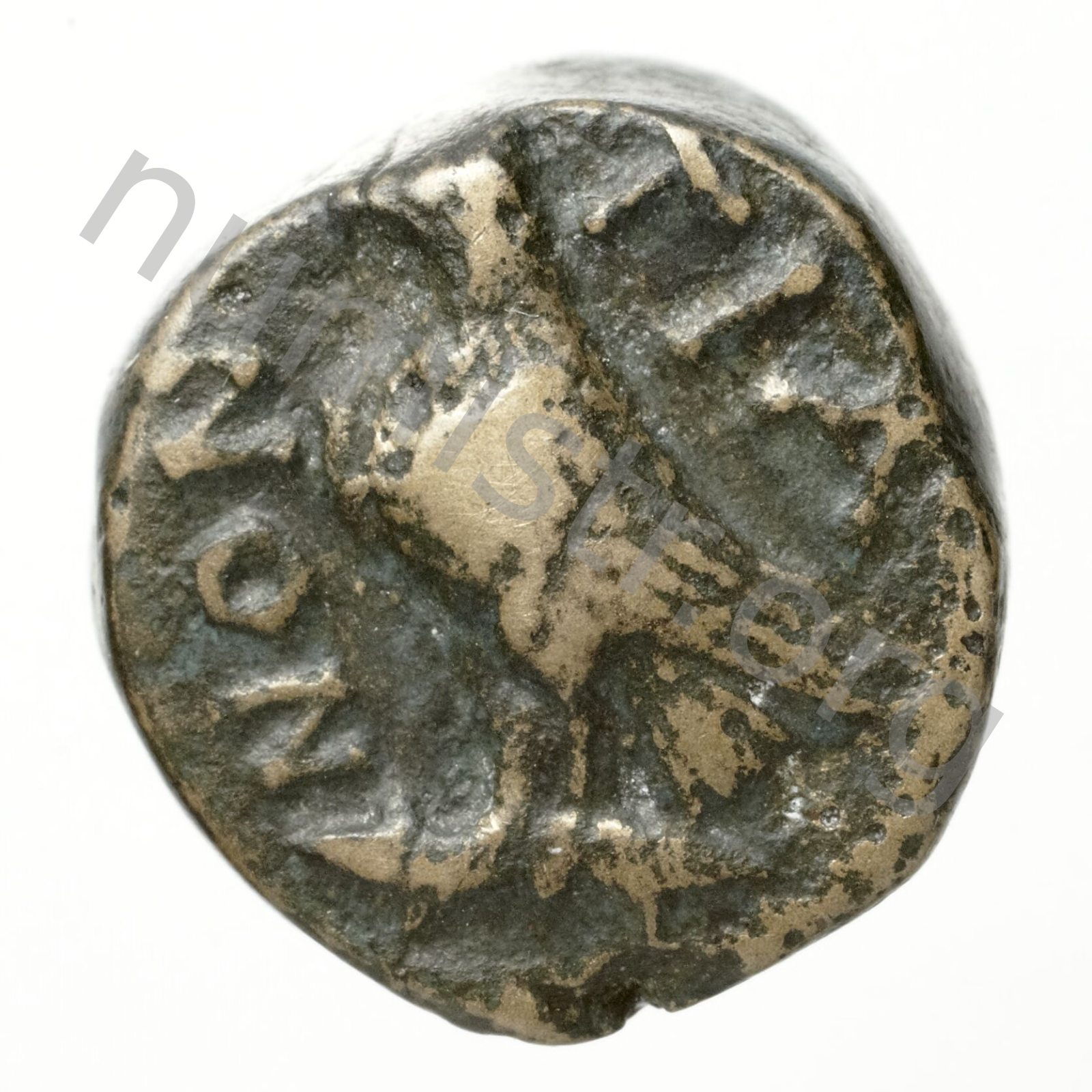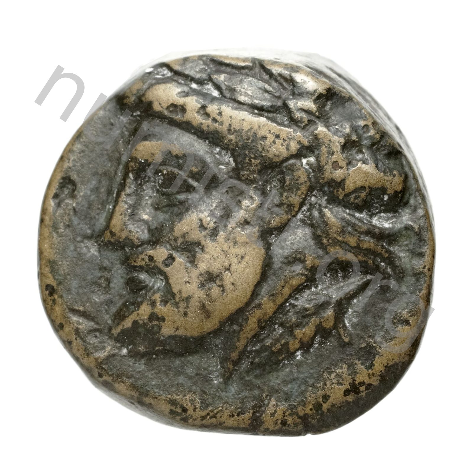 Head of Zeus wearing a laurel wreath; in the lower field a corn-ear -[en]