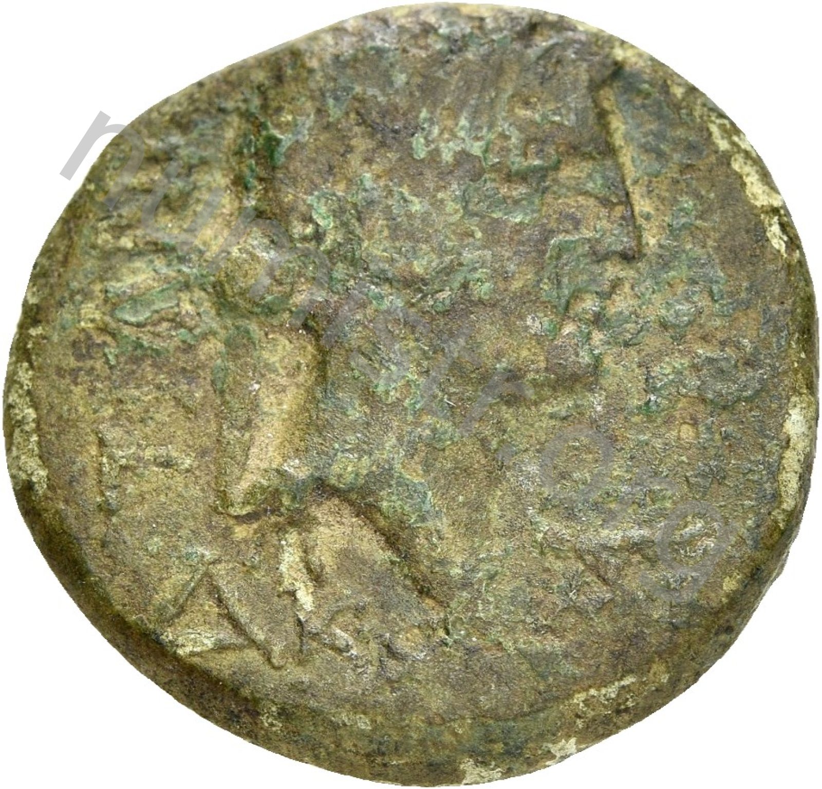 Roma kalkan yığınının üzerinde oturmuş miğfer takmış elinde Nike ve mızrak tutuyor