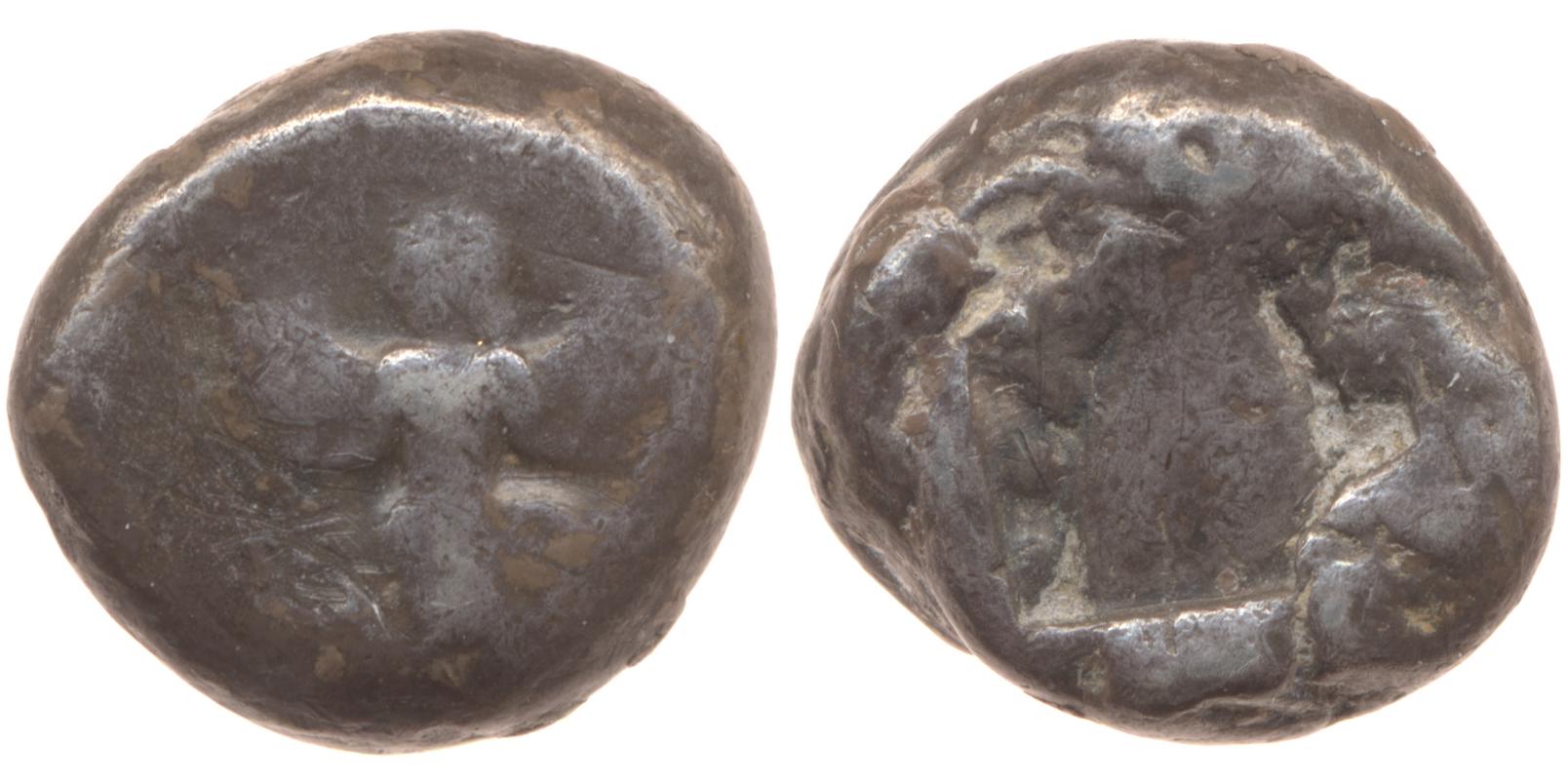 Başını çevirerek yürüyen kanatlı kadın figürü üzerinde kiton (pileli tunik) ve kanatlı ayakkabılar giyiyor