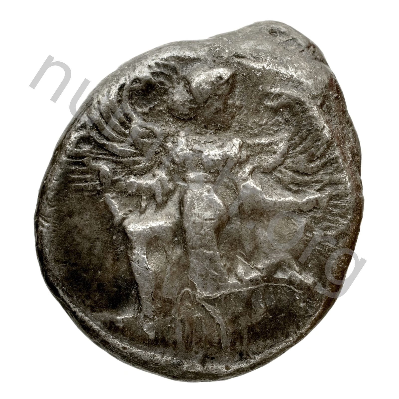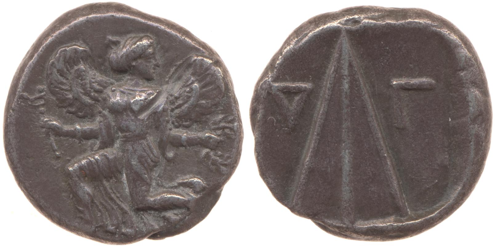 Başını çevirmiş diz çökmüş kanatlı kadın figürü sağ elinde bir caduceus ve sol elinde bir çelenk tutan bir kiton (pilili tunik) giymiş