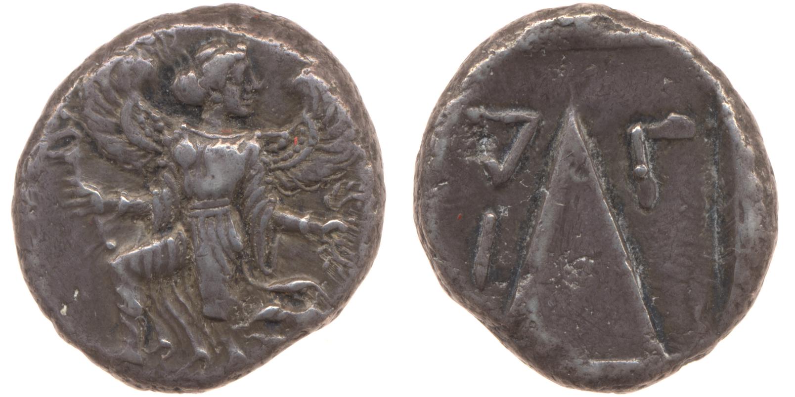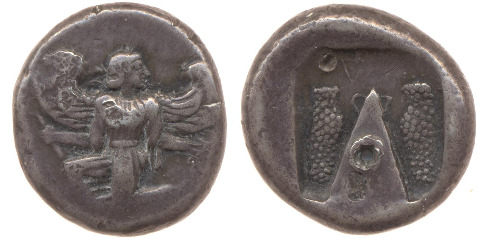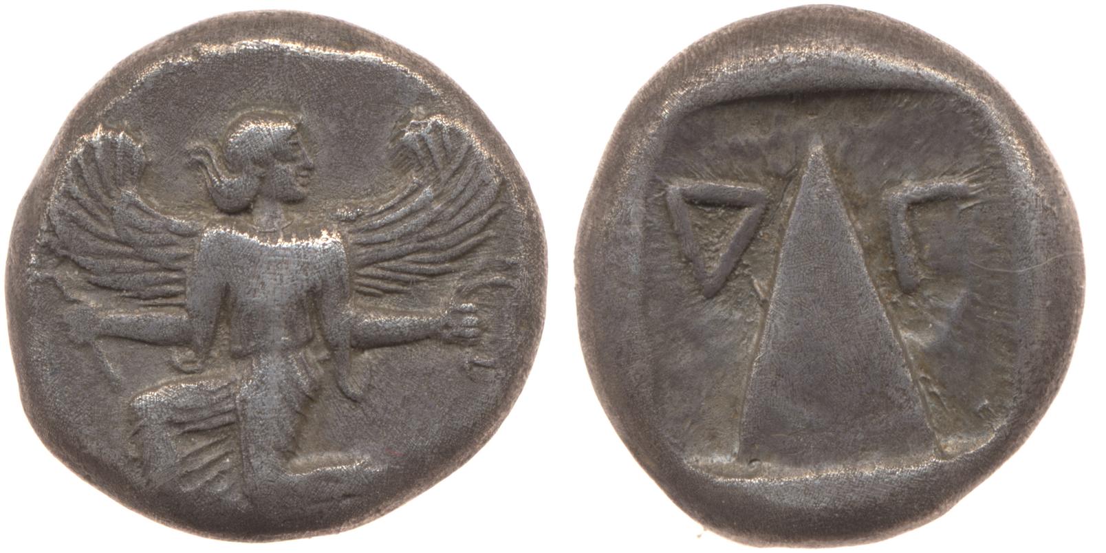 Baetyl decorated with a globule in an incuse square; legend -[en]