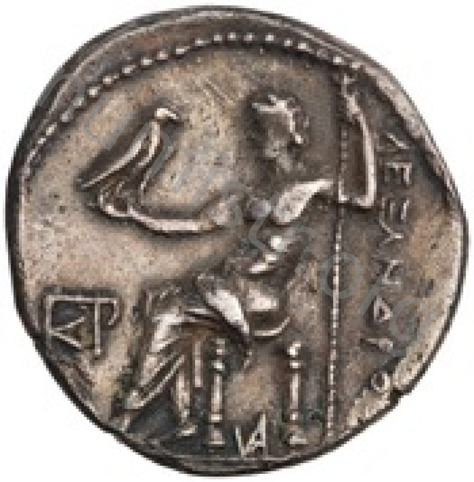 Zeus seated on stool-throne left eagle on outstretched right hand sceptre in left hand -[en]