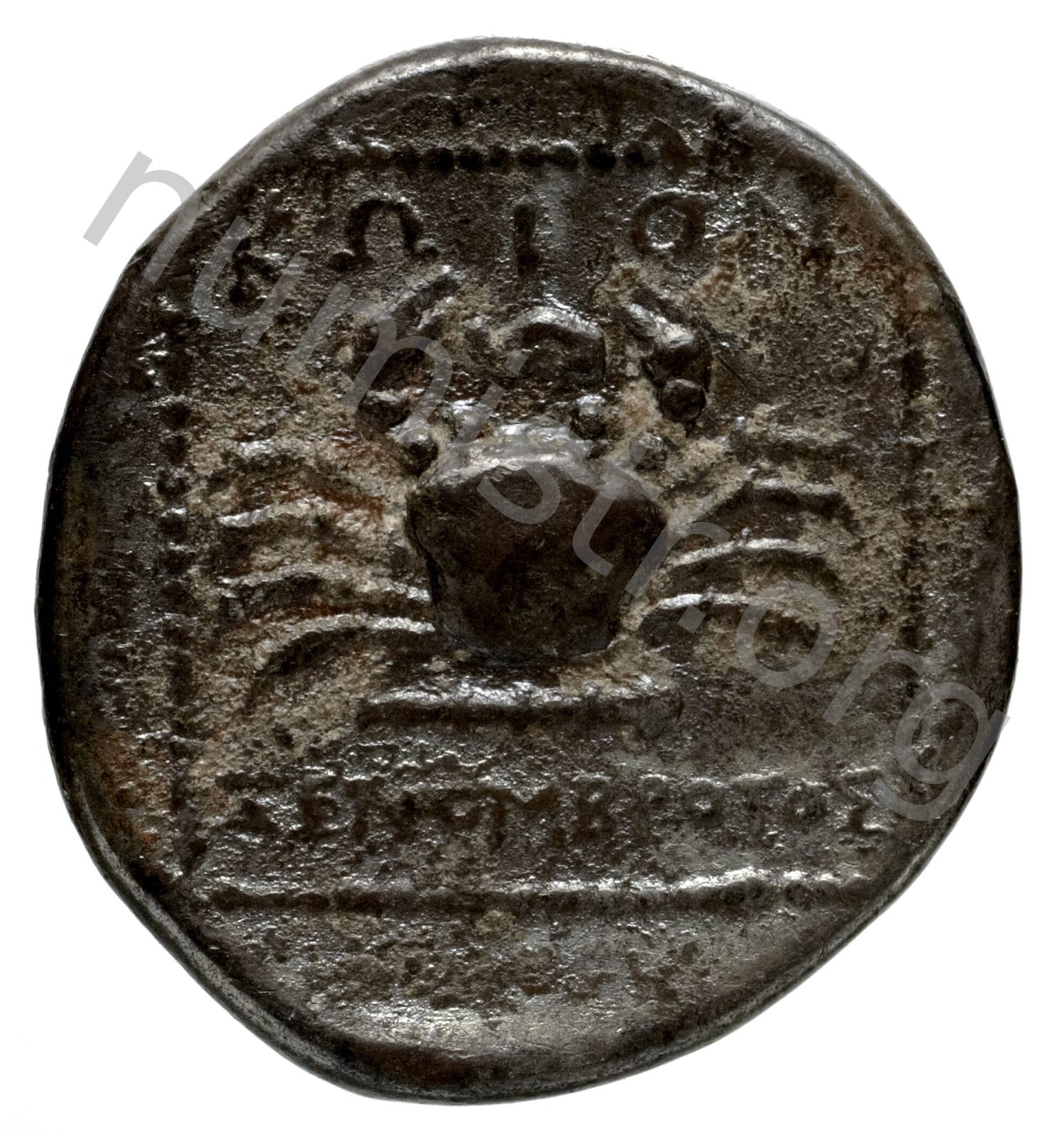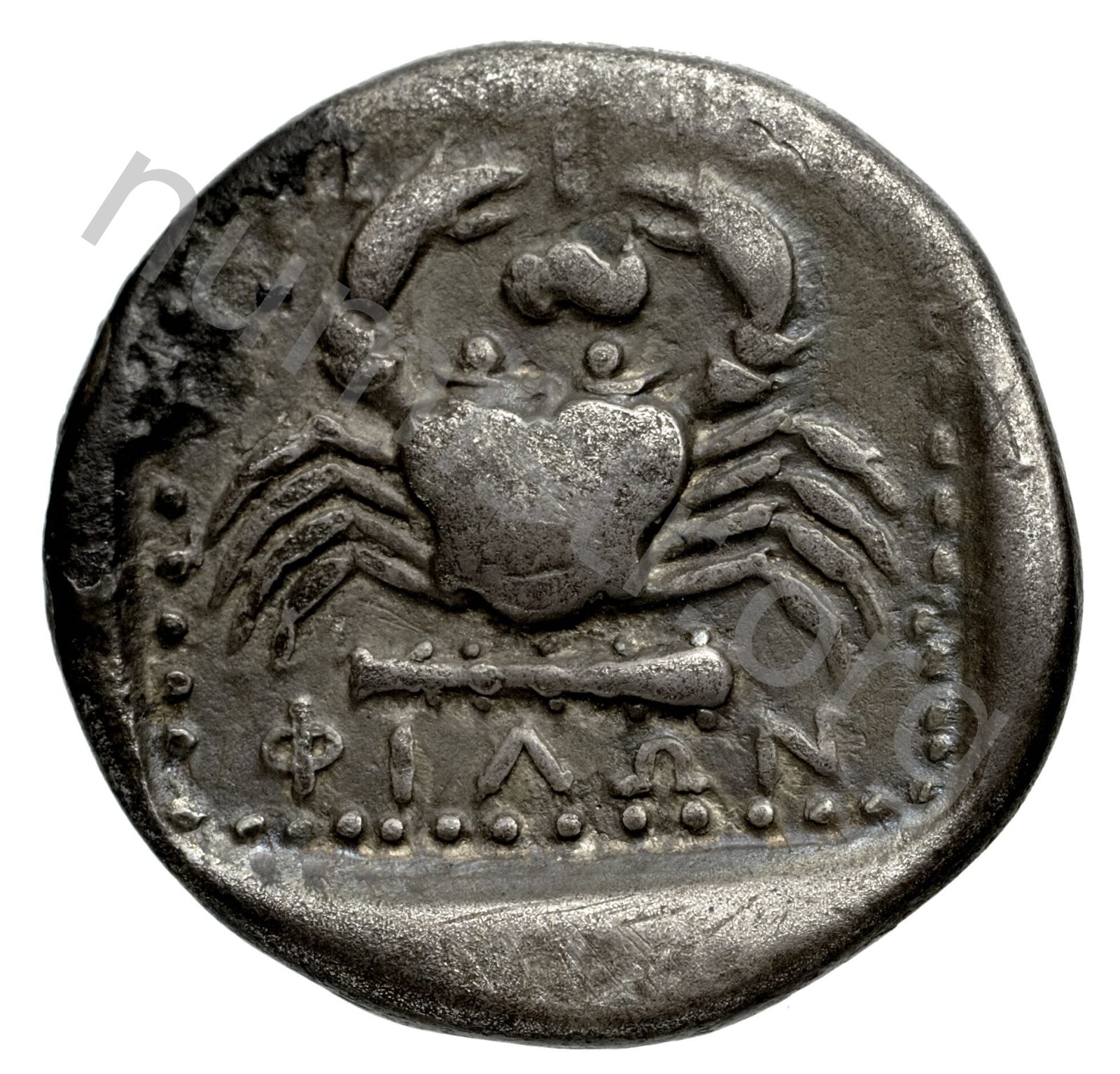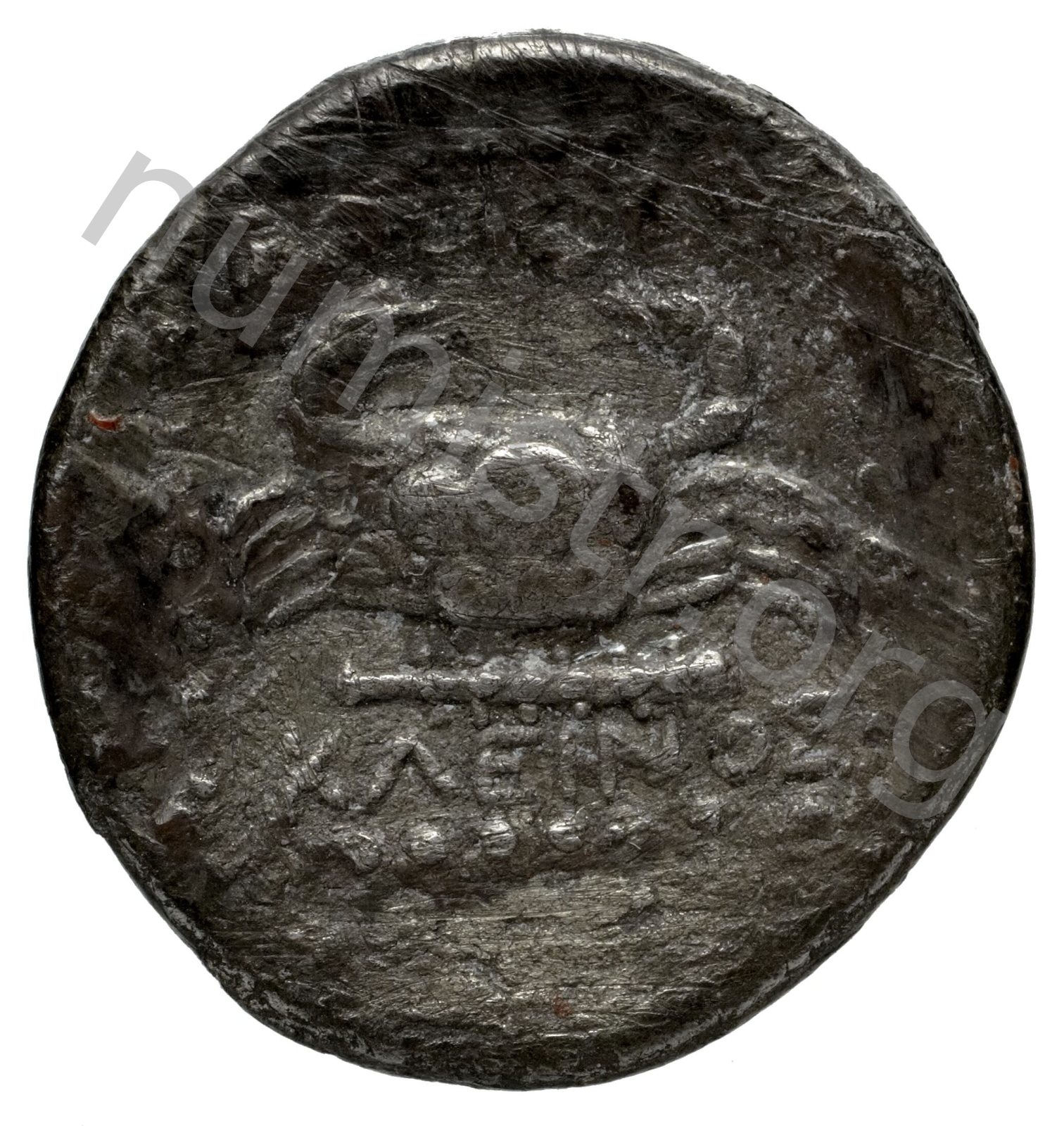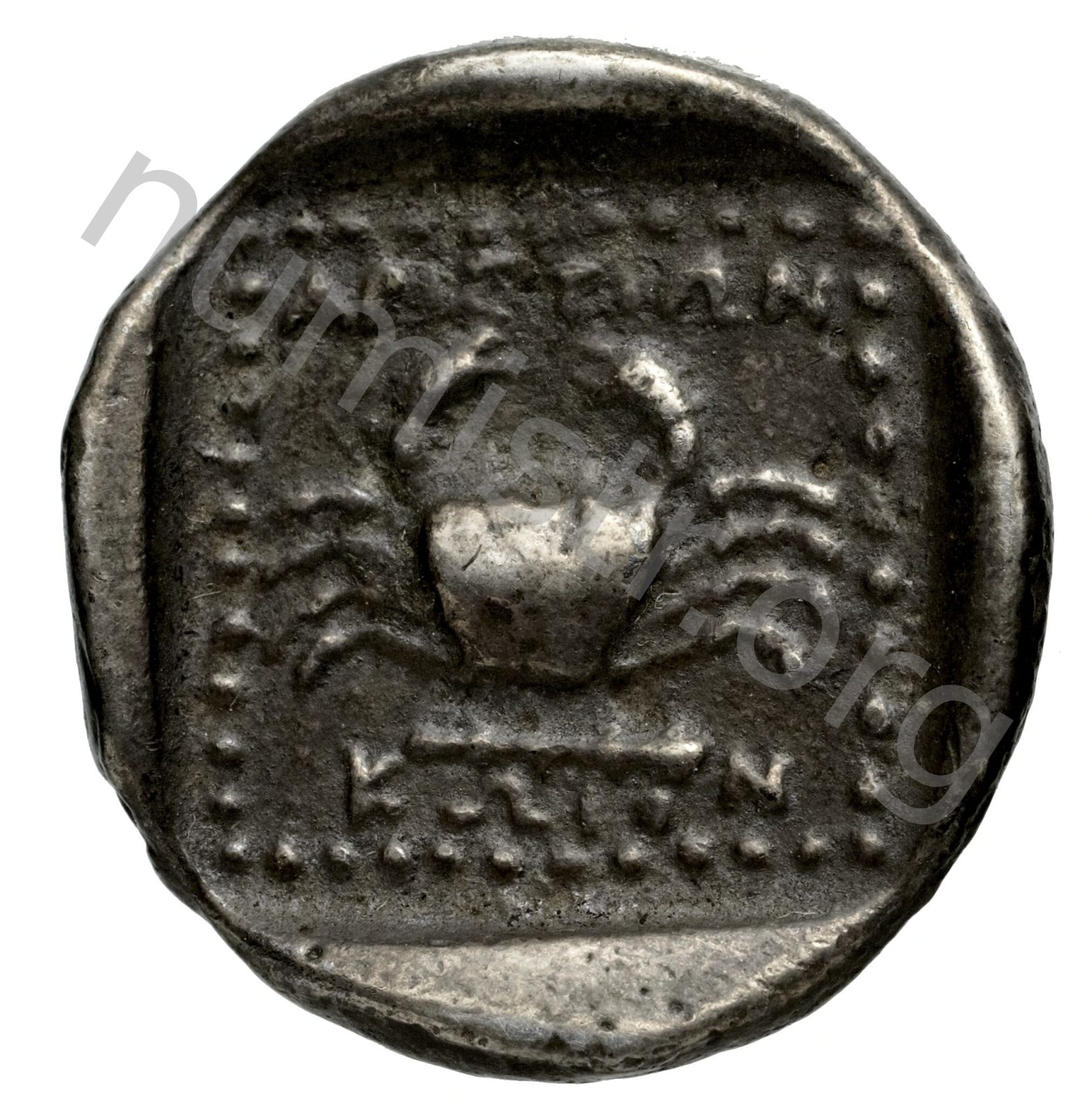 Crab and club; between its pincers a silkworm; all in an incuse square -[en]