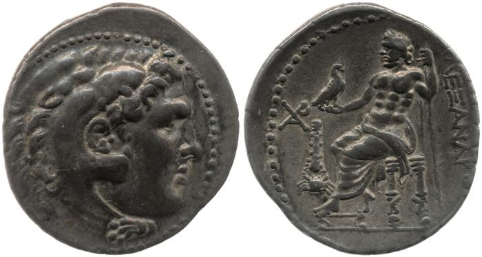 Head of beardless Heracles right wearing lion skin headdress -[en]