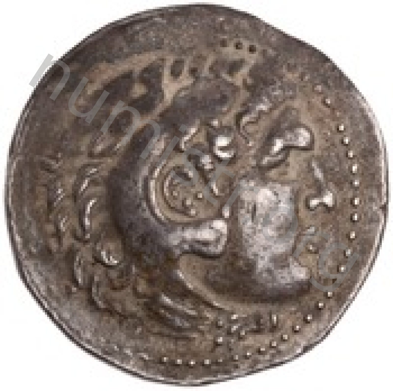 Head of beardless Heracles right wearing lion skin headdress -[en]