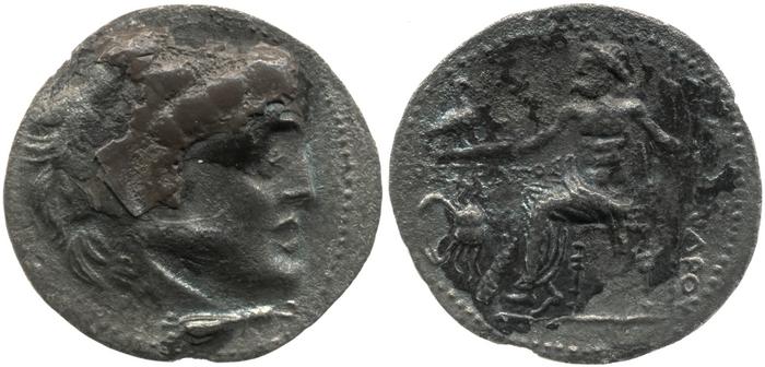 Head of beardless Heracles right wearing lion skin headdress -[en]