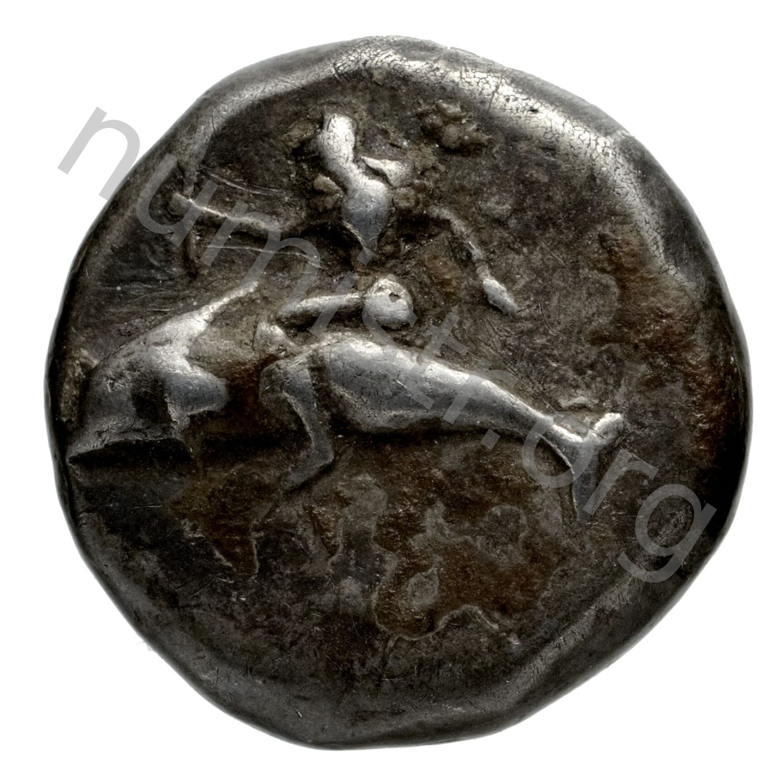 Nude male figure with a headdress and an uncertain object in his hand astride a dolphin -[en]