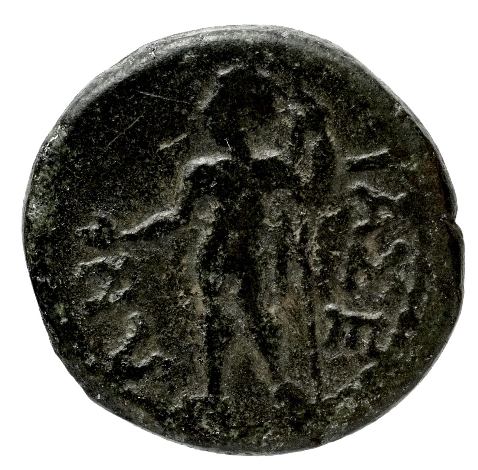 Male figure naked facing wearing a helmet and holding a phiale (ritual bowl) (ritual cup) and a sceptre -[en]