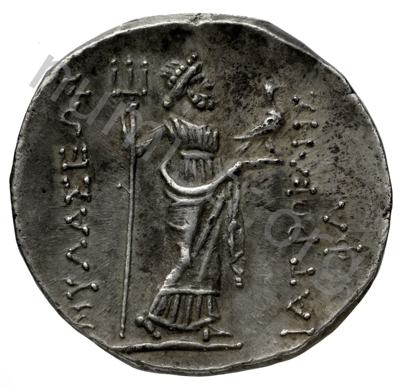 Sol koluna örtülmüş bir kiton himation (pelerin) giyen Zeus Labraundos sağ elinde çift balta sol elinde ise mızrak tutuyor.