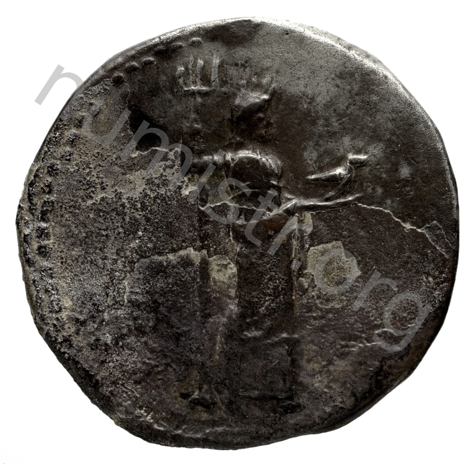 Sol koluna örttüğü himation (pelerin) ve bir chiton giyen Zeus Osogo elinde üç dişli bir mızrak ve bir kartal tutuyor.
