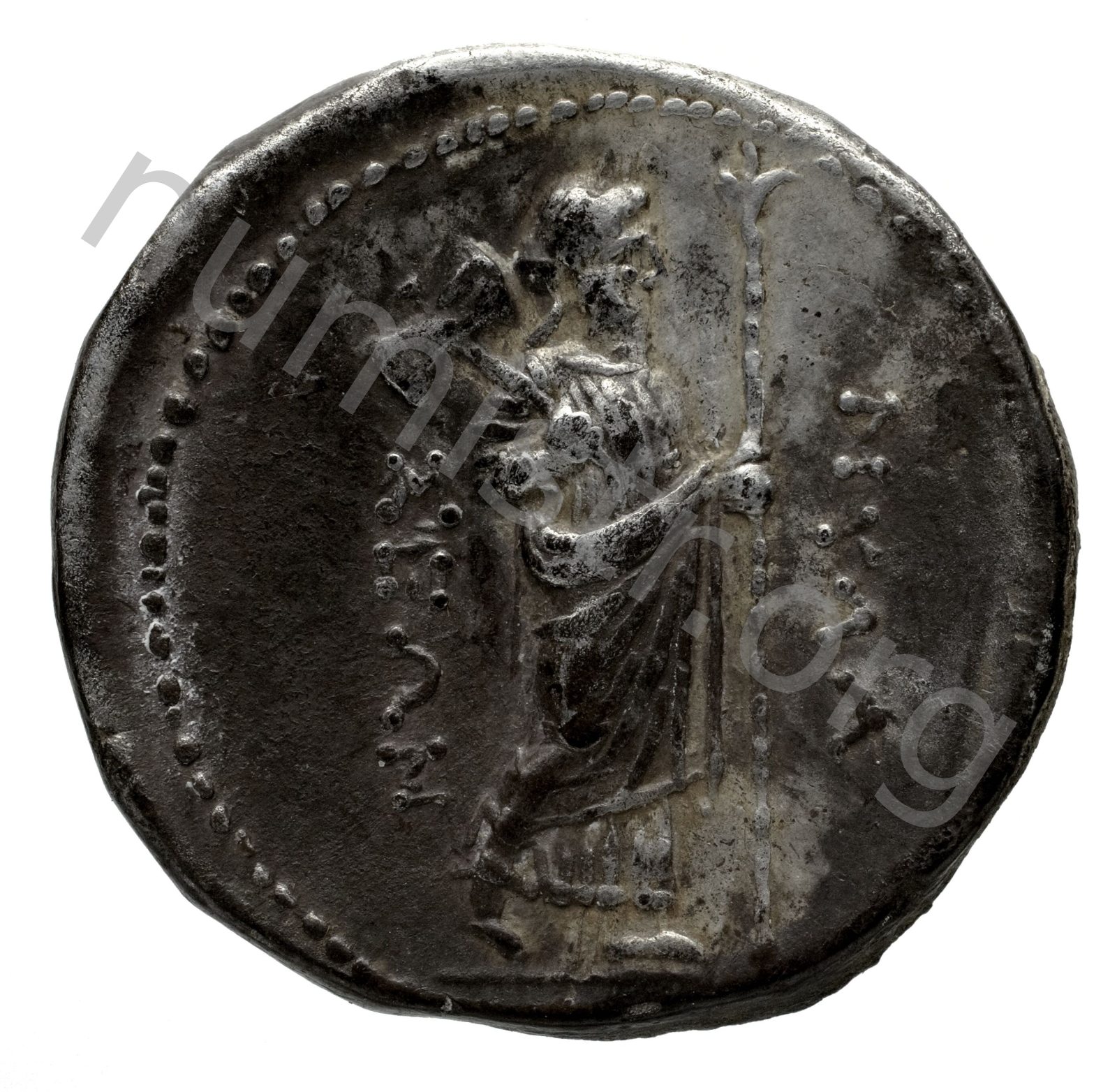 Zeus Labraundos wearing a chiton (tunic) a himation draped over his arm holding a double axe and a sceptre -[en]