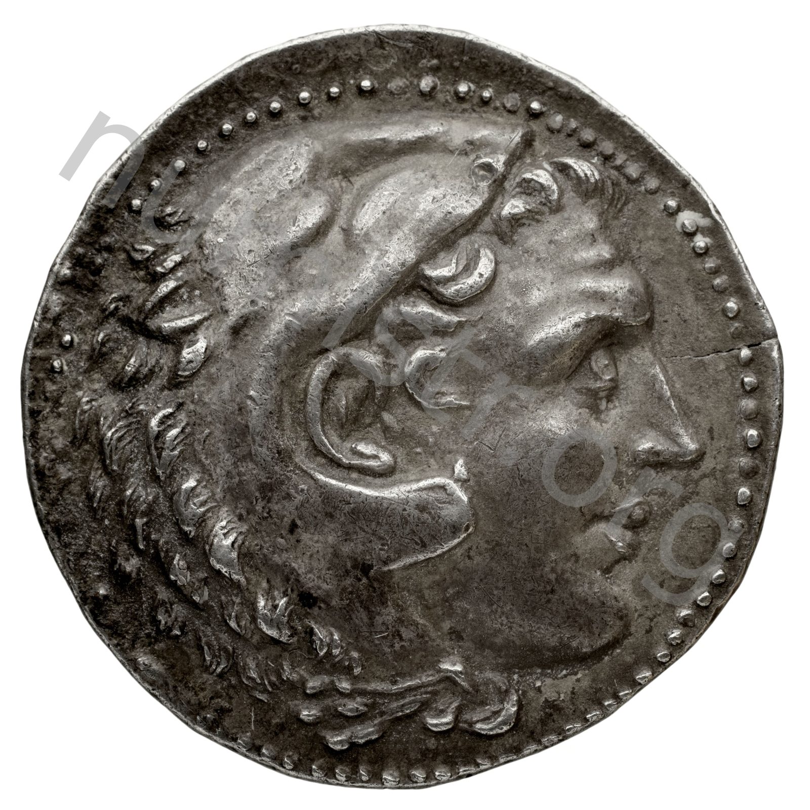 Head of beardless Heracles right wearing lion skin headdress -[en]