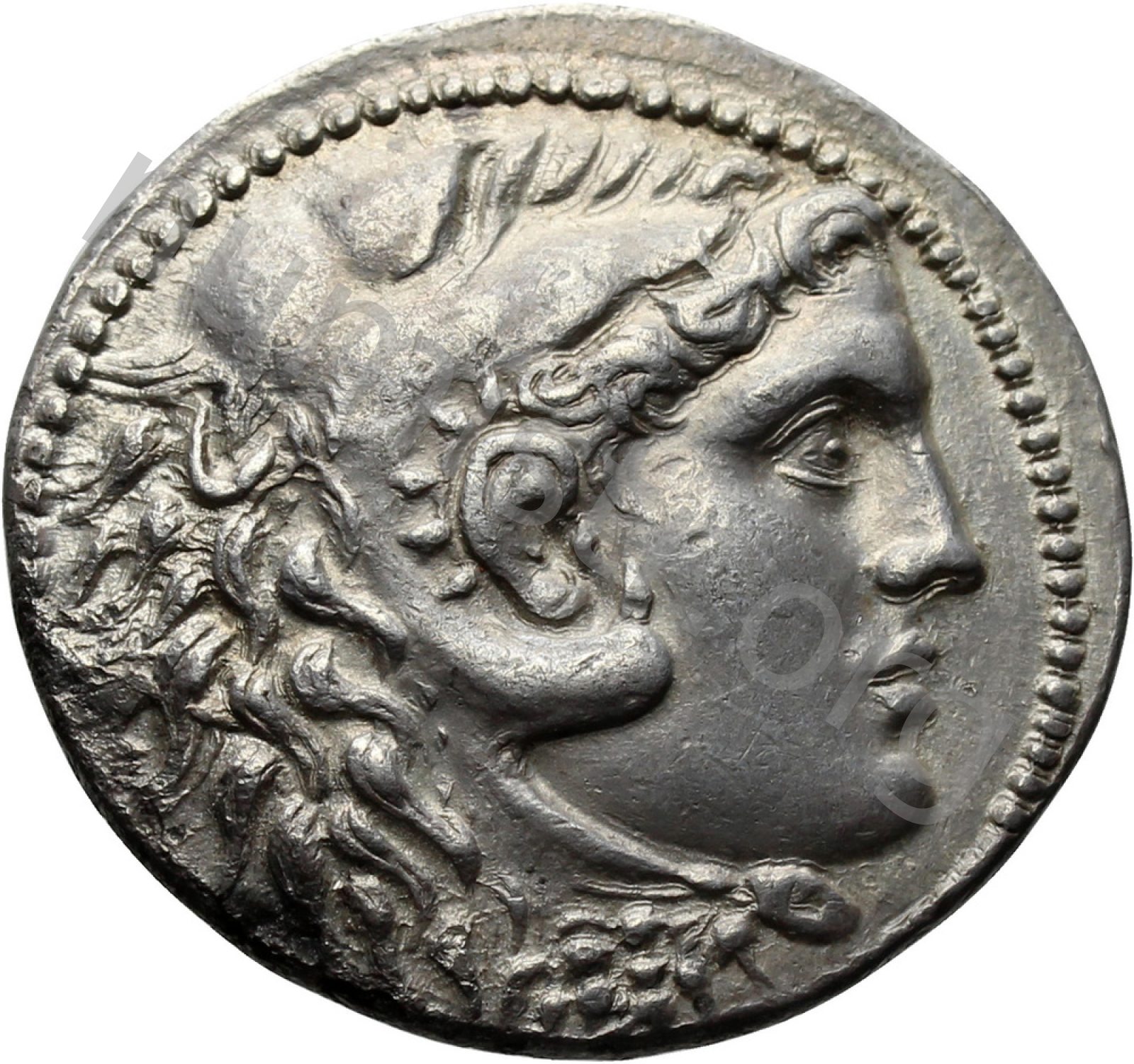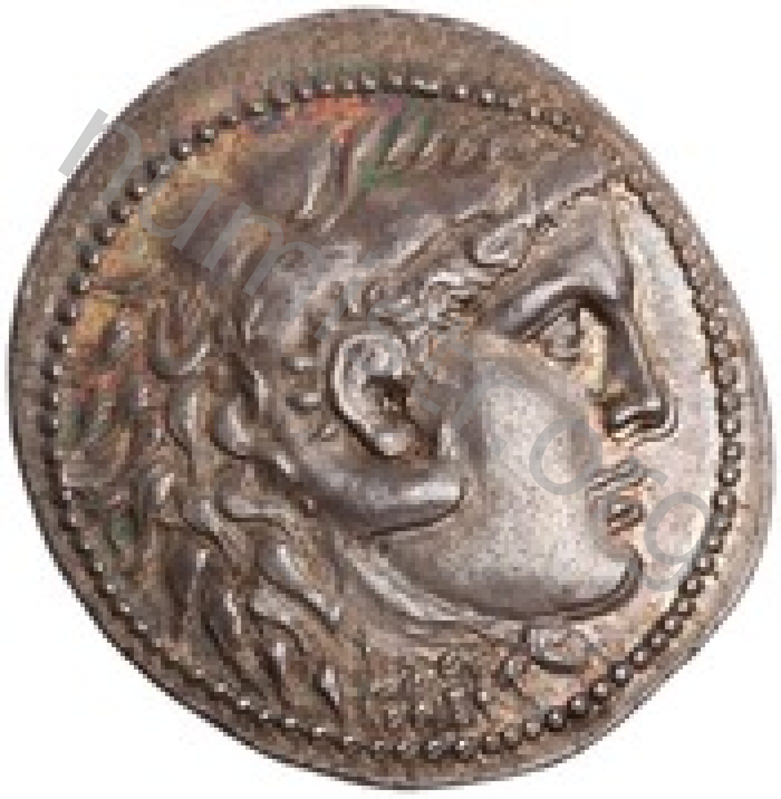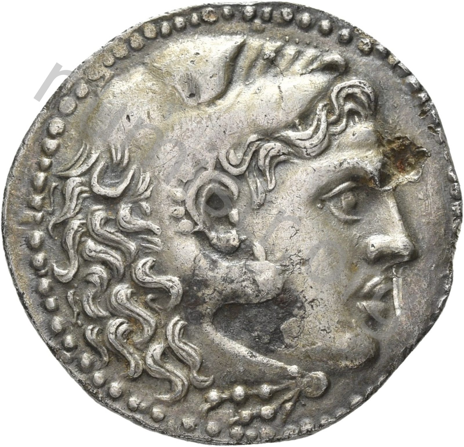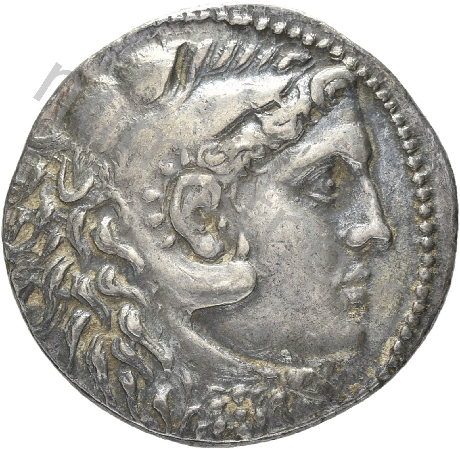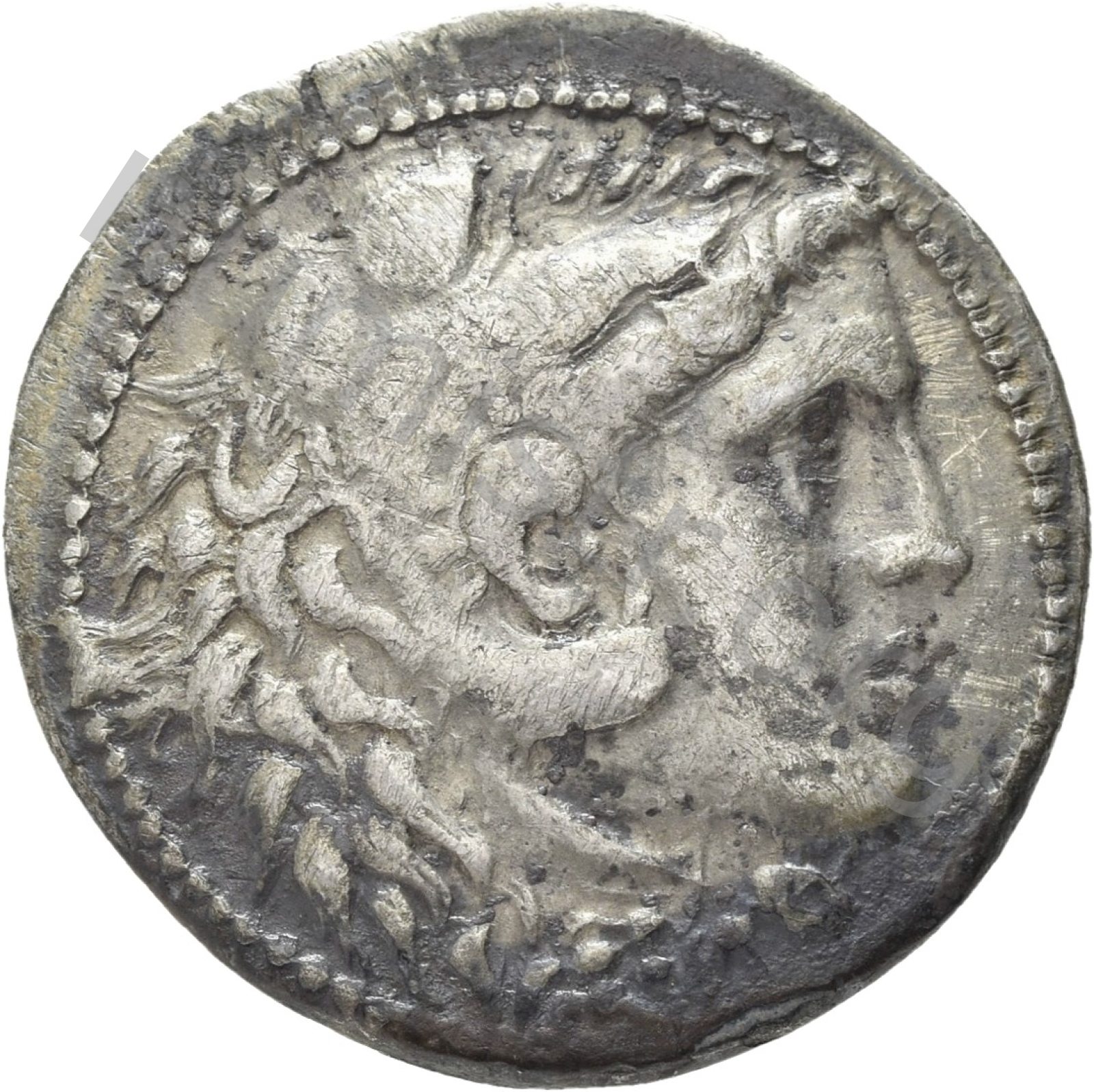 Head of beardless Heracles right wearing lion skin headdress -[en]