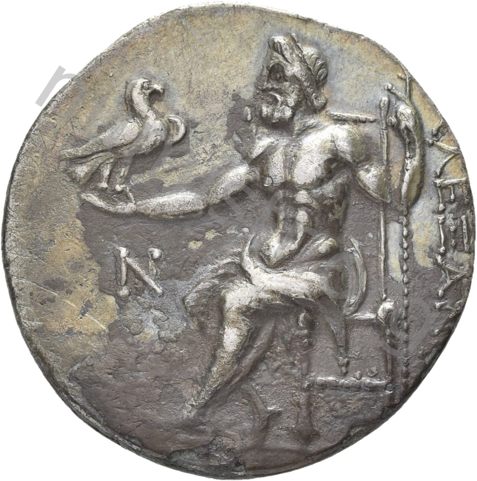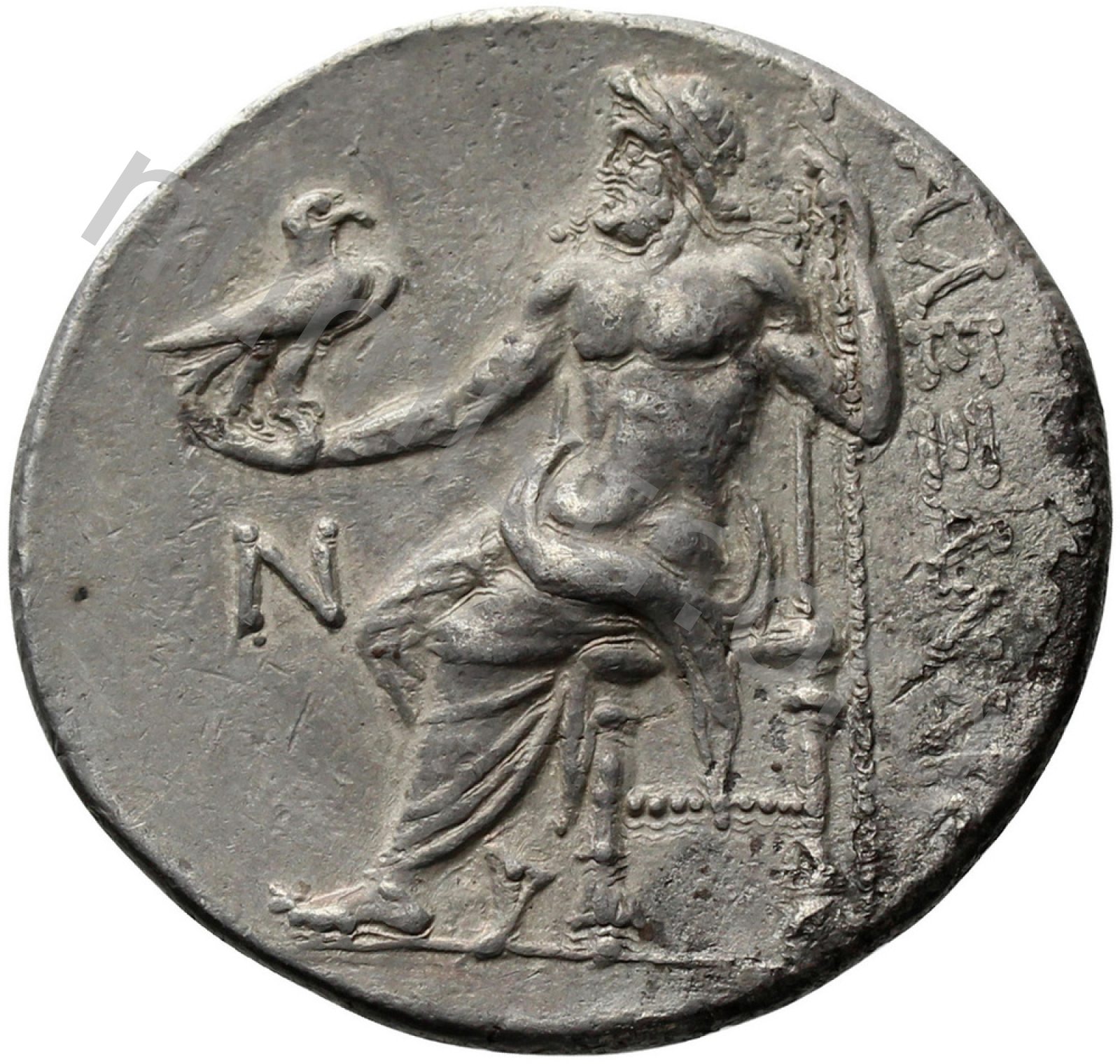 Zeus seated on stool-throne left eagle on outstretched right hand sceptre in left hand -[en]