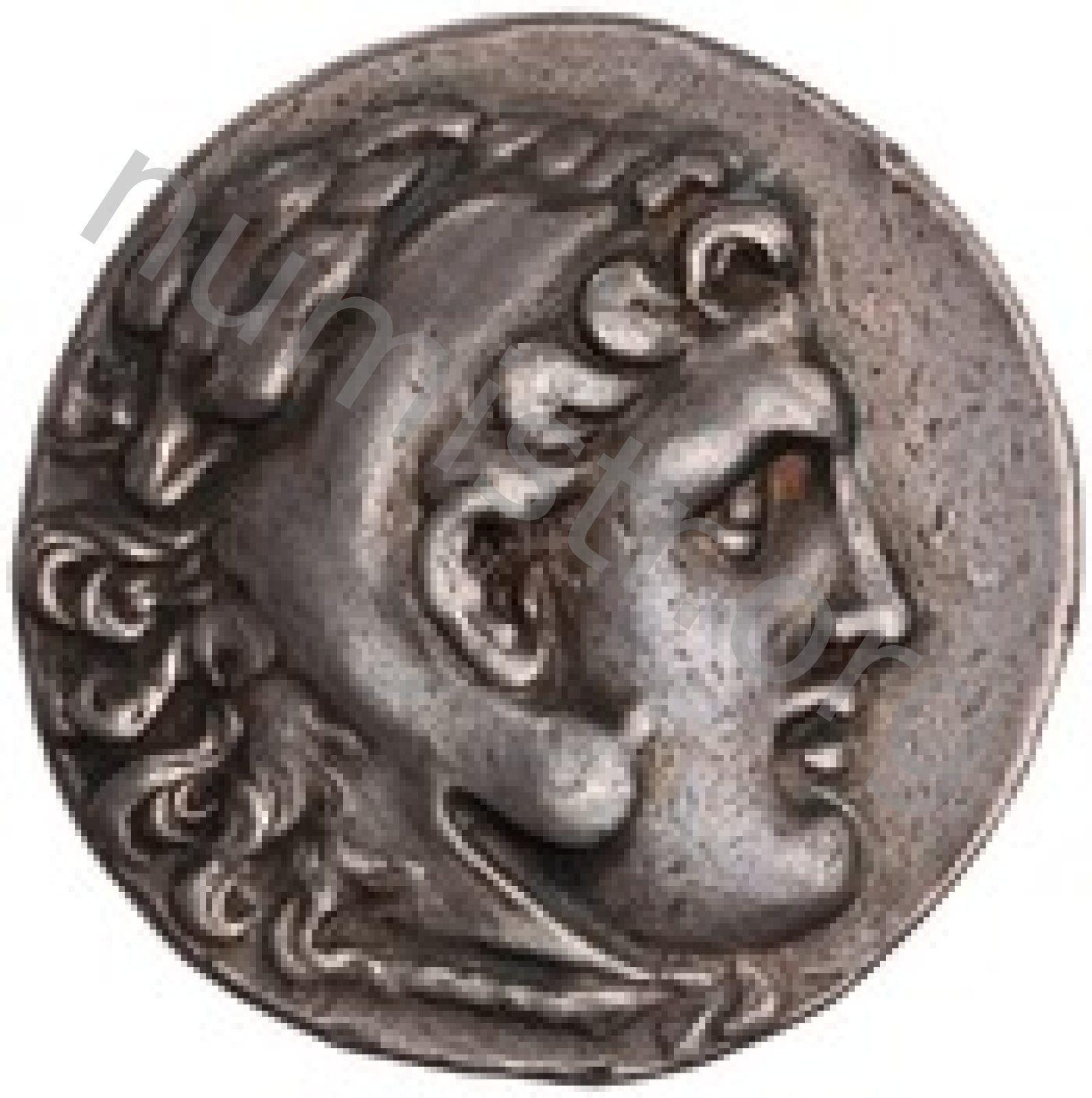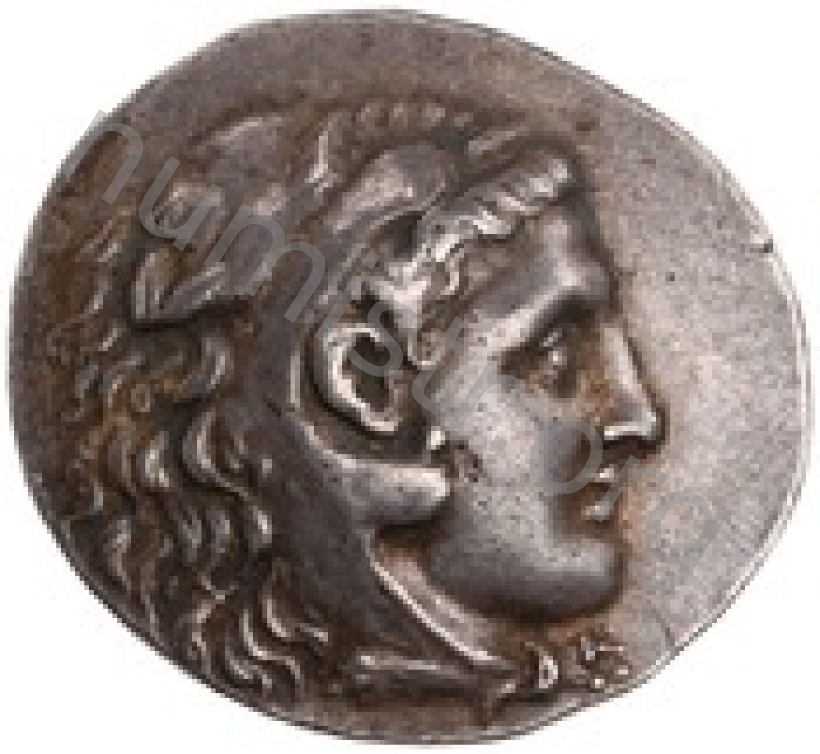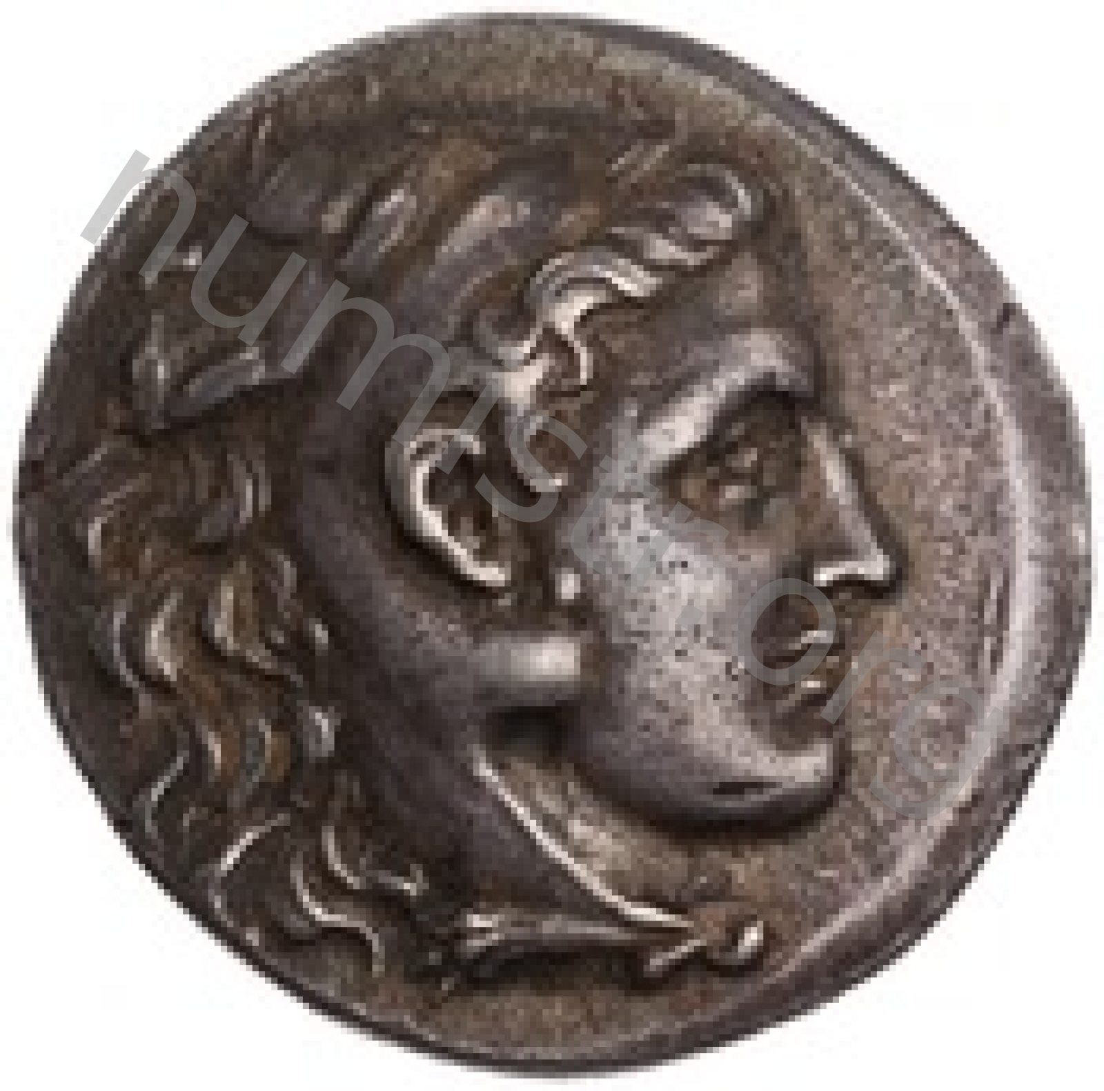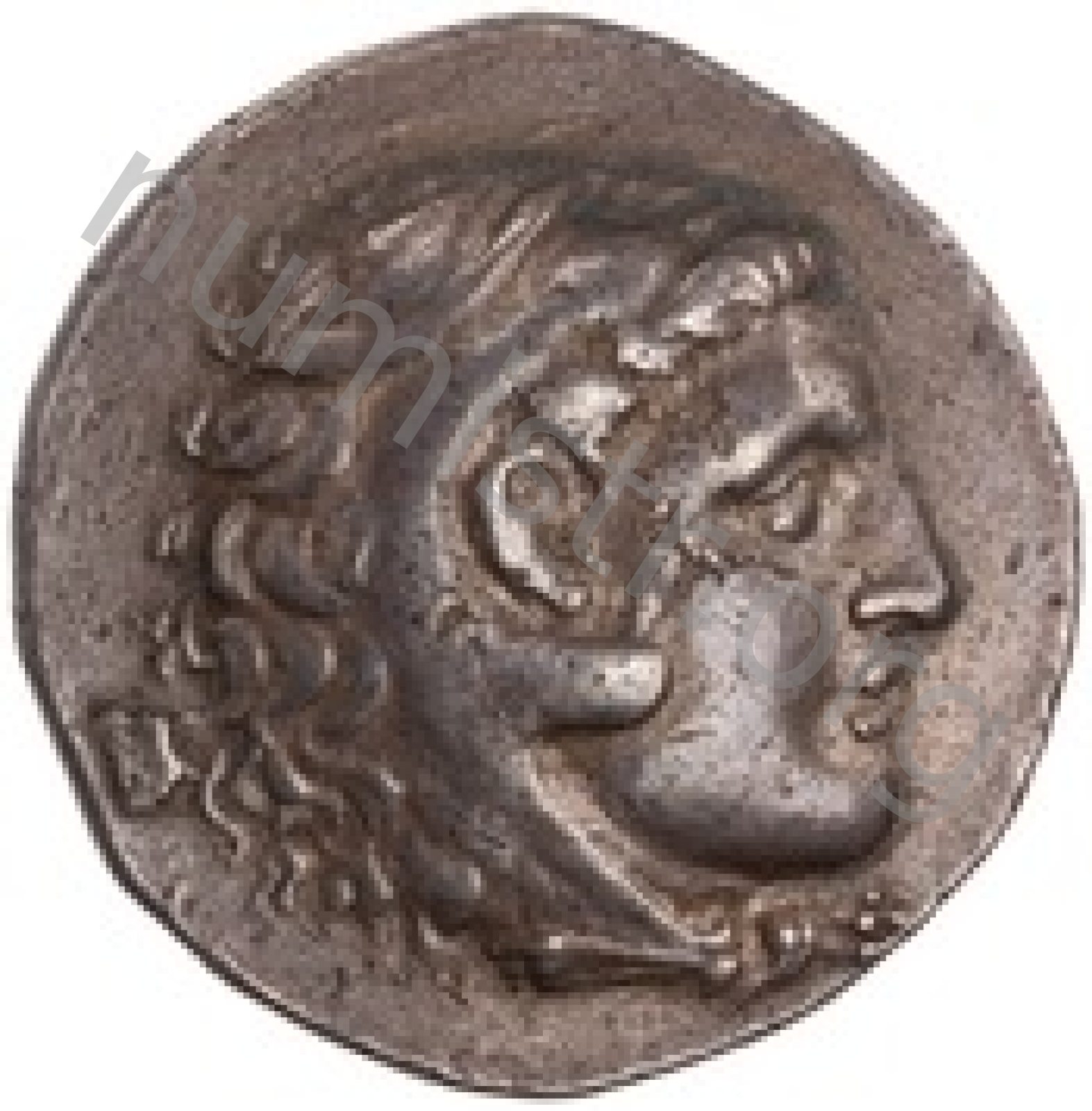 Head of beardless Heracles right wearing lion skin headdress -[en]