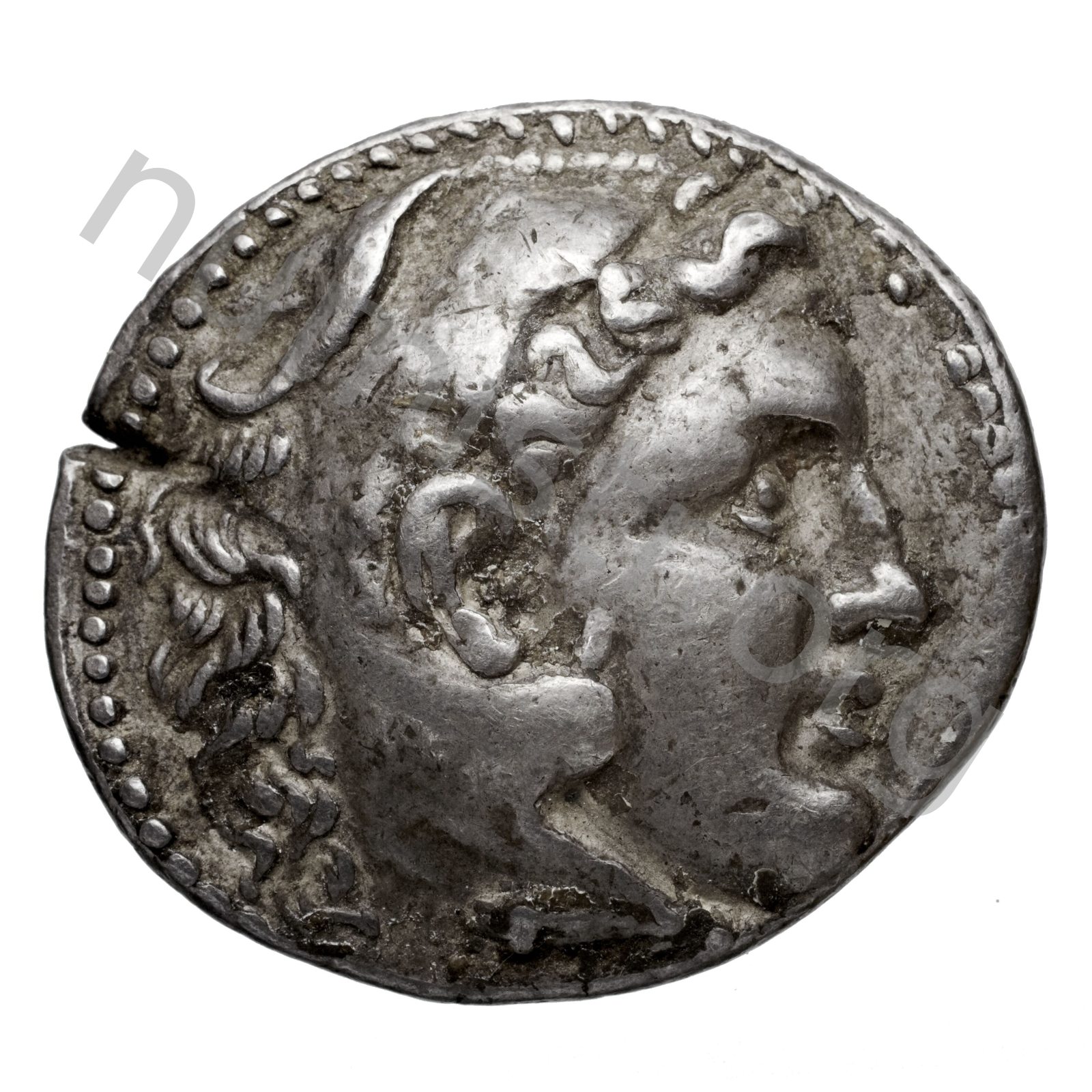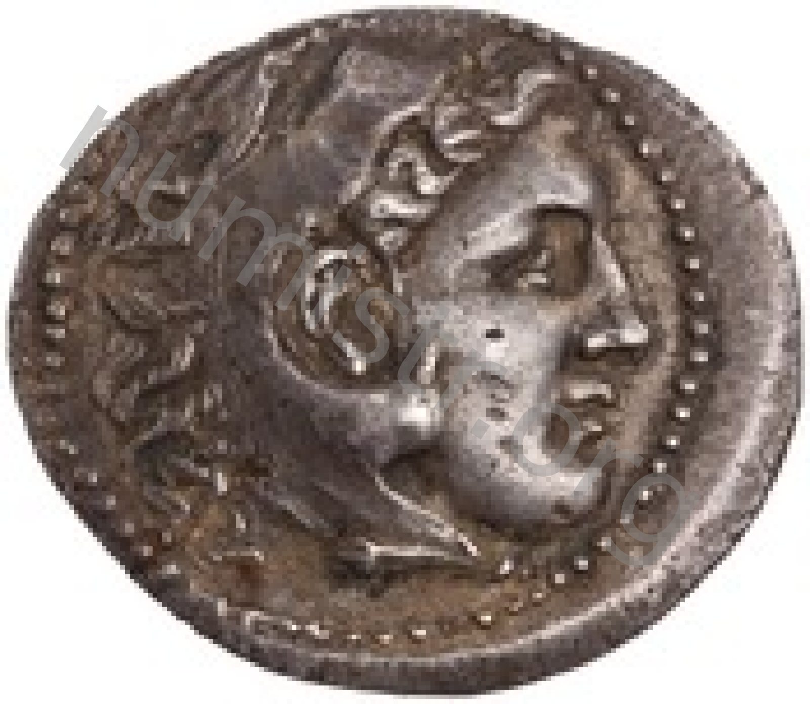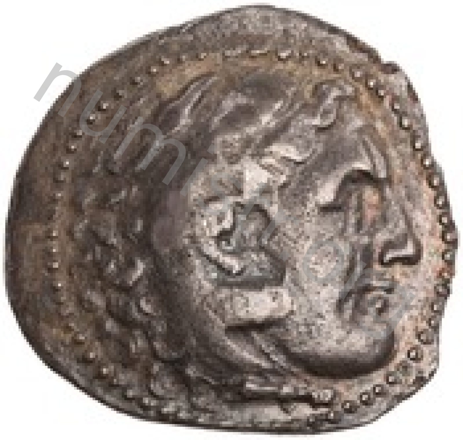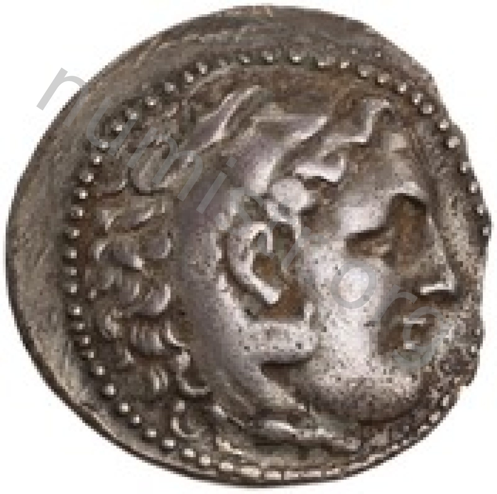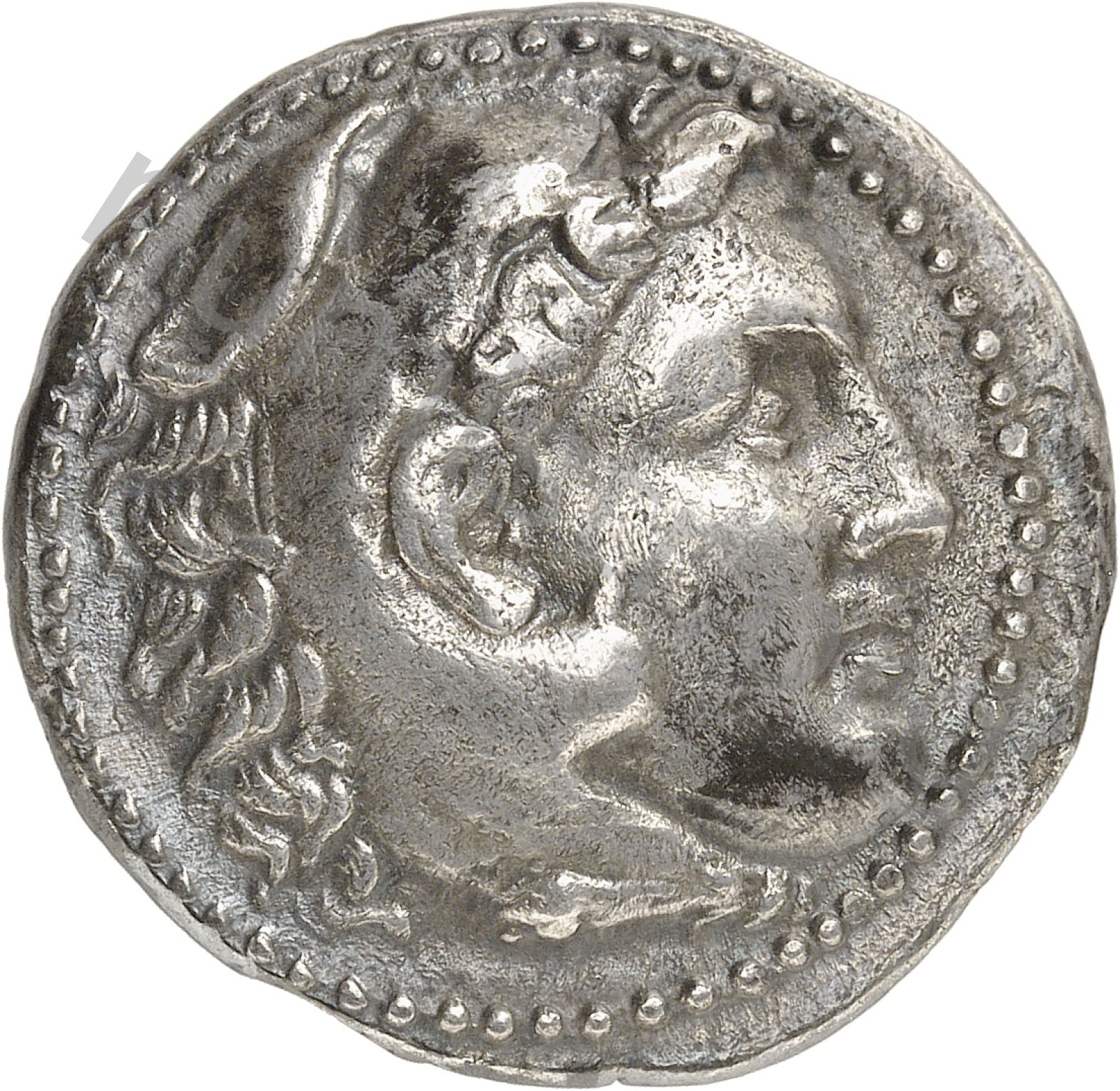 Head of beardless Heracles right wearing lion skin headdress -[en]