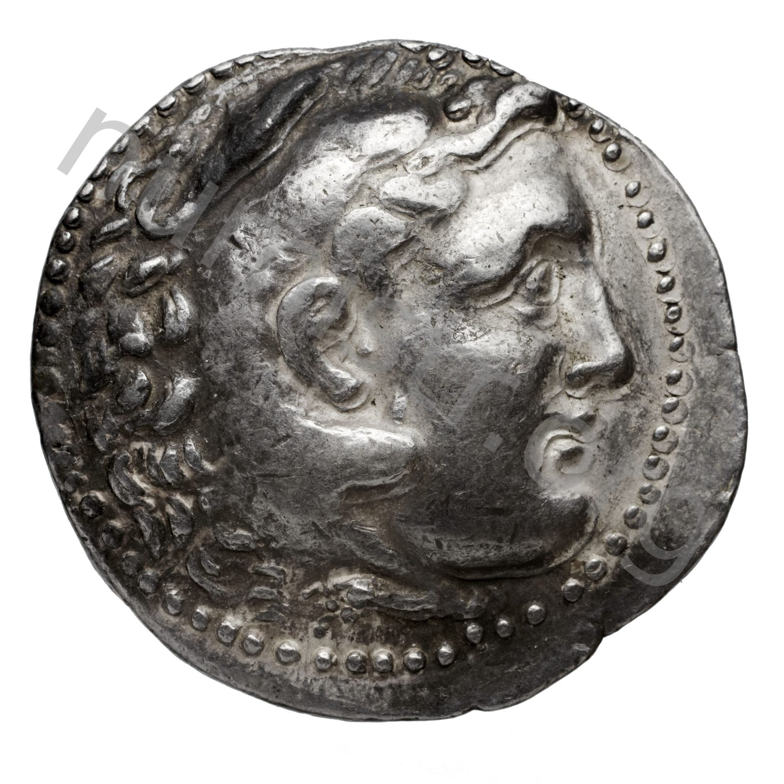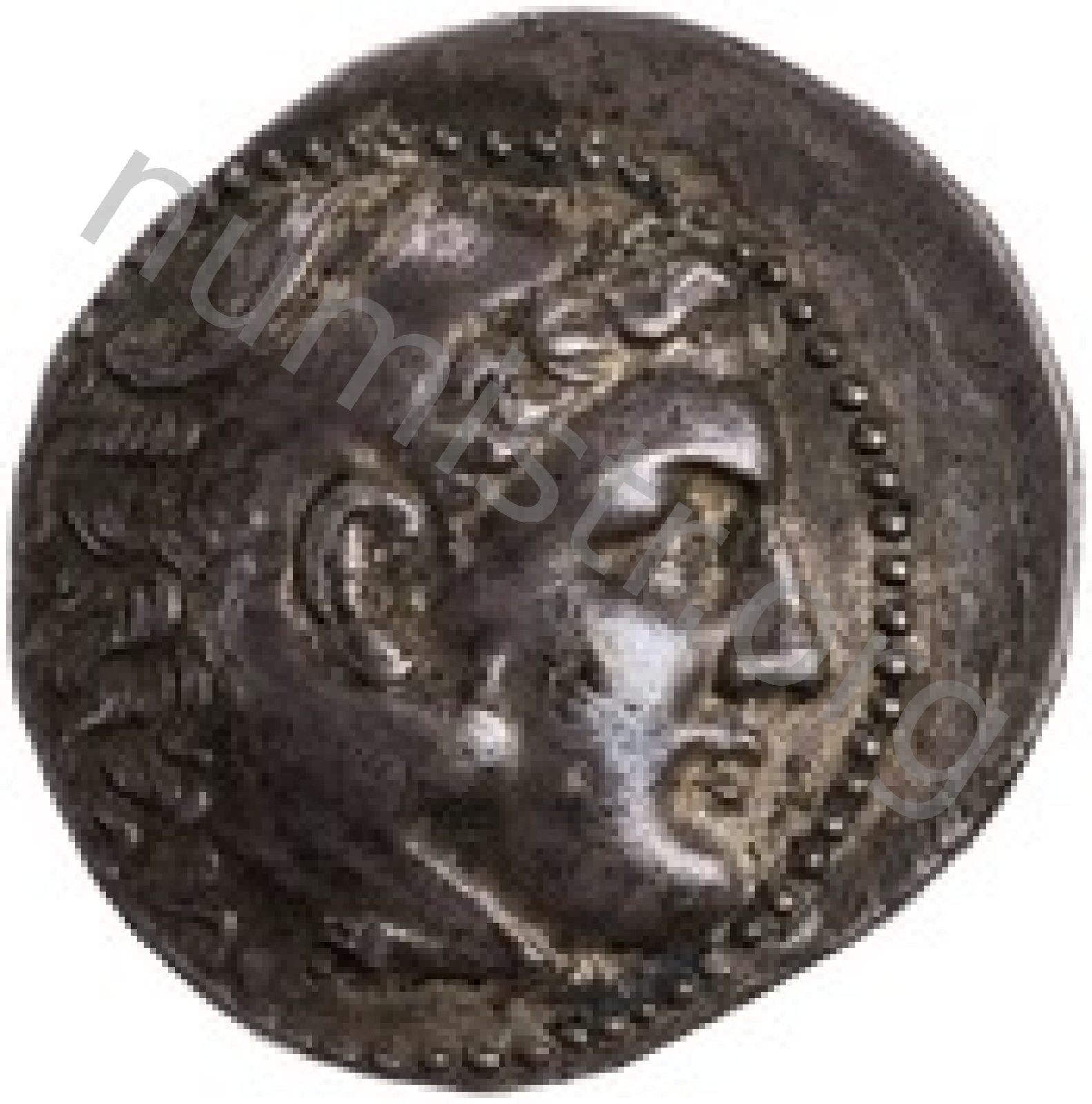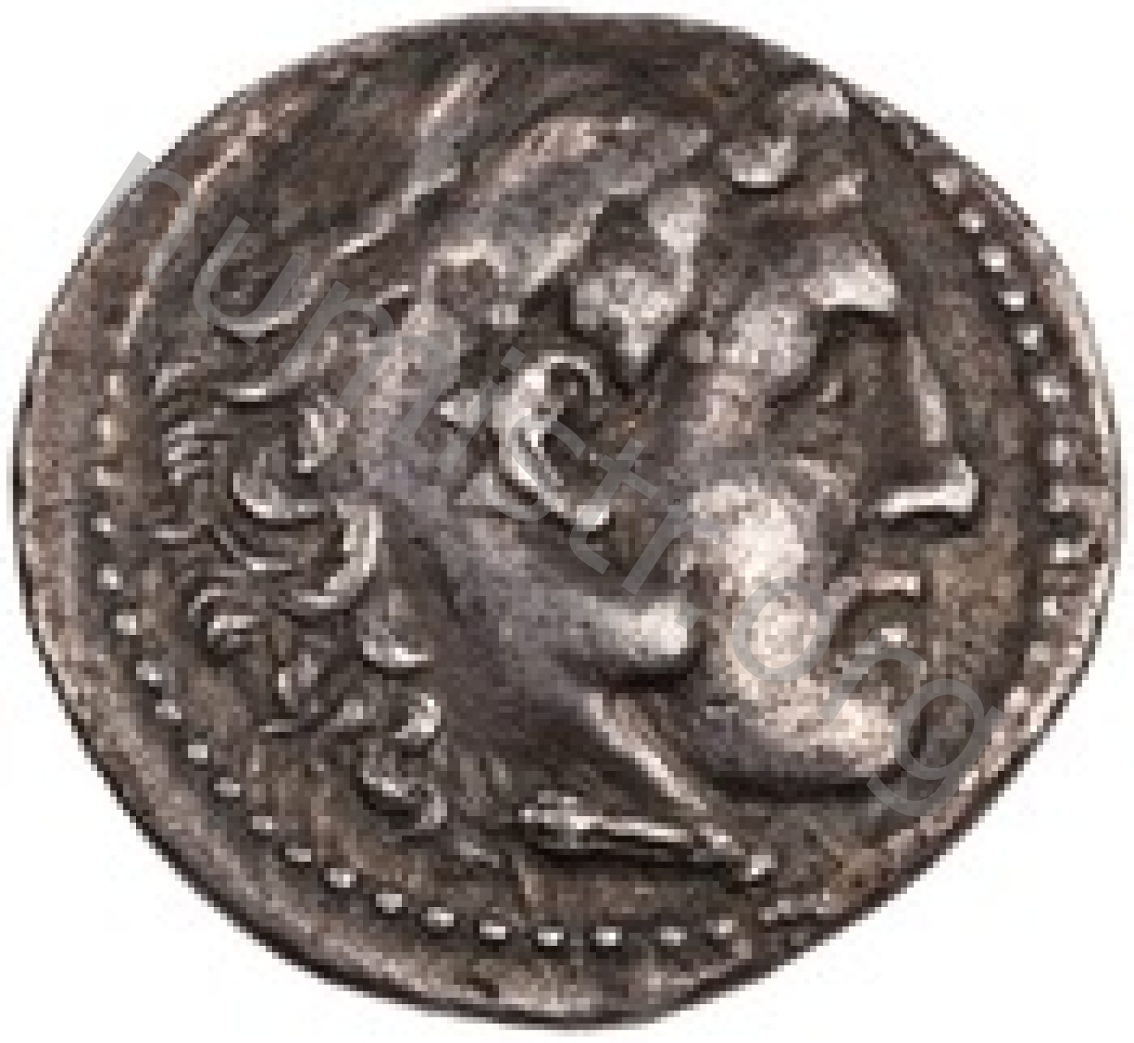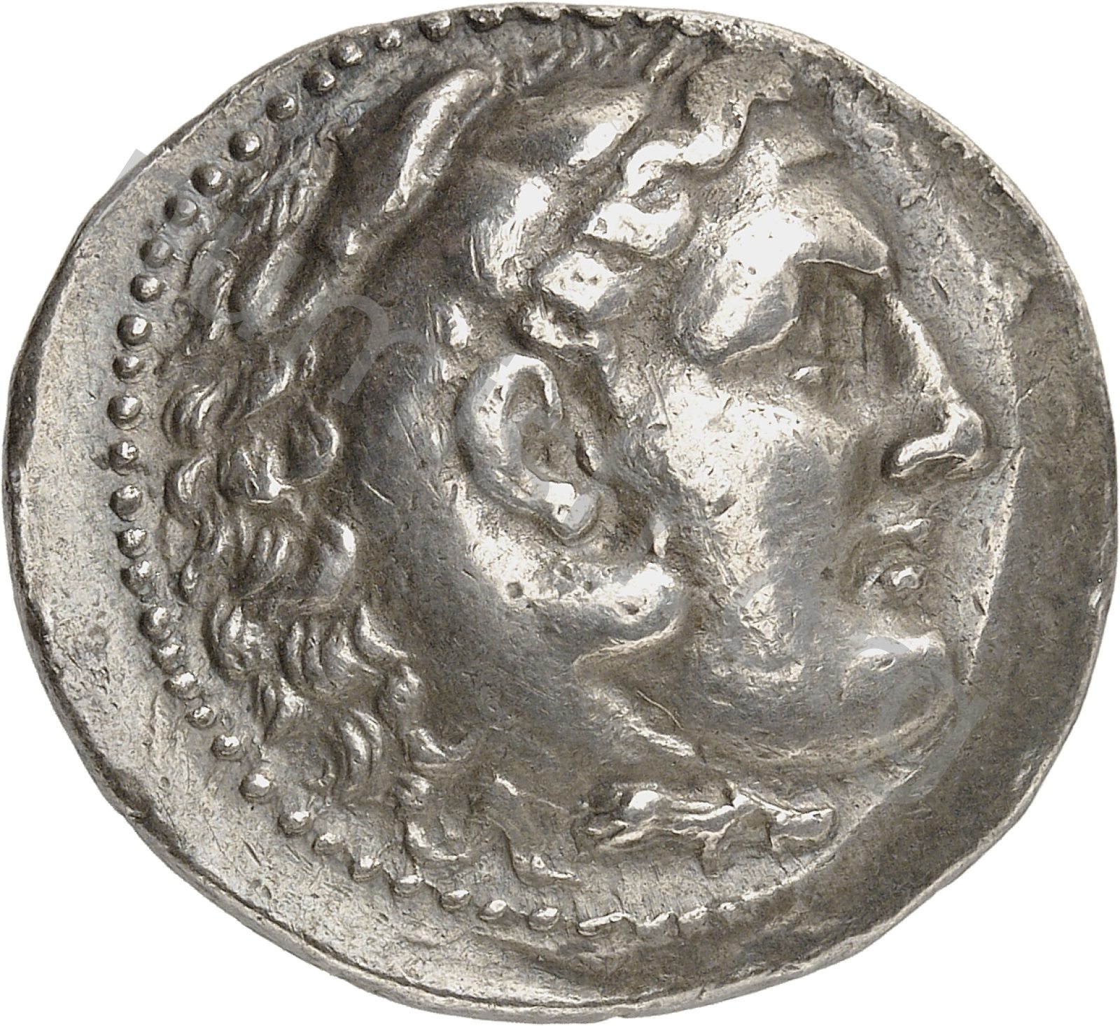 Head of beardless Heracles right wearing lion skin headdress -[en]