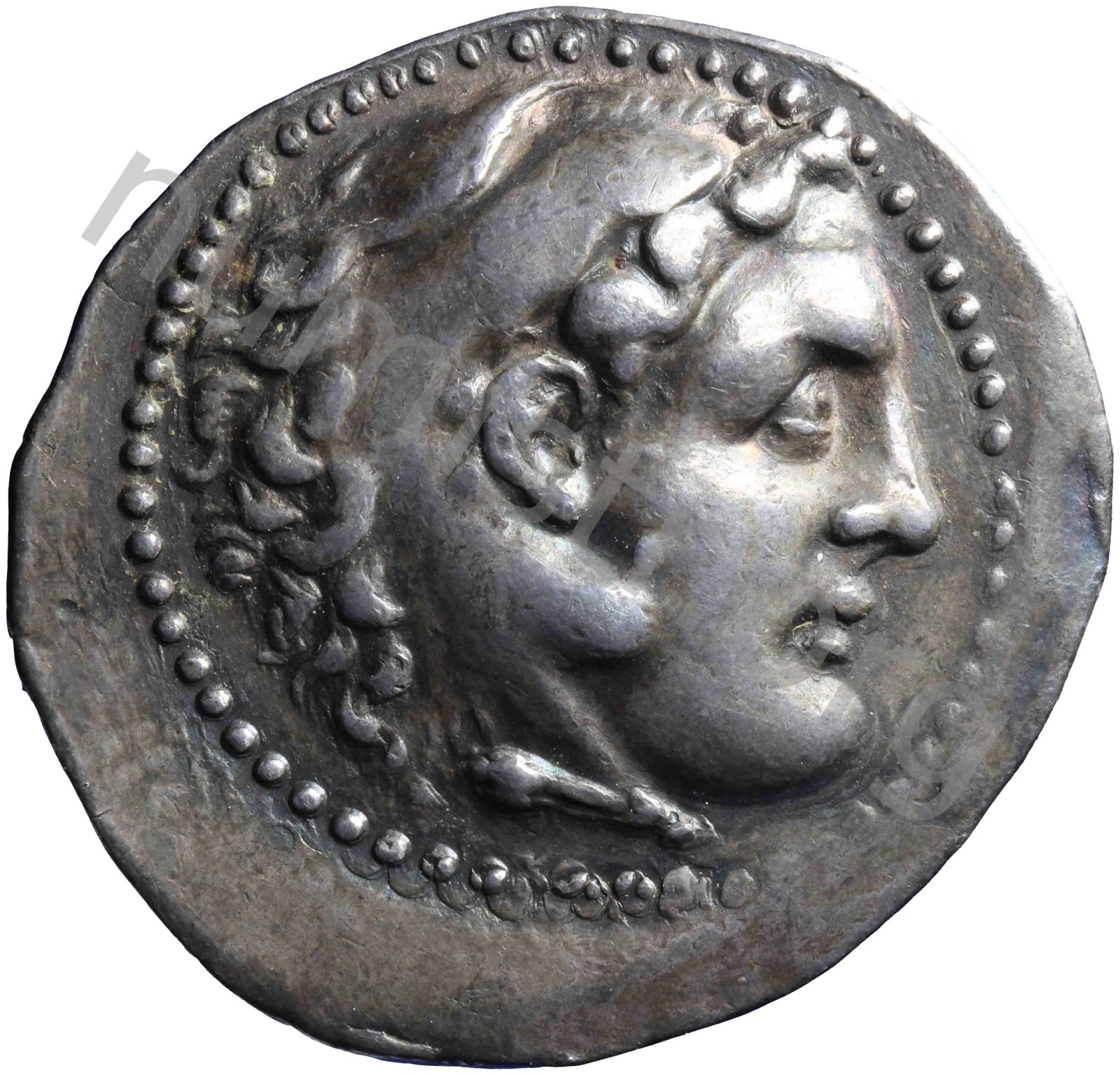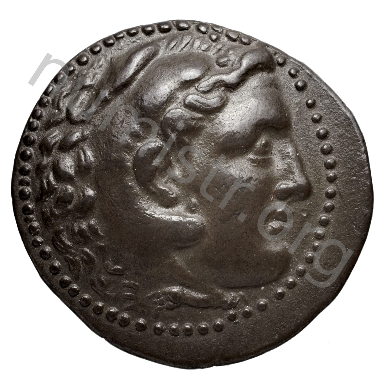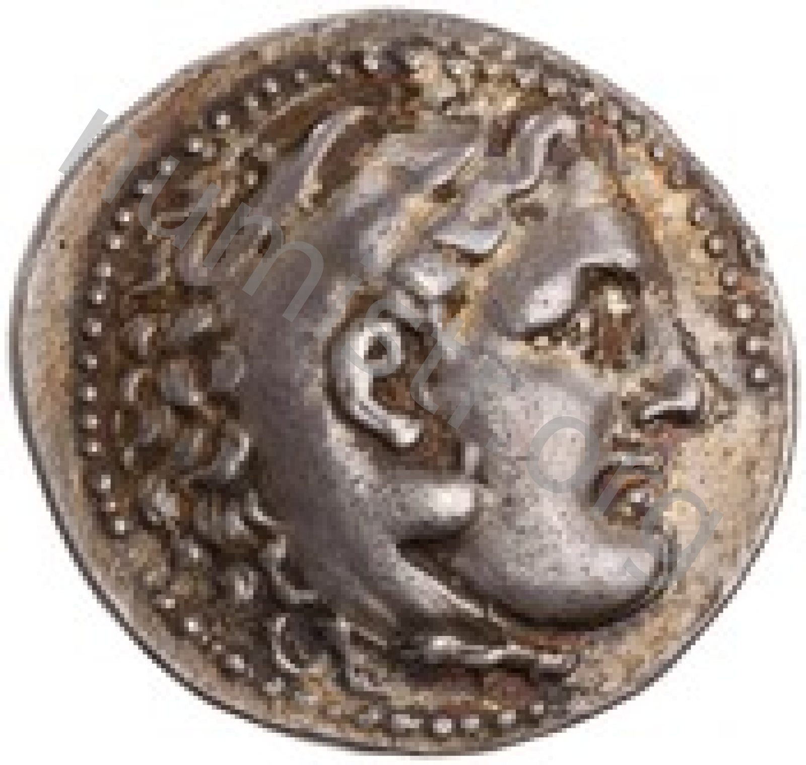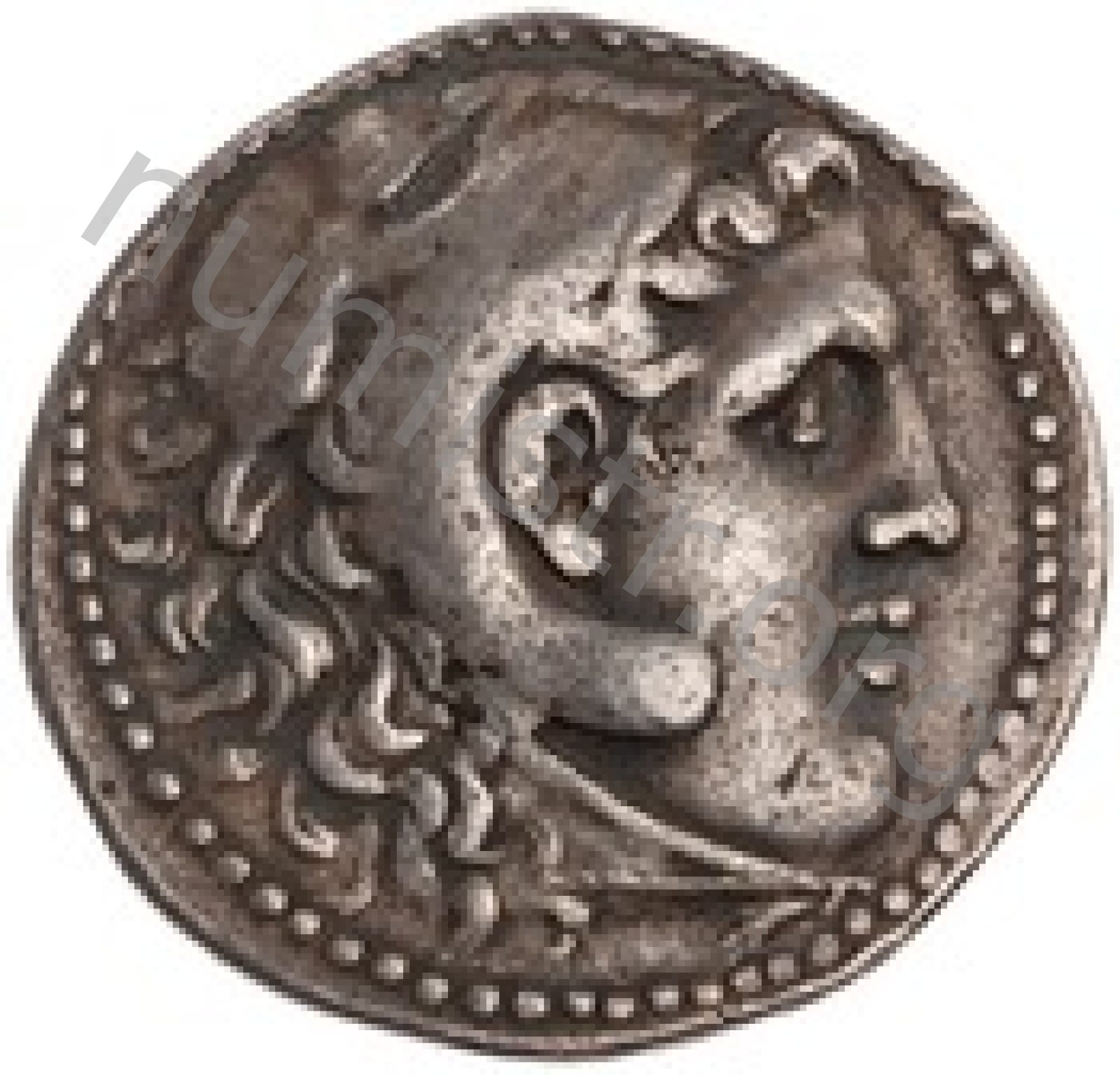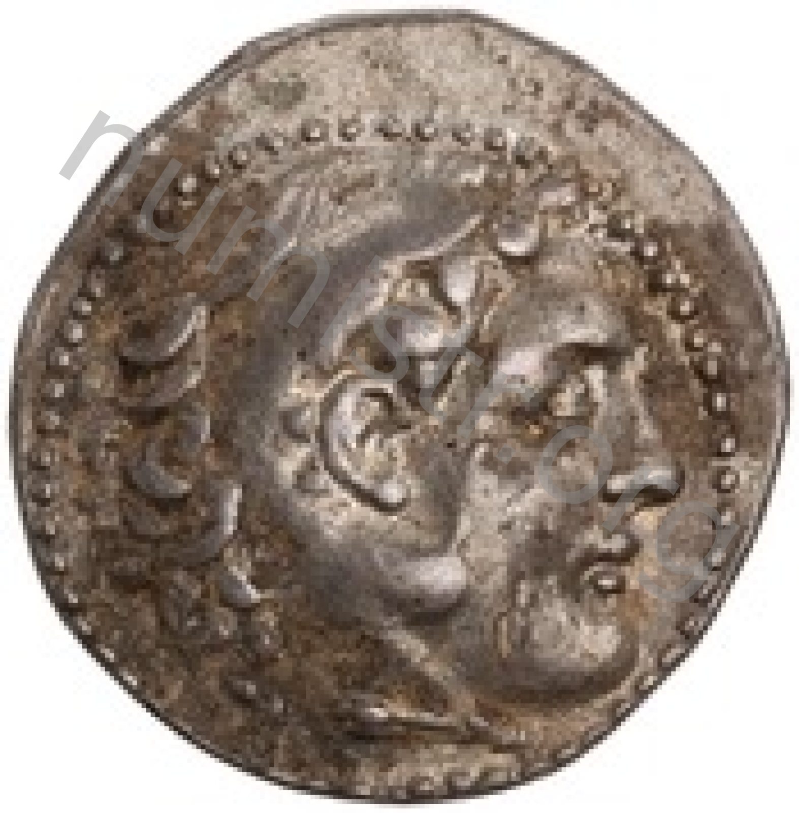 Head of beardless Heracles right wearing lion skin headdress -[en]
