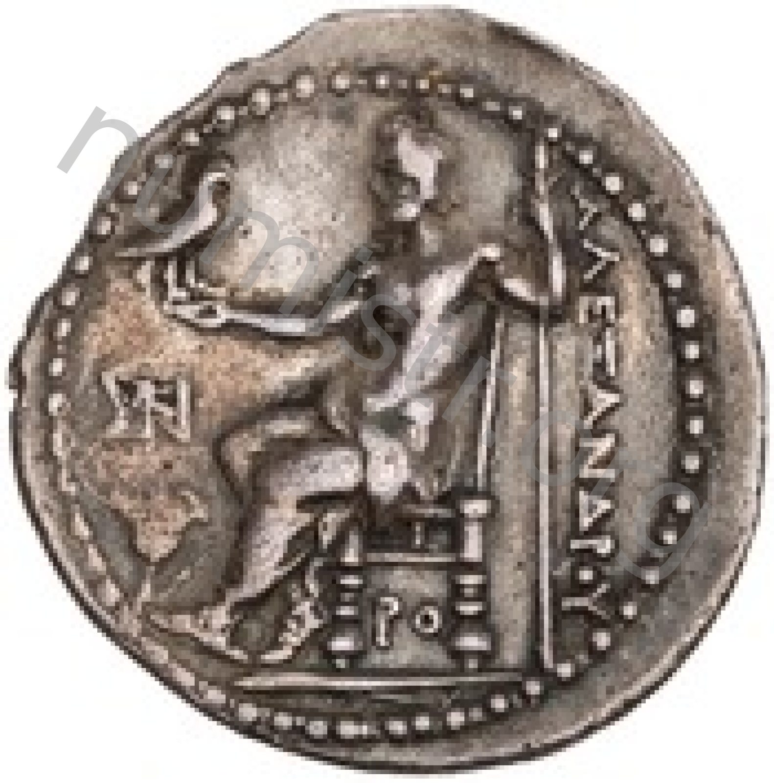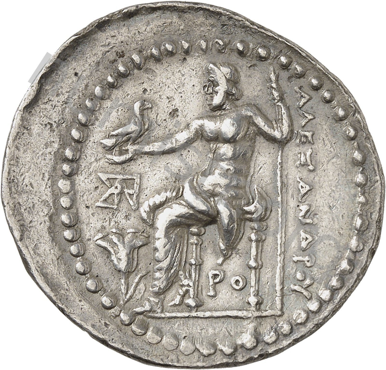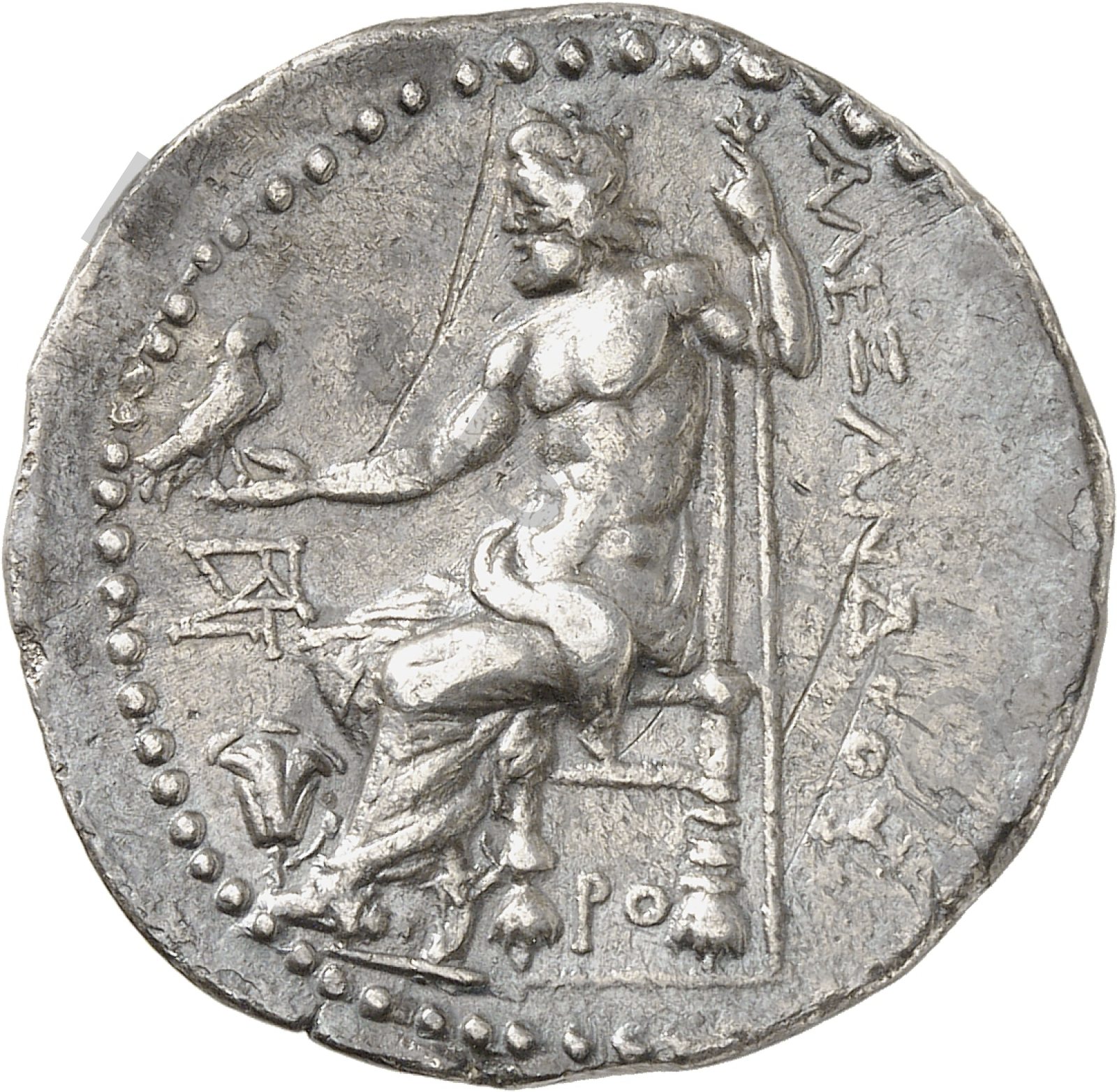 Zeus seated on stool-throne left eagle on outstretched right hand sceptre in left hand -[en]
