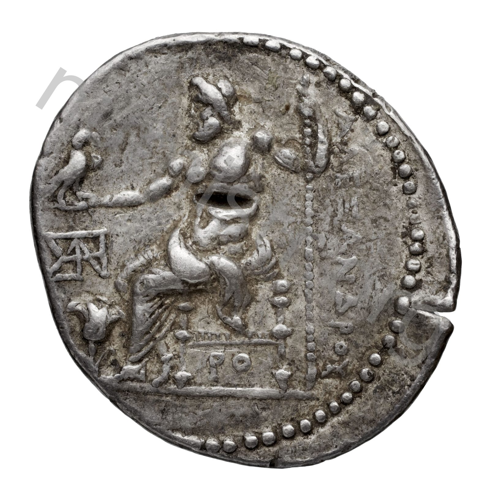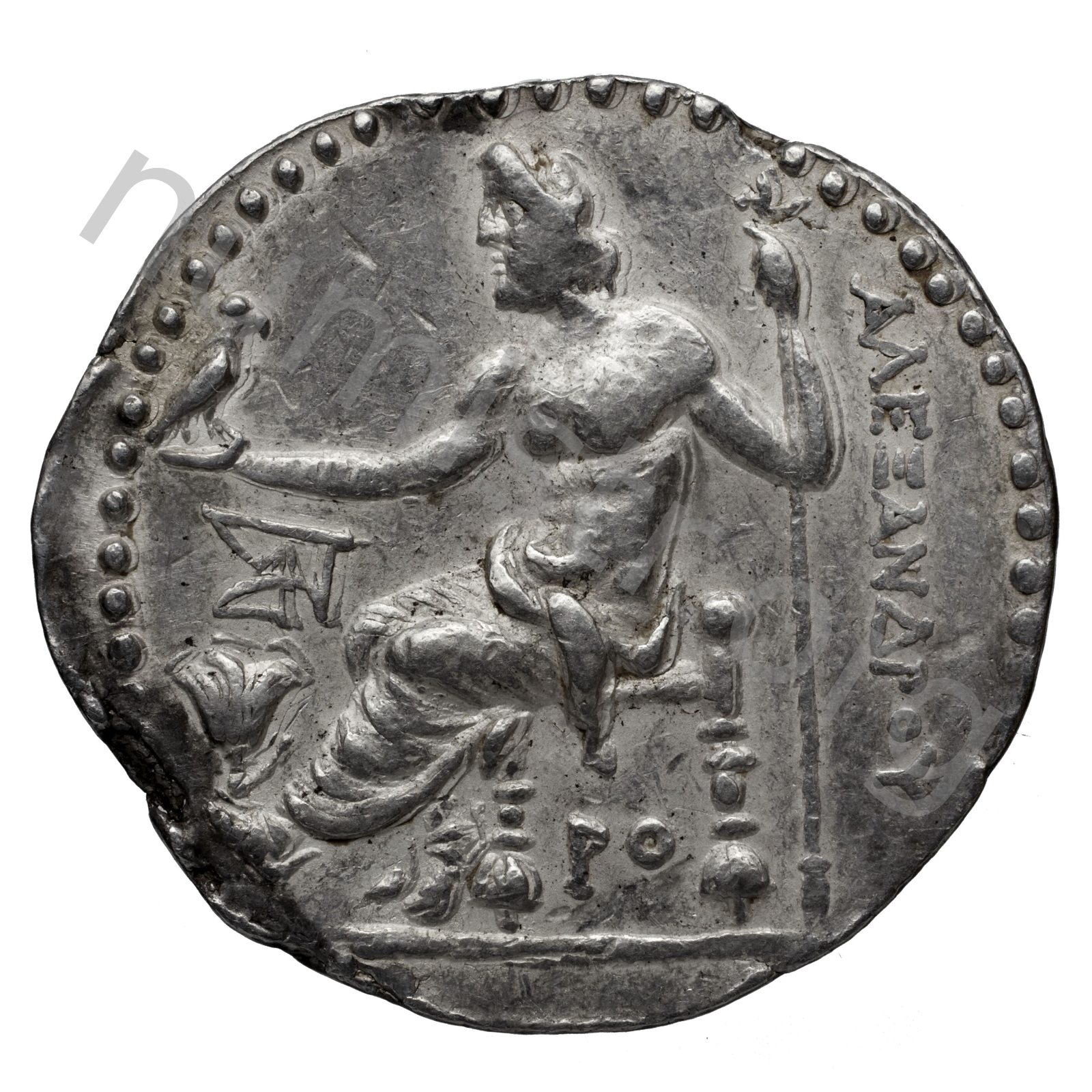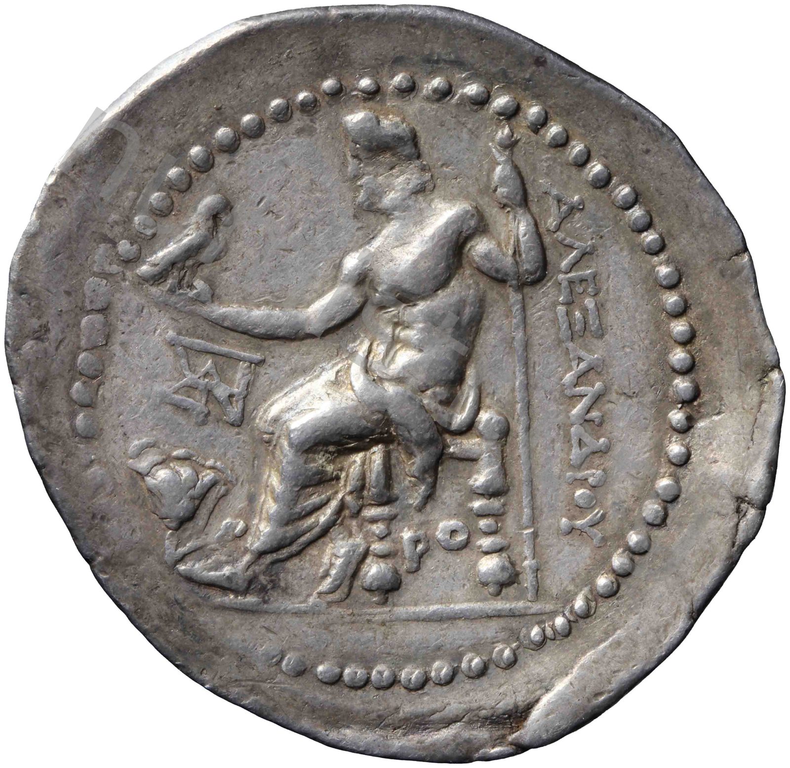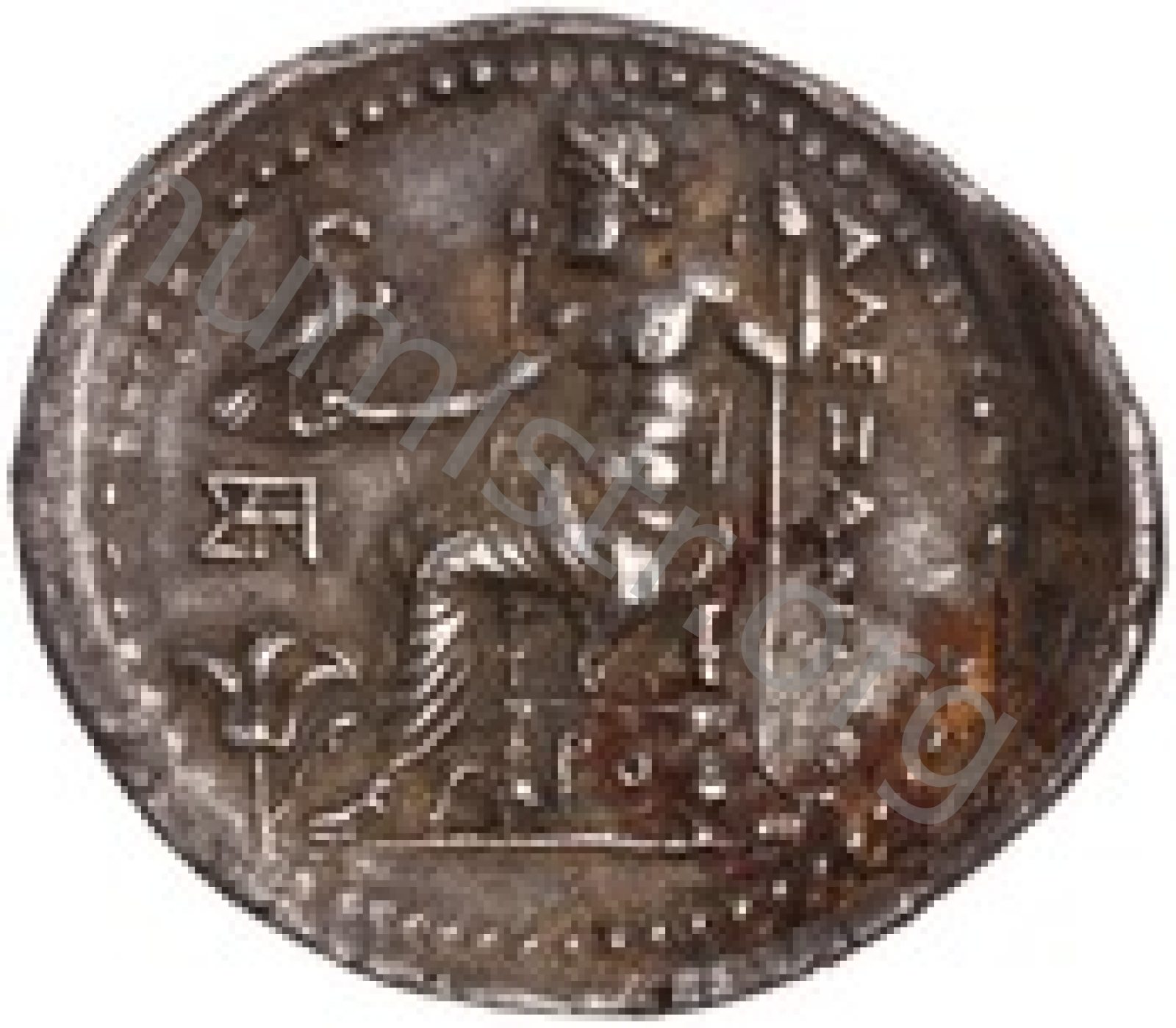 Zeus seated on stool-throne left eagle on outstretched right hand sceptre in left hand -[en]