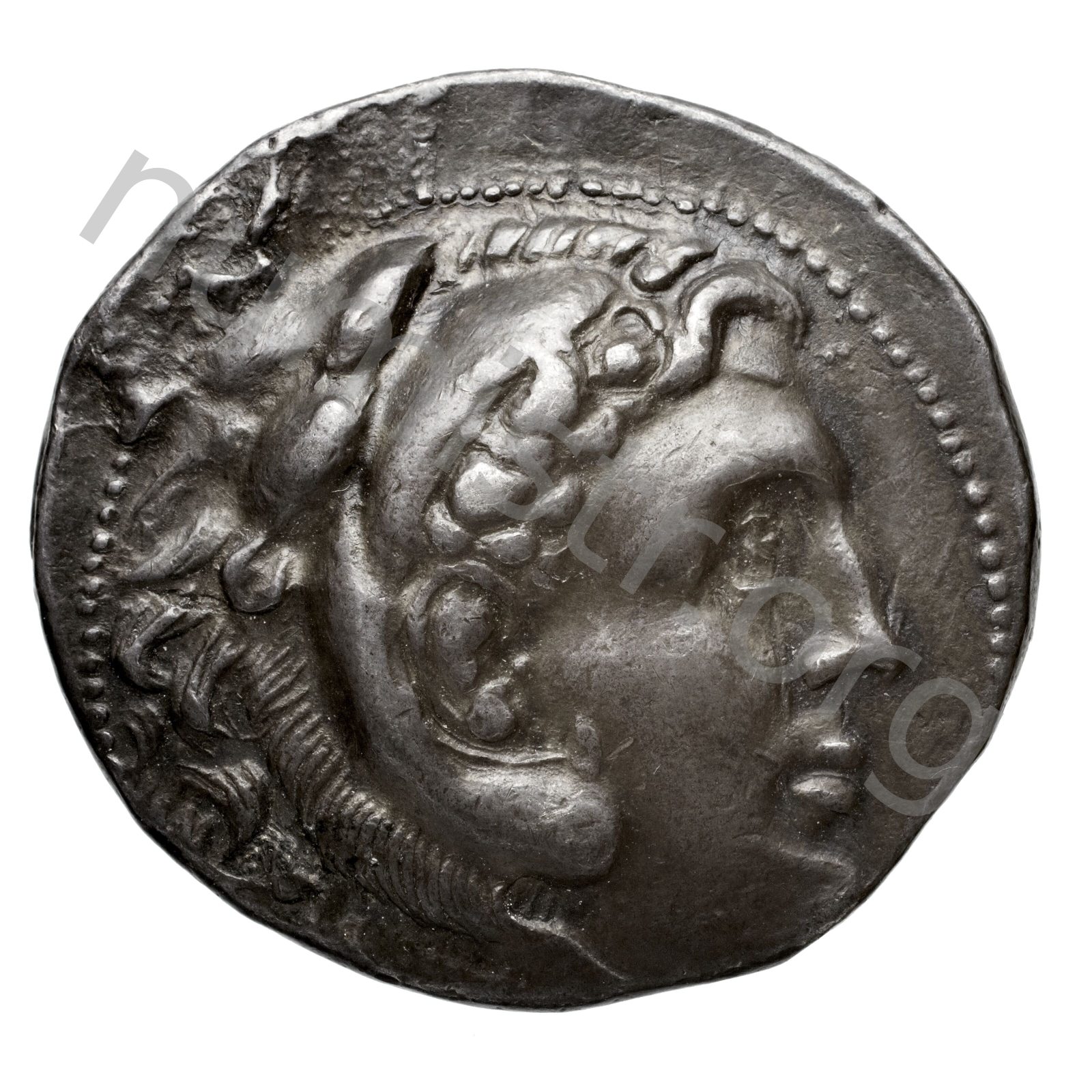 Head of beardless Heracles right wearing lion skin headdress -[en]