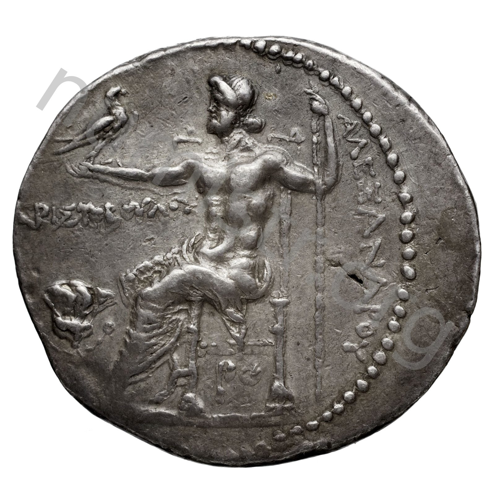 Zeus tabure-tahtta oturuyor sol elinde kartal sağ elinde asa var.