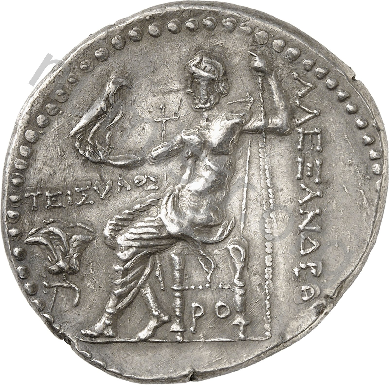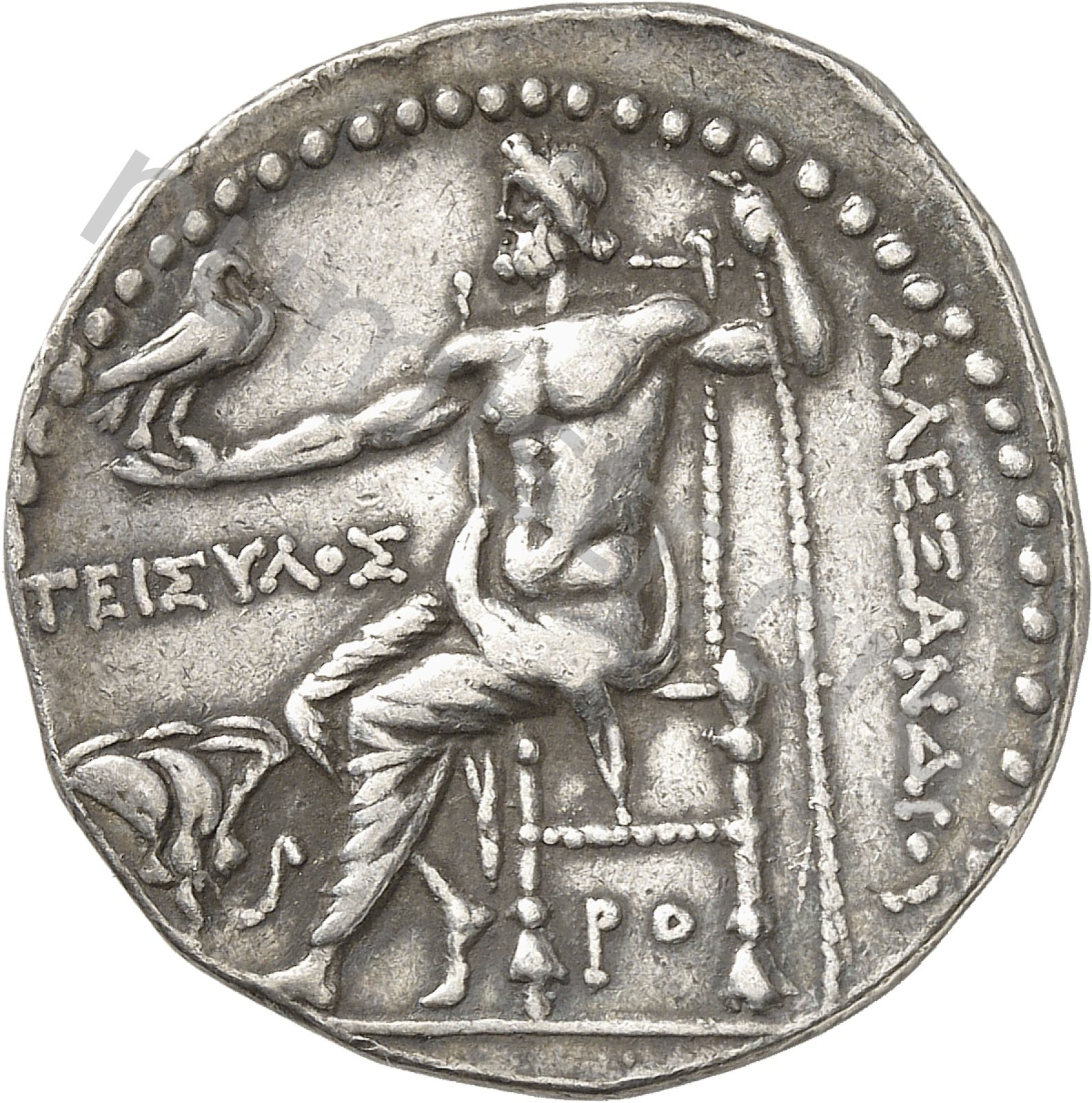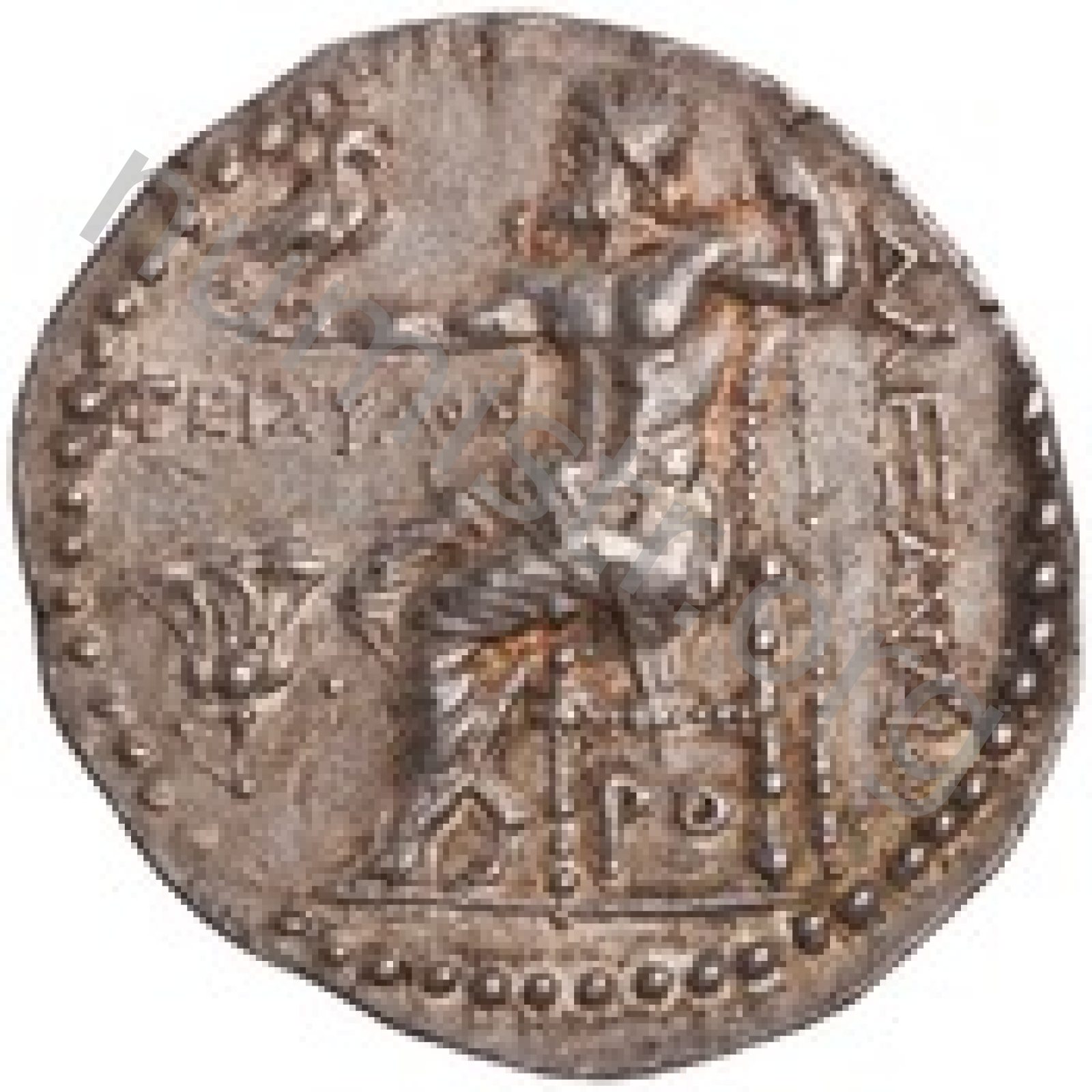 Zeus seated on stool-throne left eagle on outstretched right hand sceptre in left hand -[en]