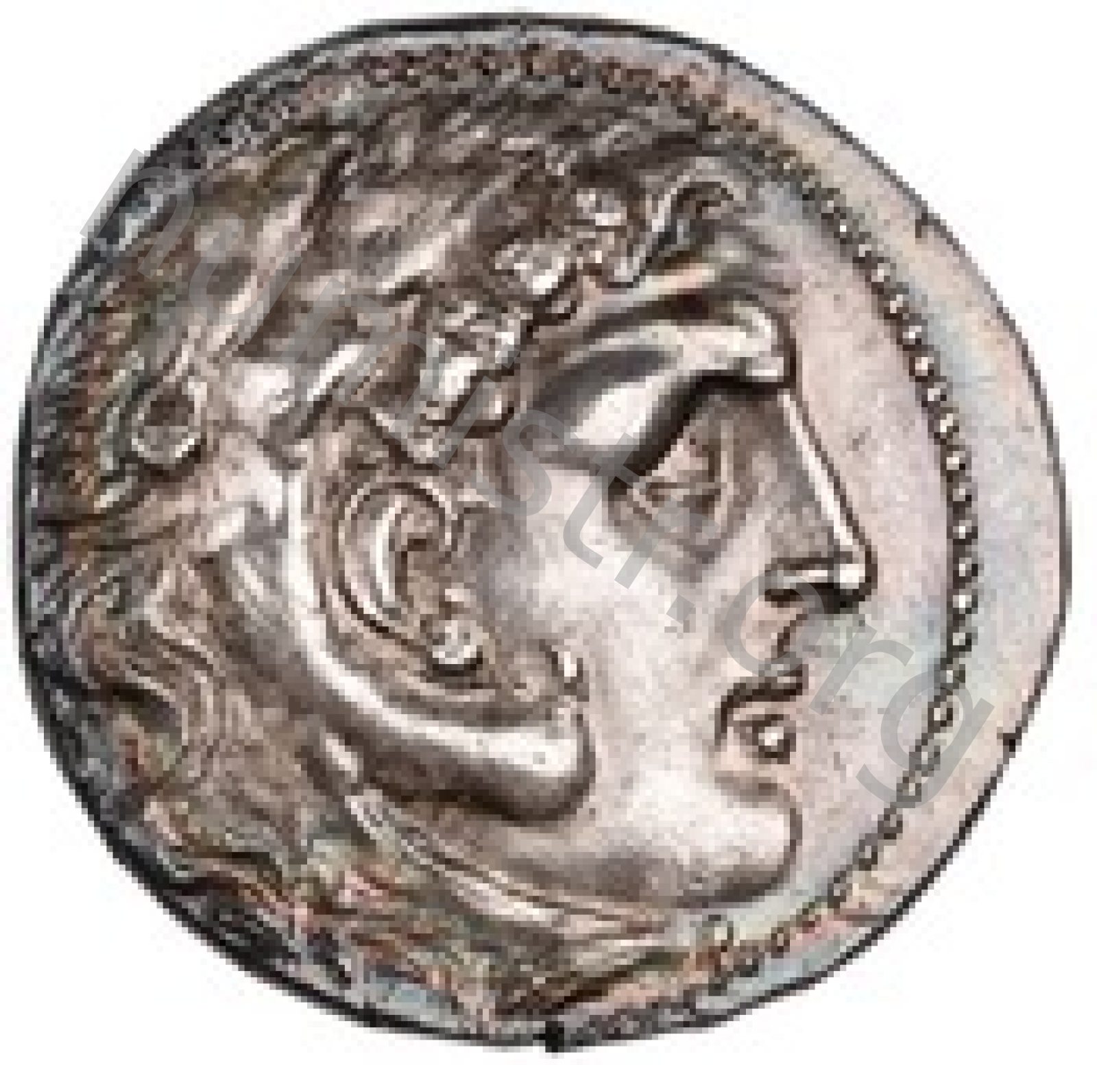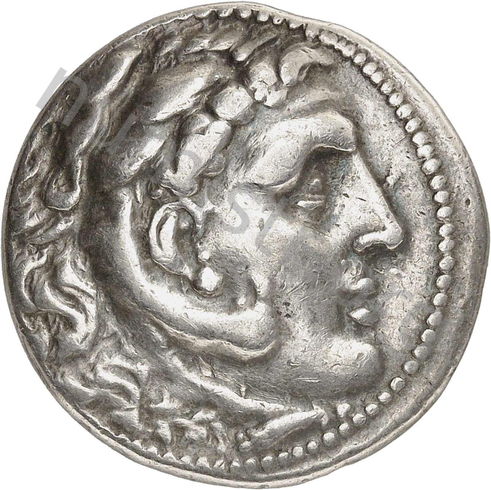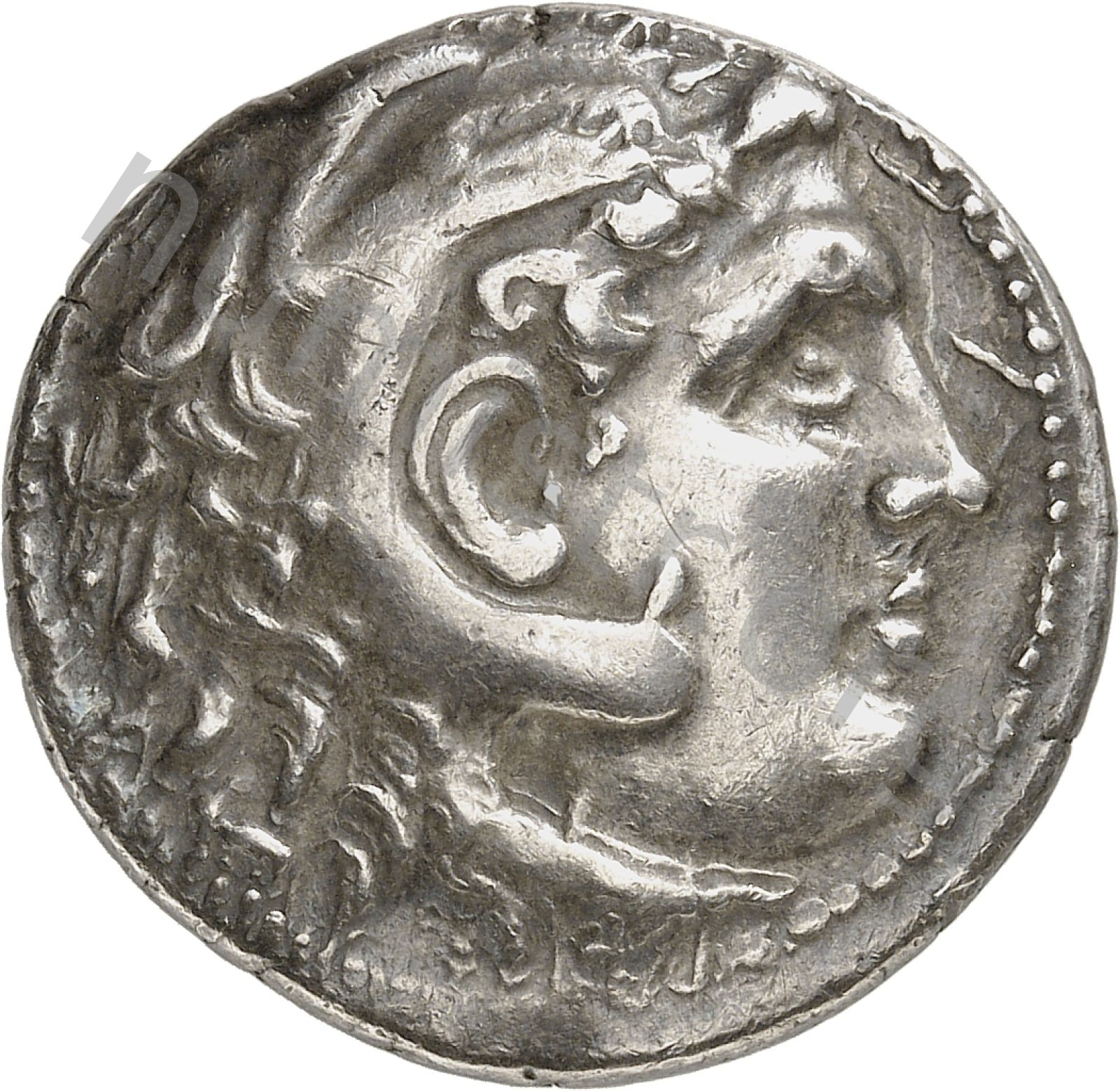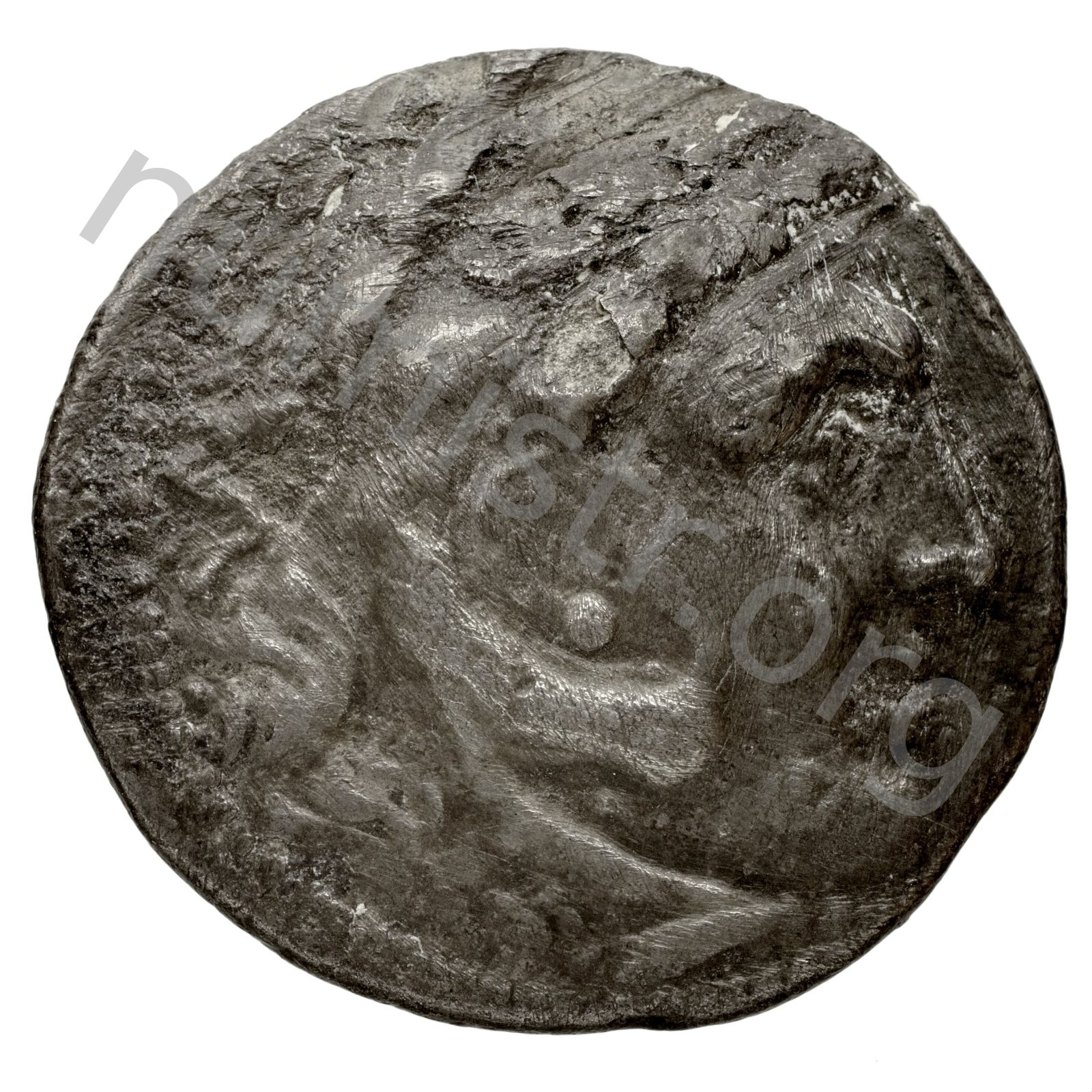 Head of beardless Heracles right wearing lion skin headdress -[en]