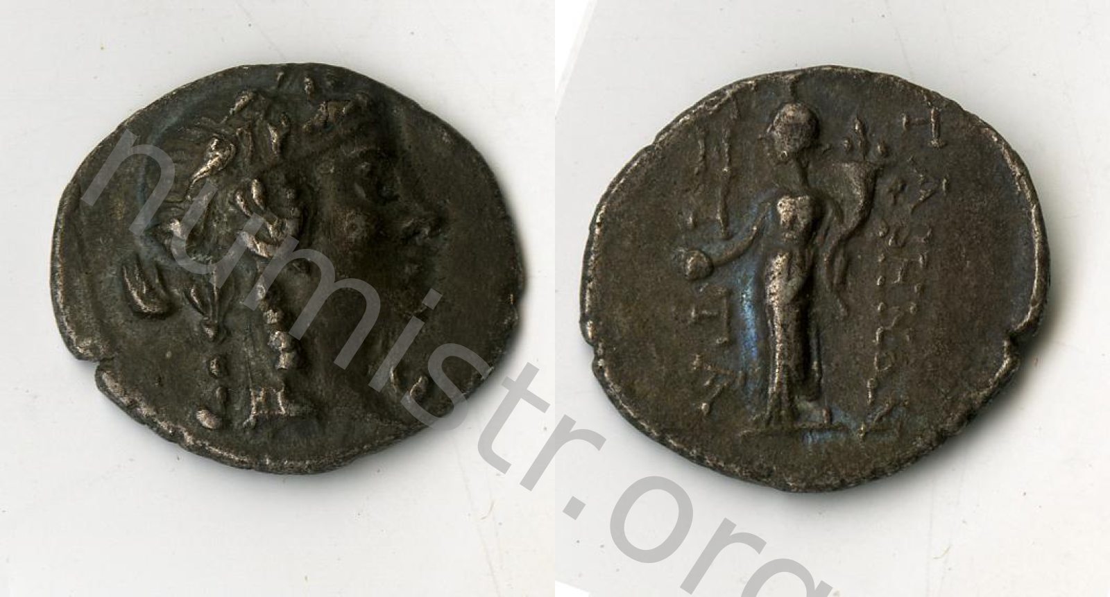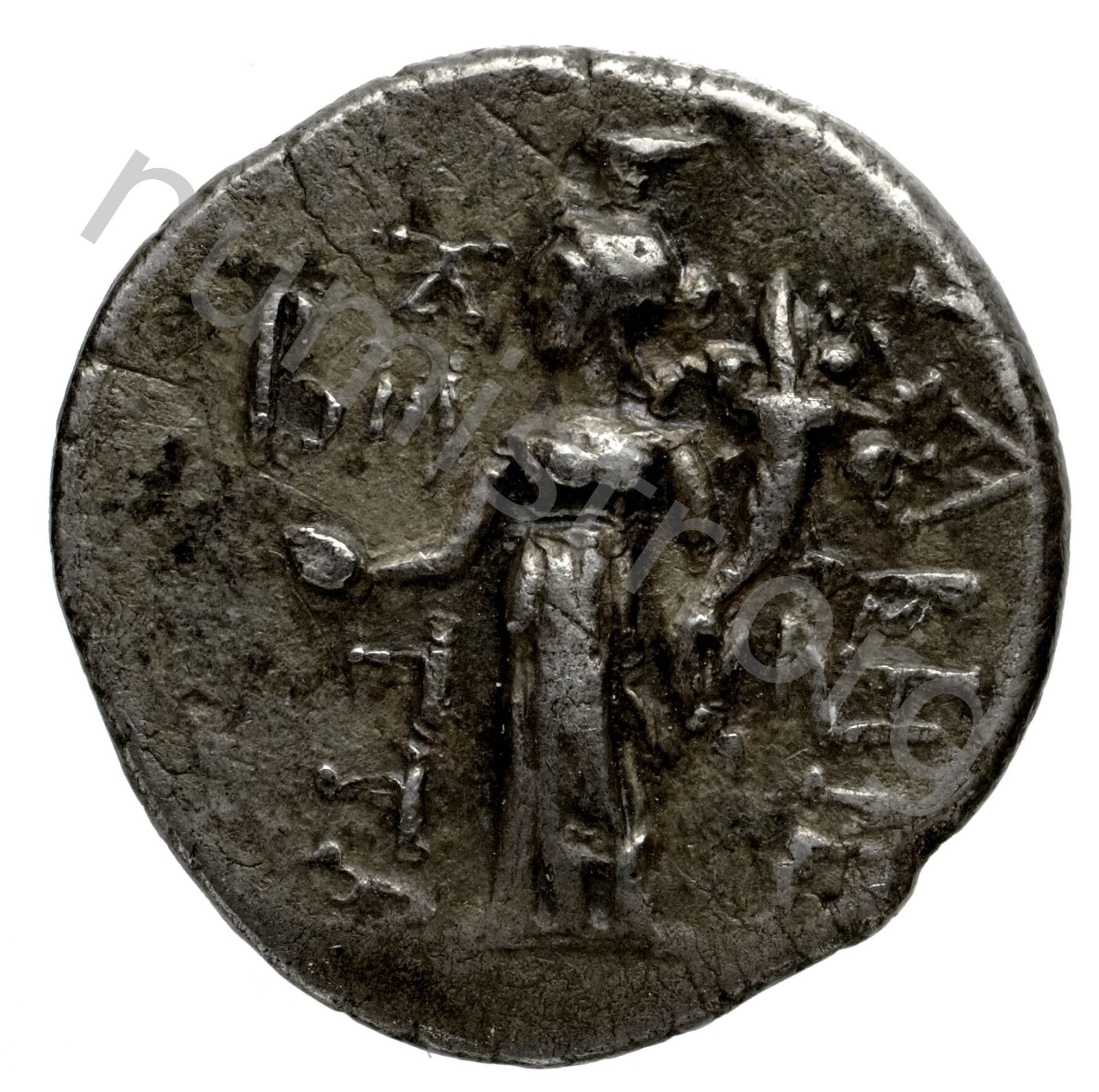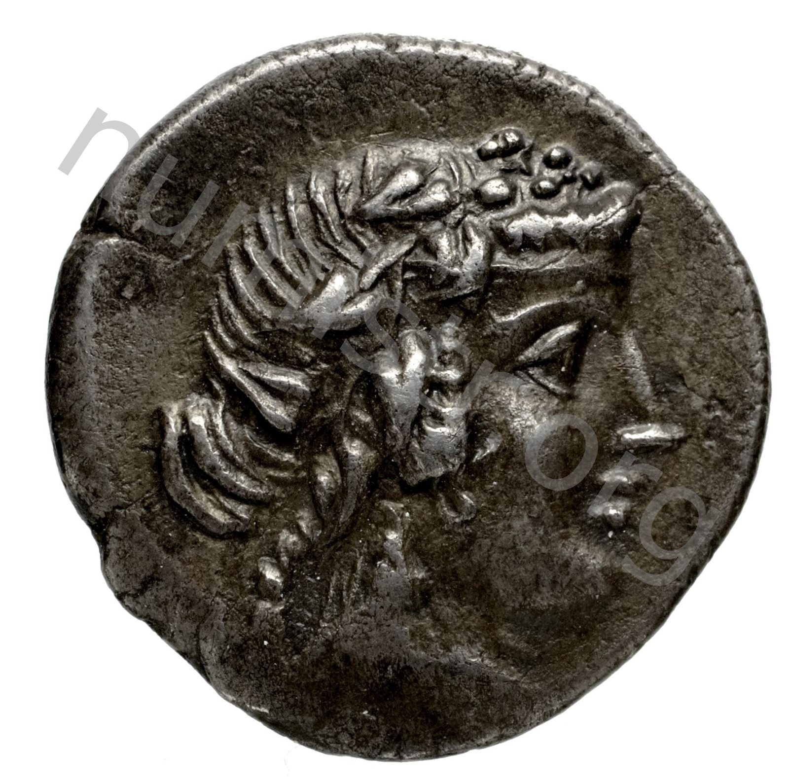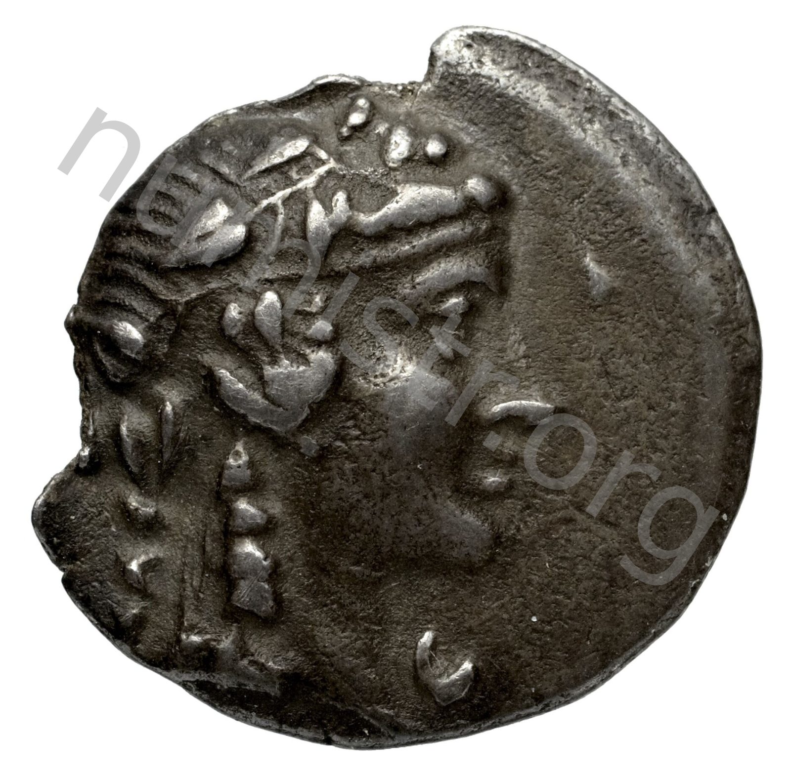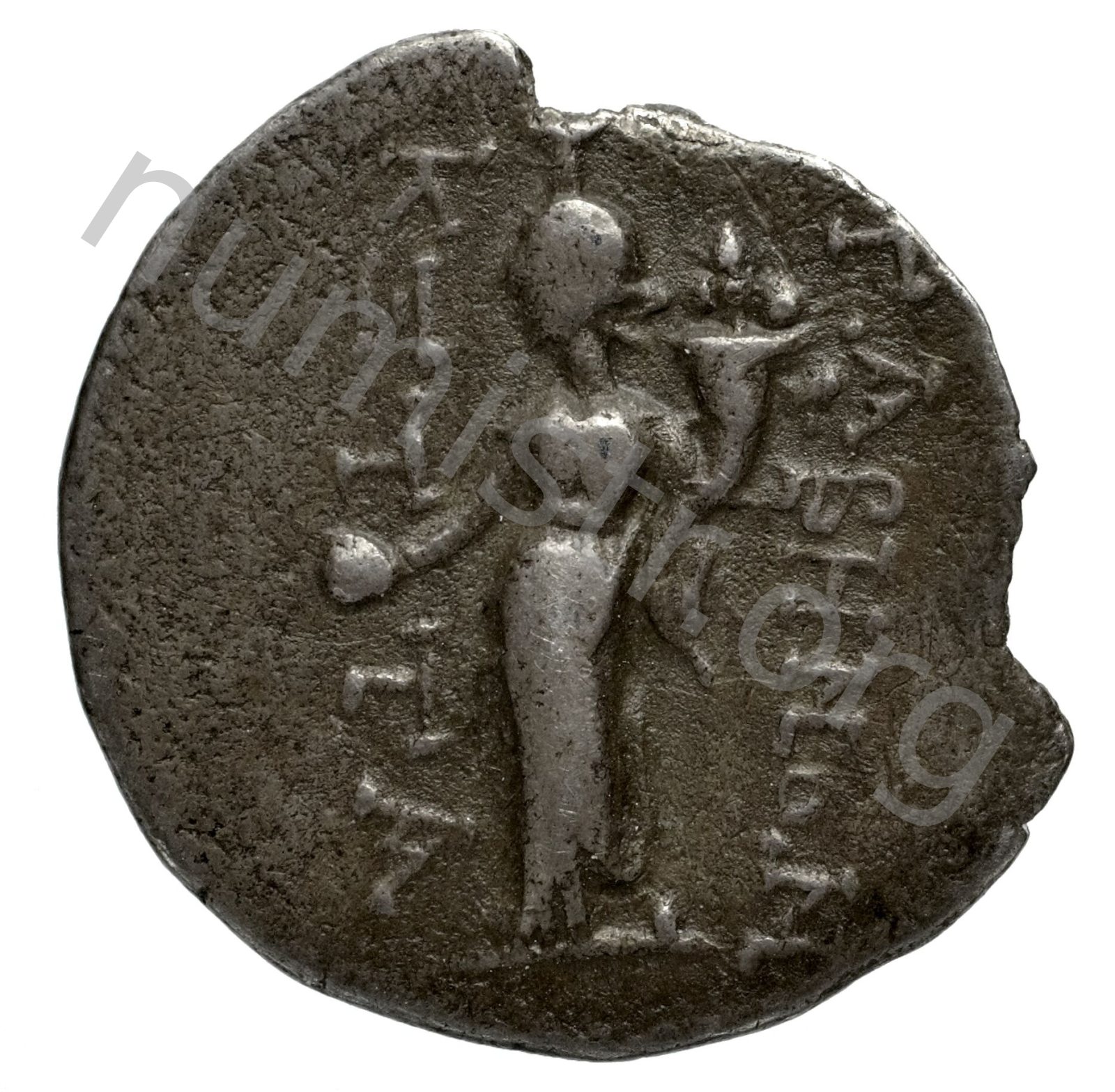 Tanrıça (Homonoia?) bir peplos giymiş elinde bir phiale (ritüel kasesi) ve bir bereket boynuzu tutuyor.