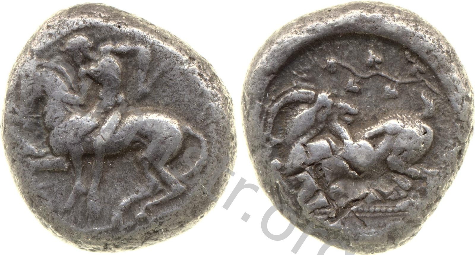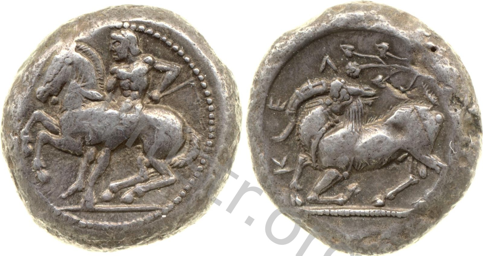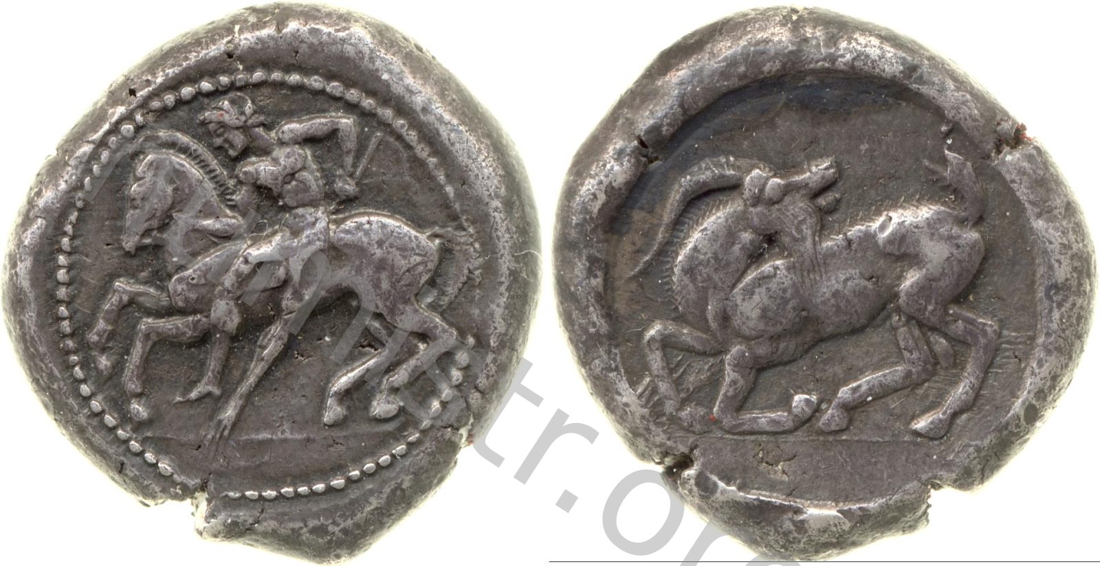Naked horseman seated sideways on a horse left holding the horse's bridle and a whip -[en]