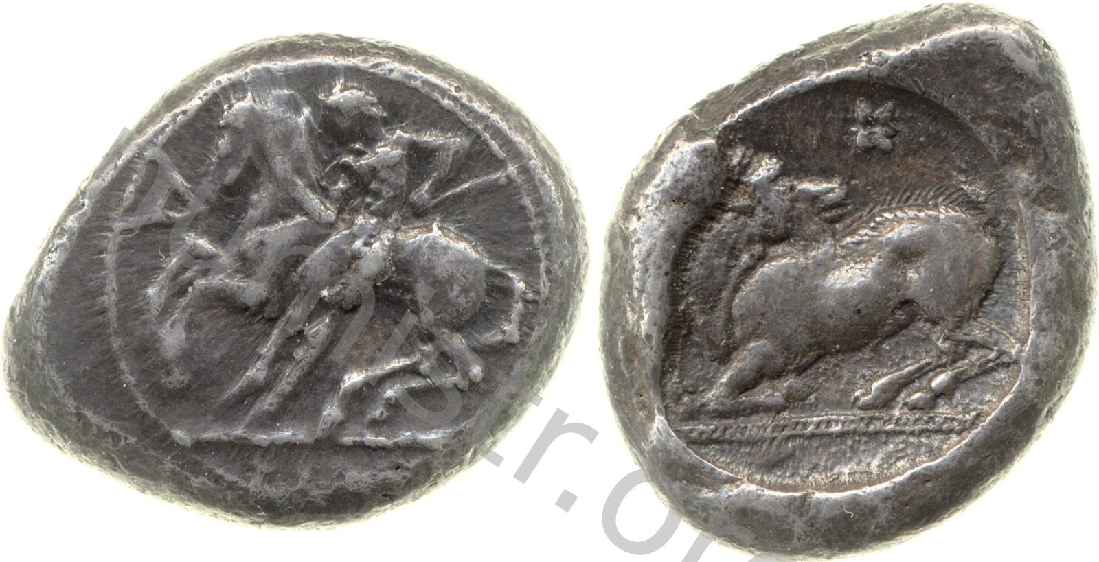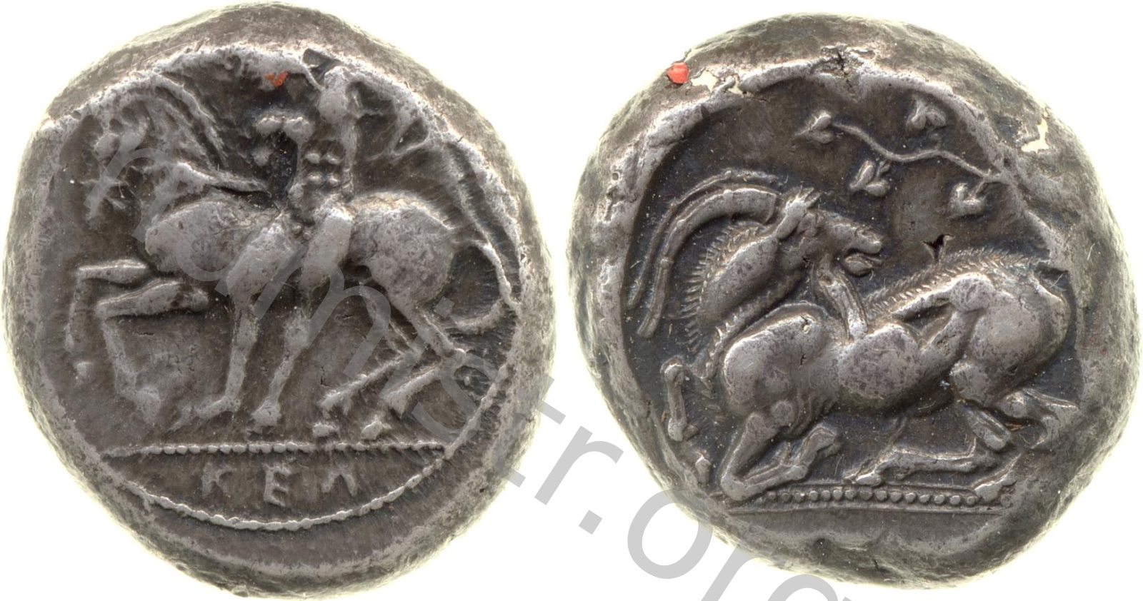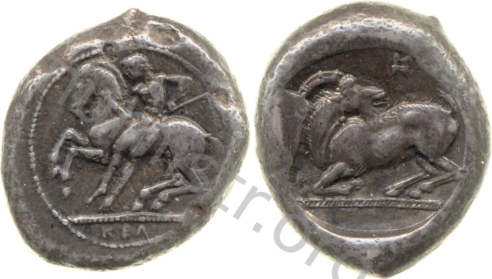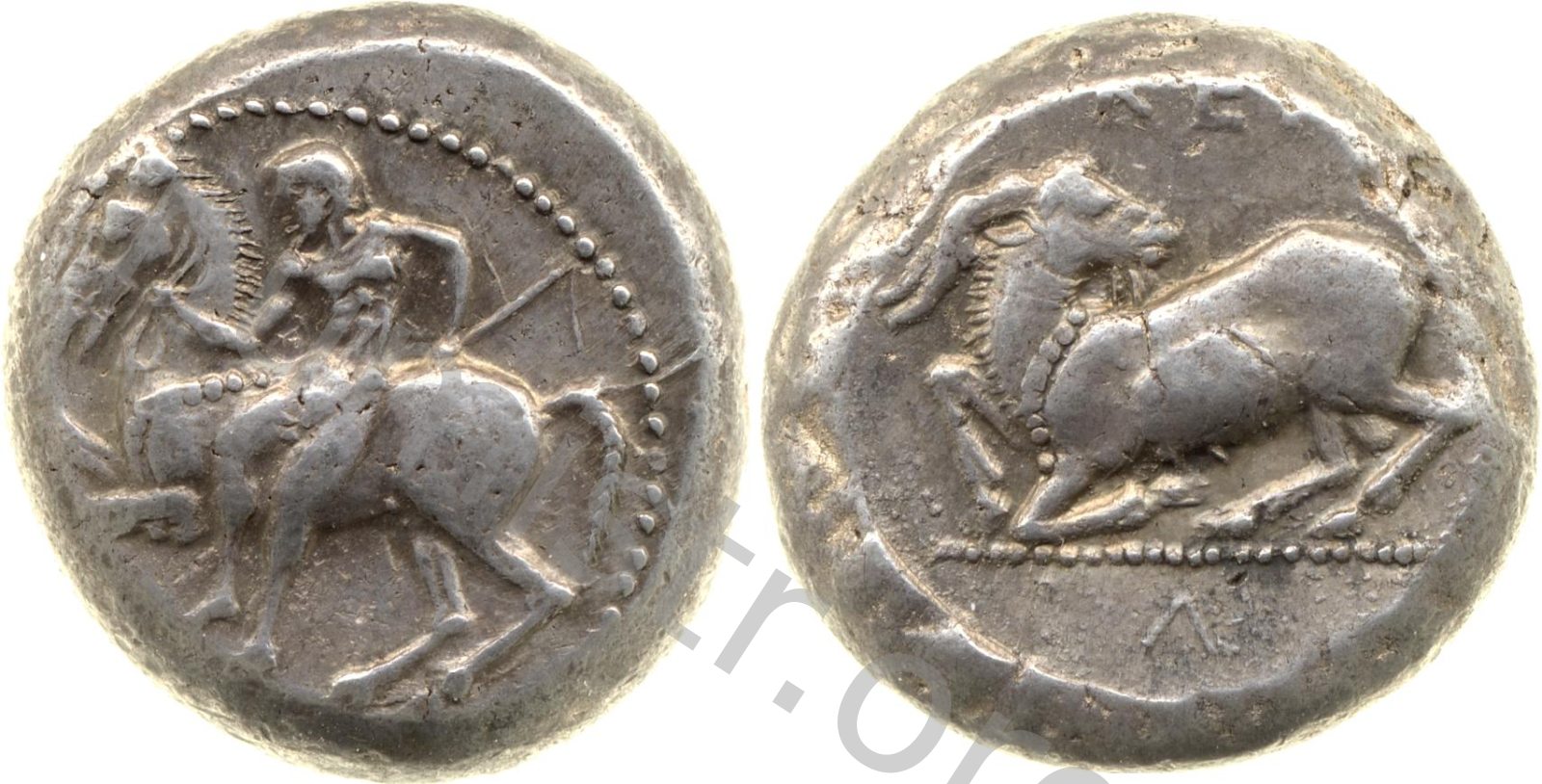 Naked horseman seated sideways on a horse left holding the horse's bridle and a whip -[en]