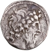Demetrius II'nin taçlı başı sağda sakallı başının tepesinde dağınık bukleler ve şakağında kısa boynuzlar var