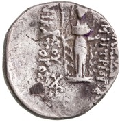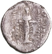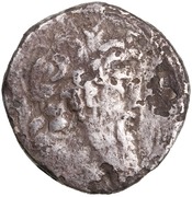 Diademed head of Demetrius II right bearded with touseled locks on crown of head and stubby horns at temple -[en]