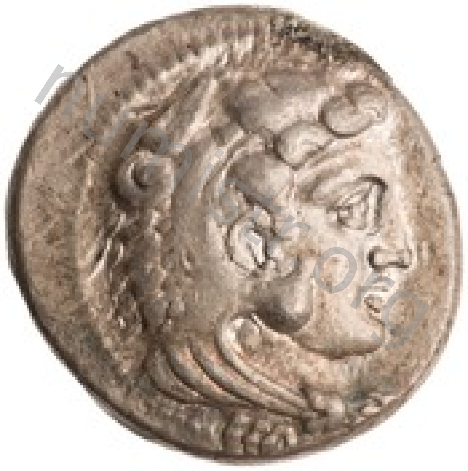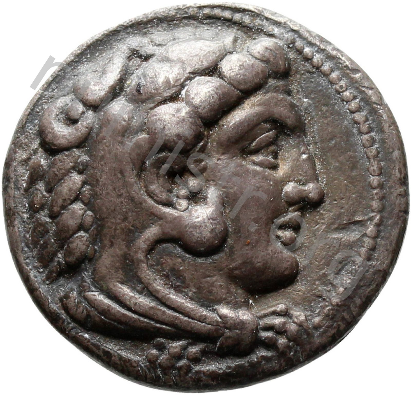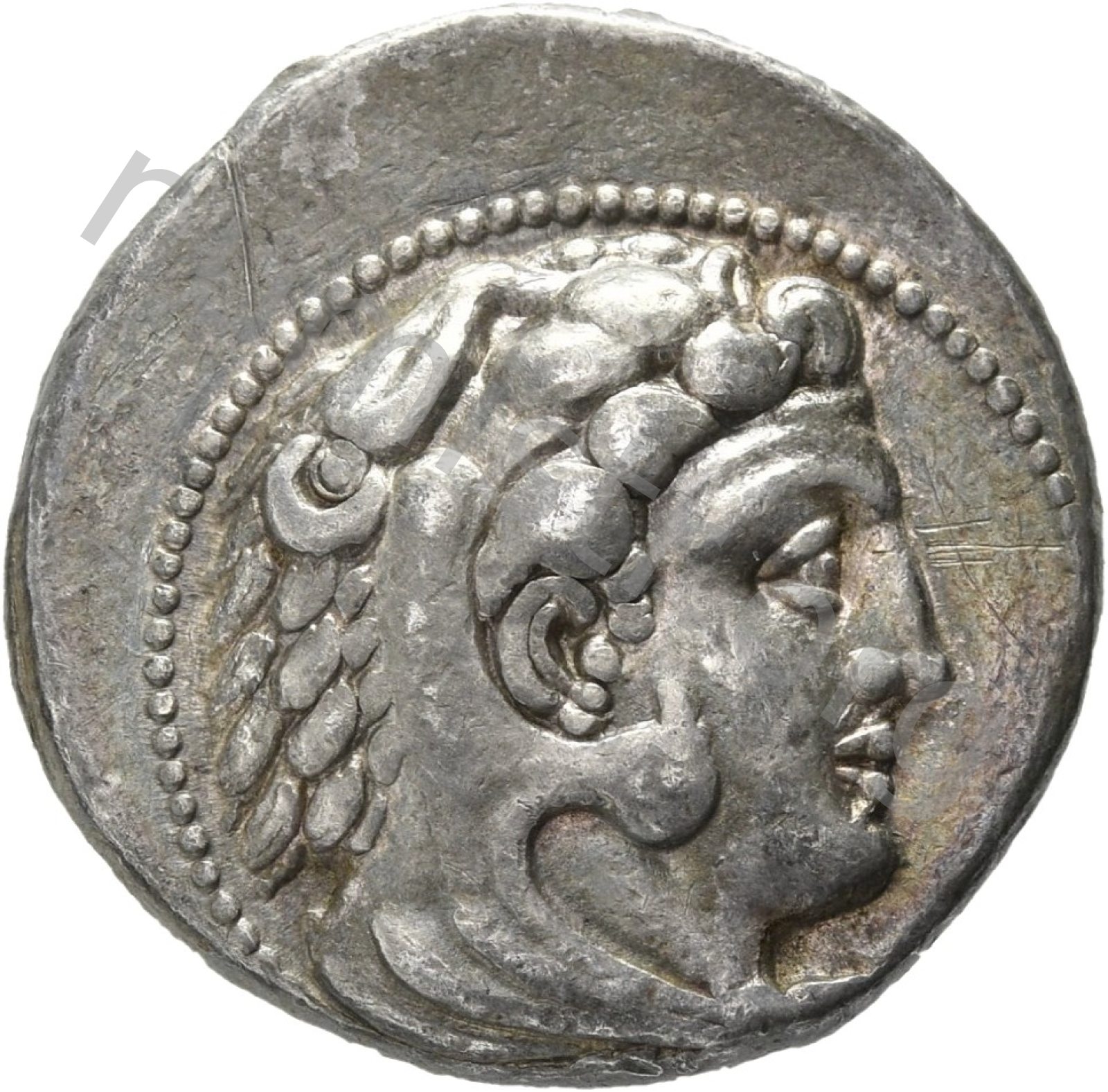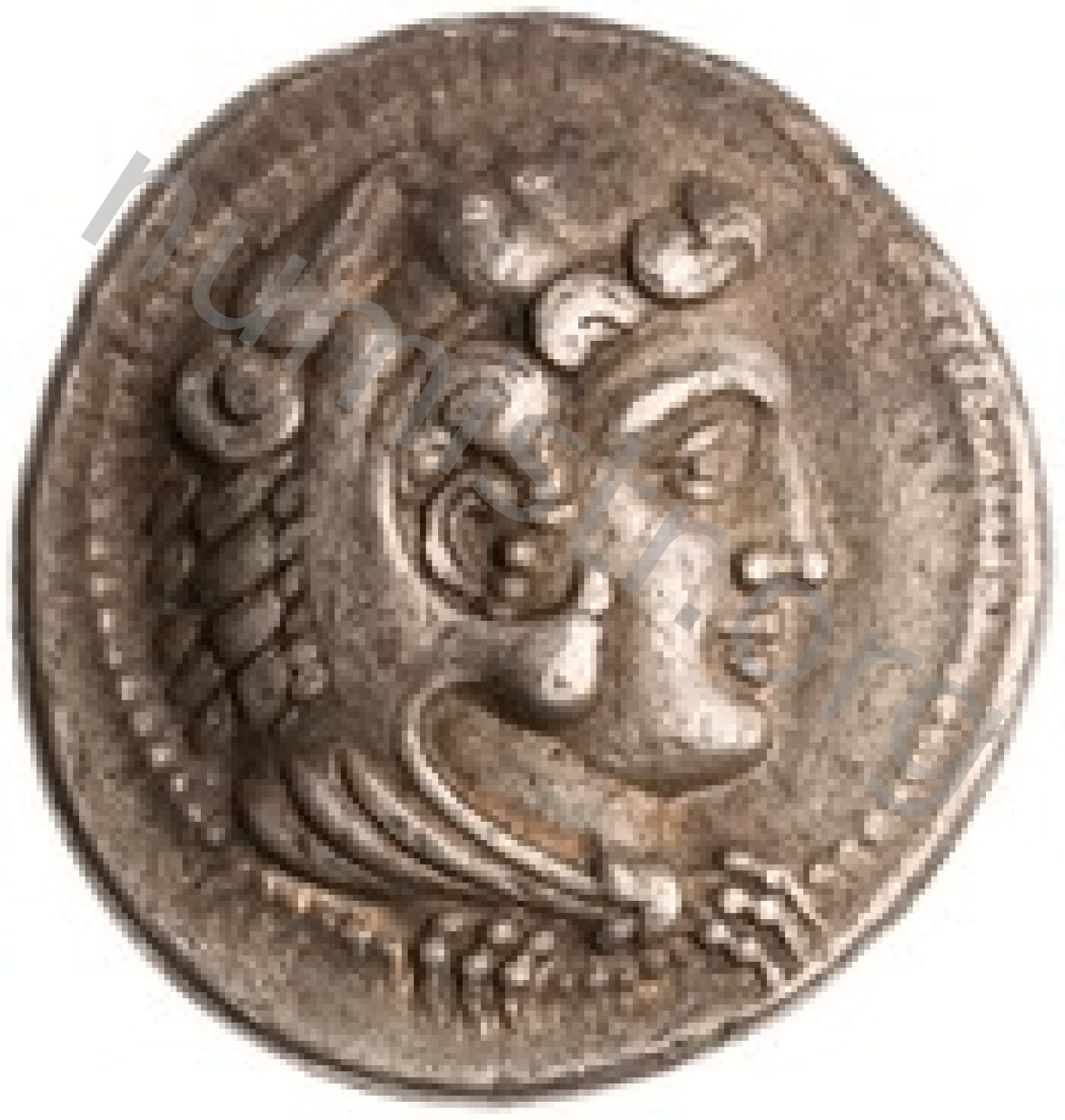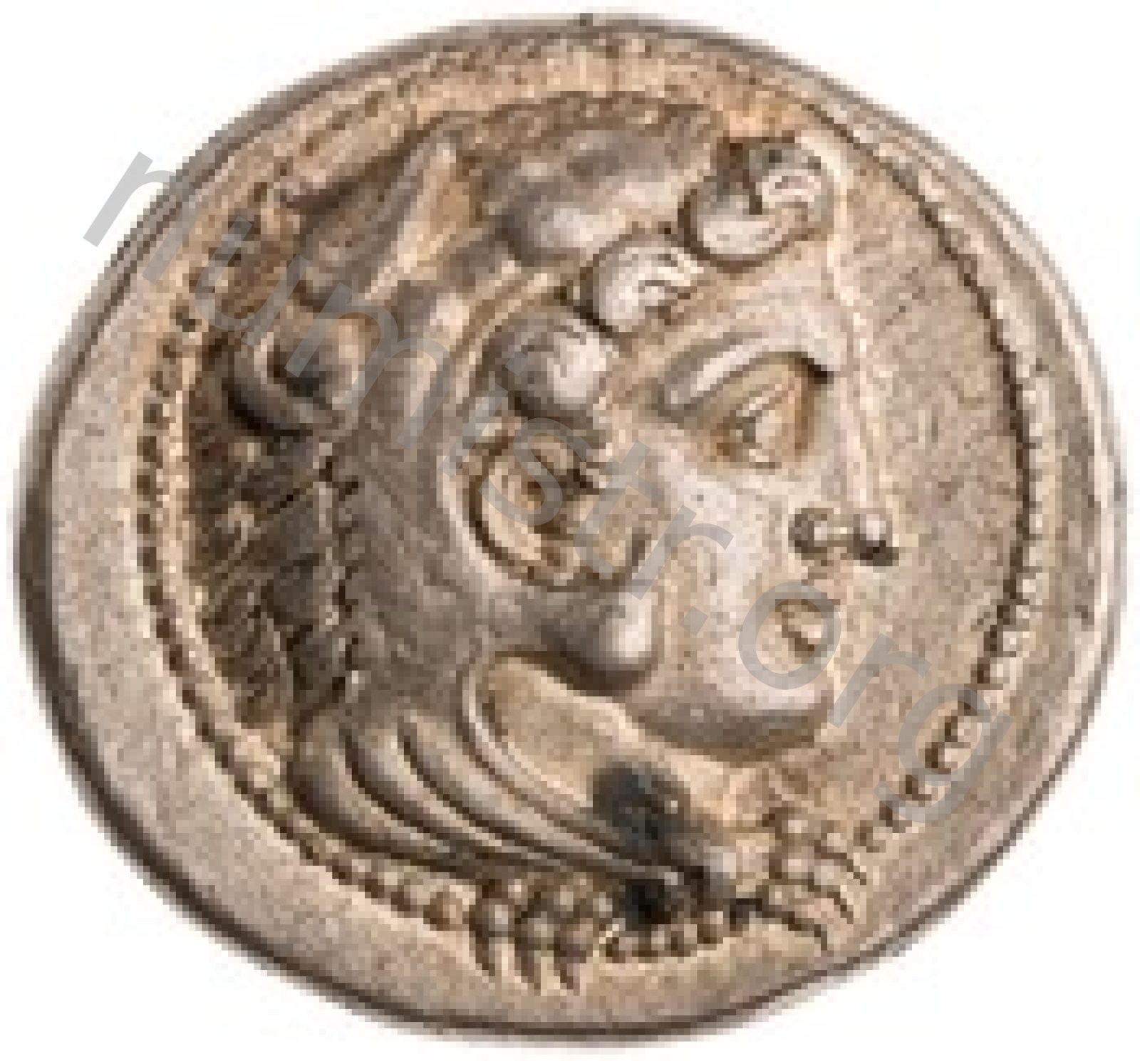Head of beardless Heracles right wearing lion skin headdress -[en]