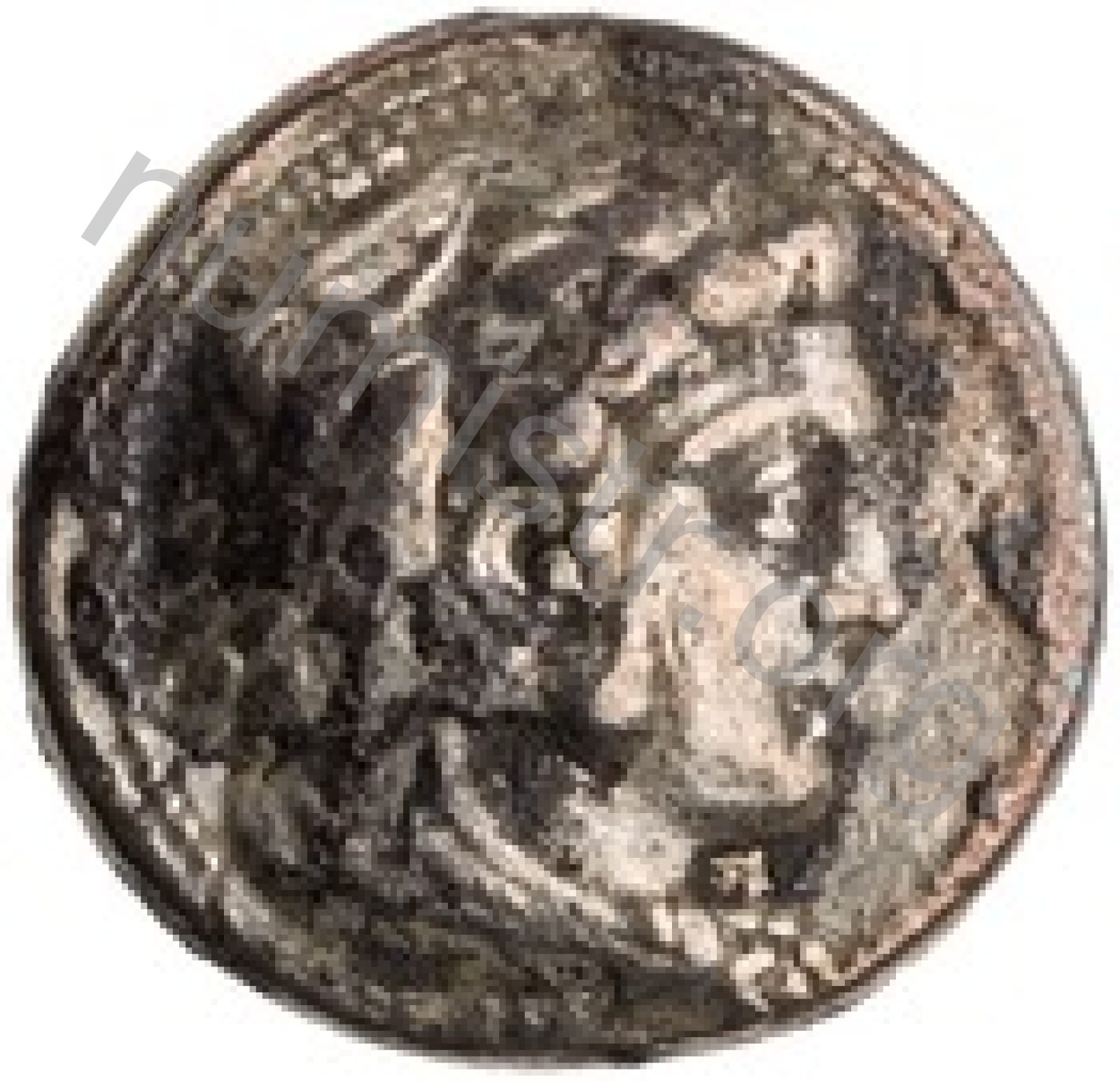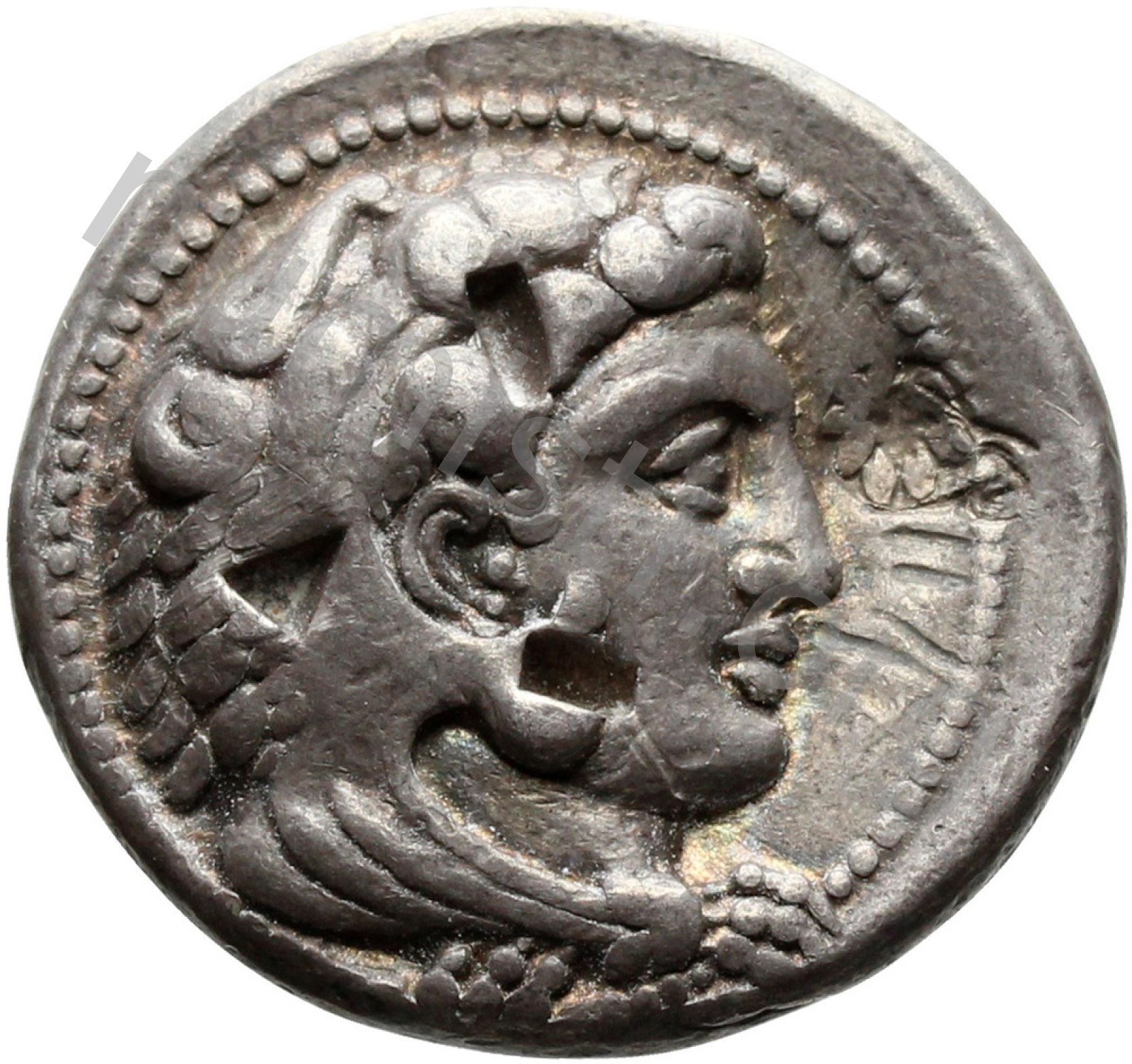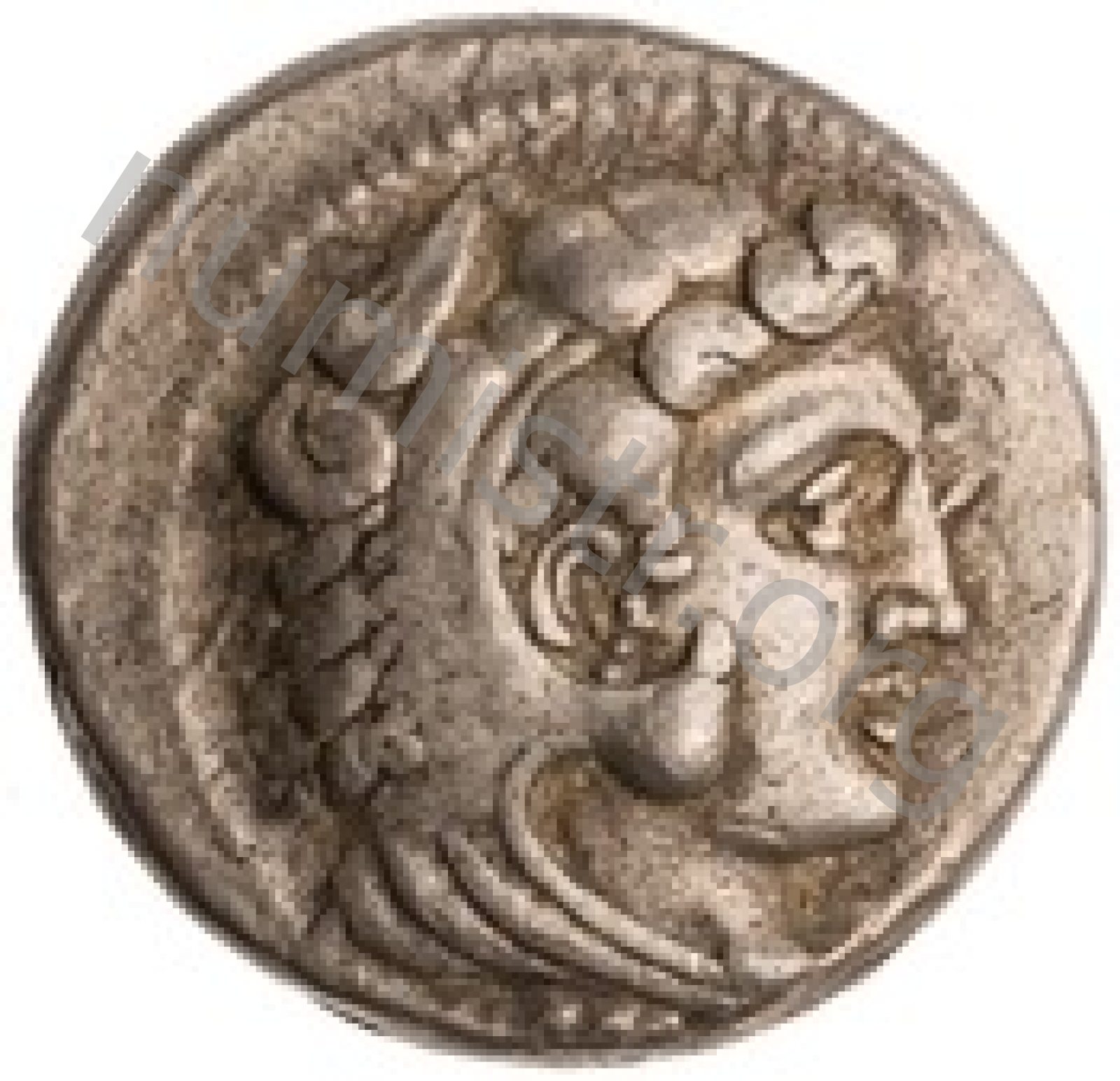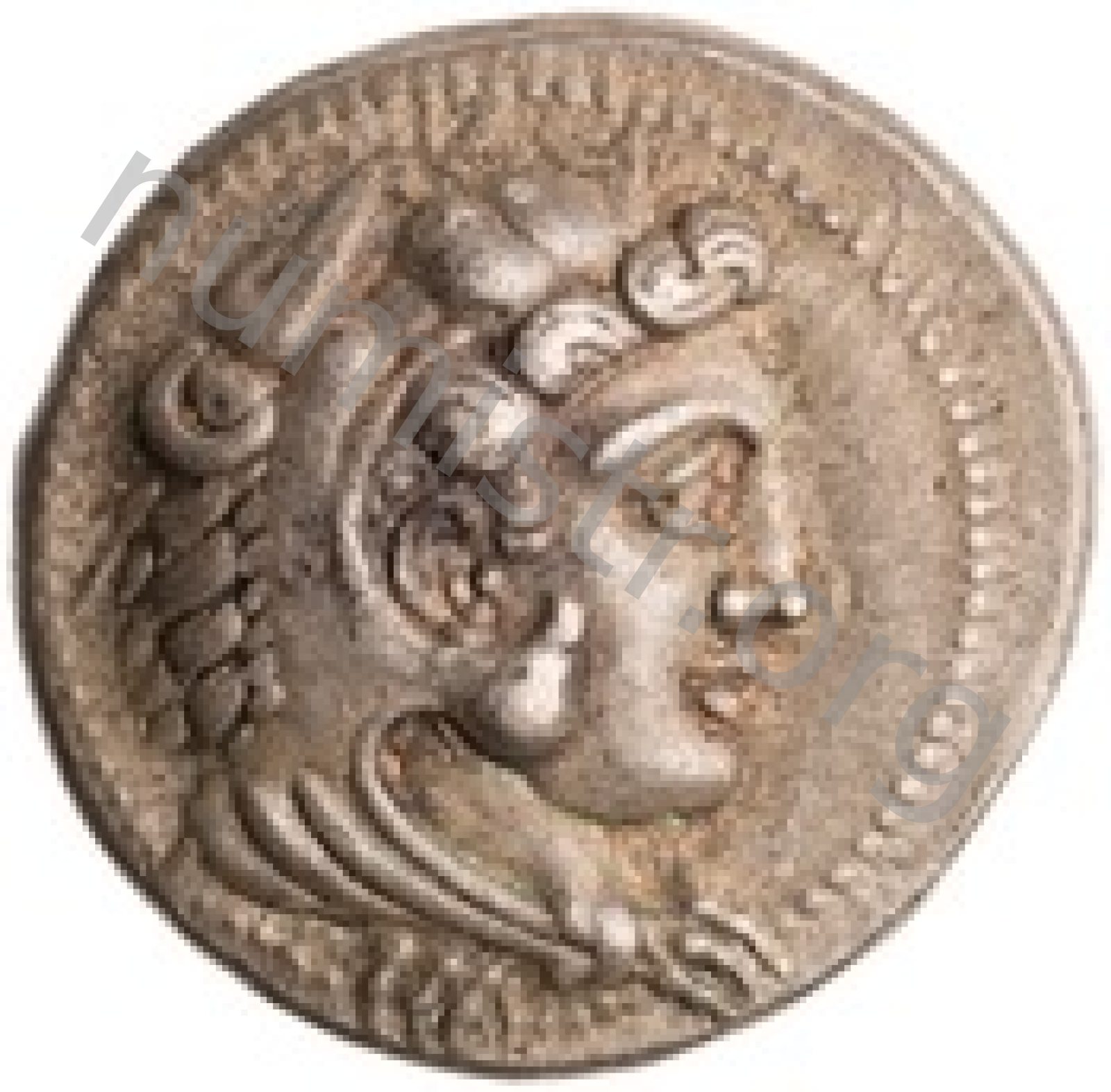Head of beardless Heracles right wearing lion skin headdress -[en]