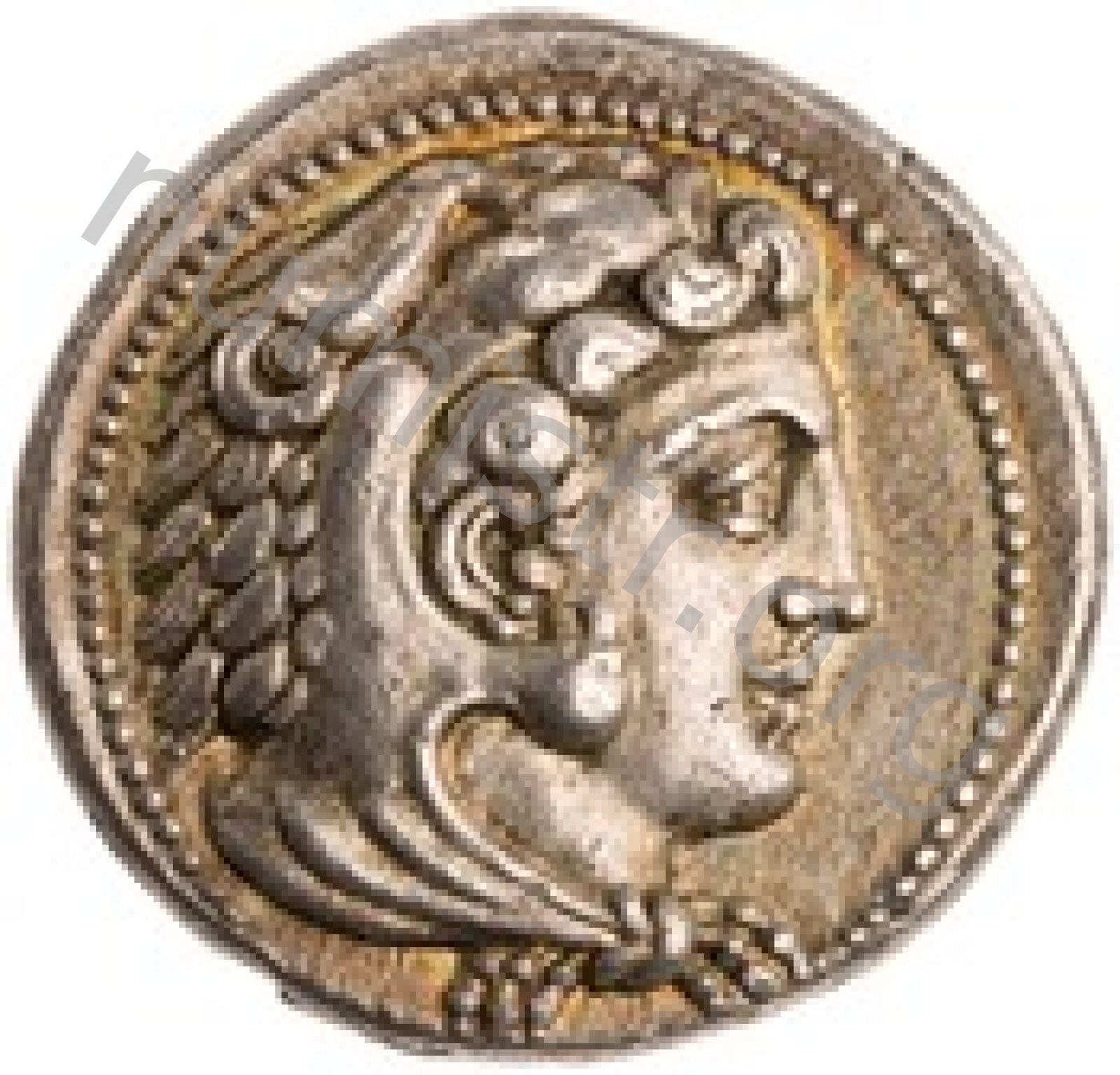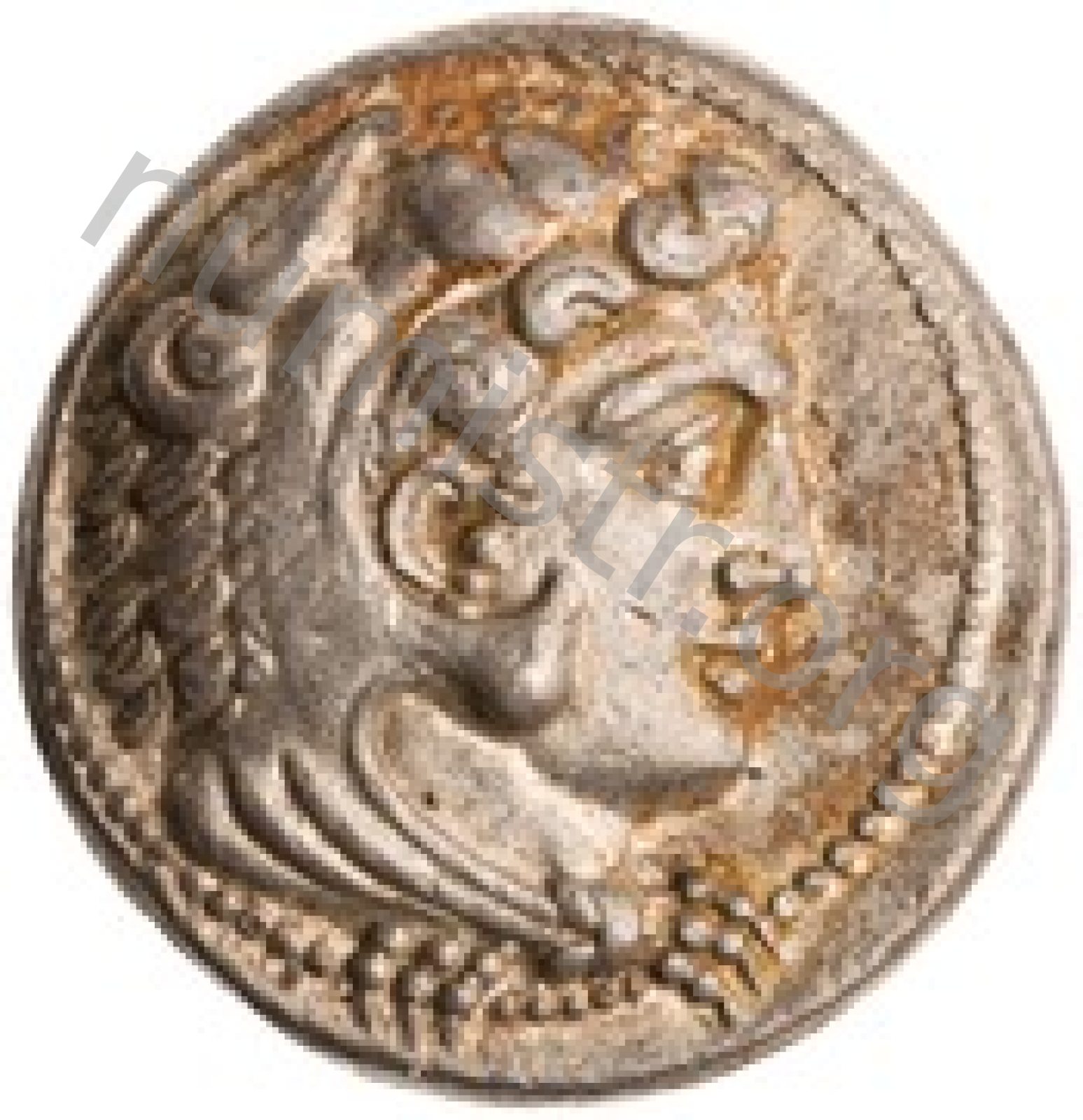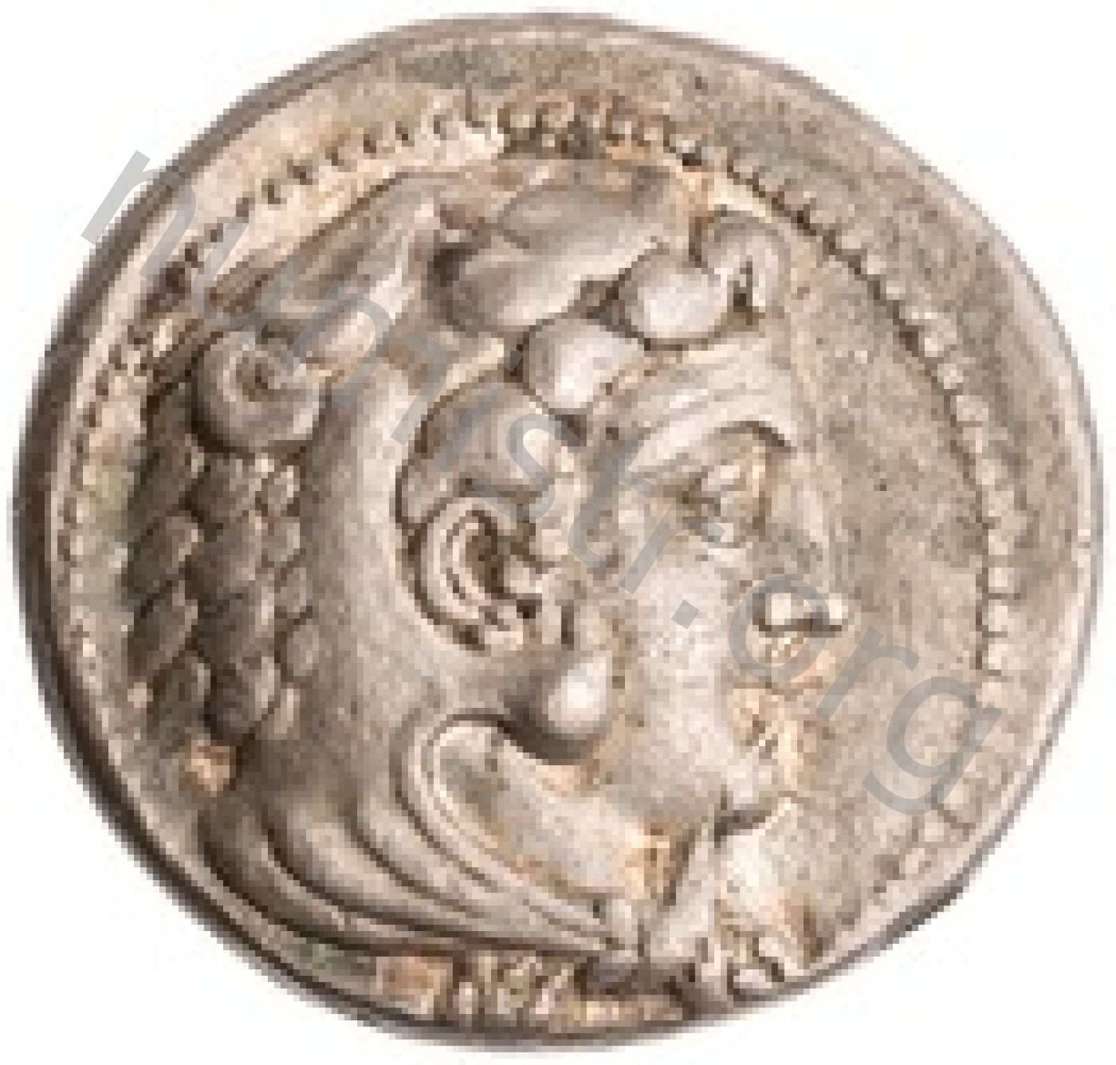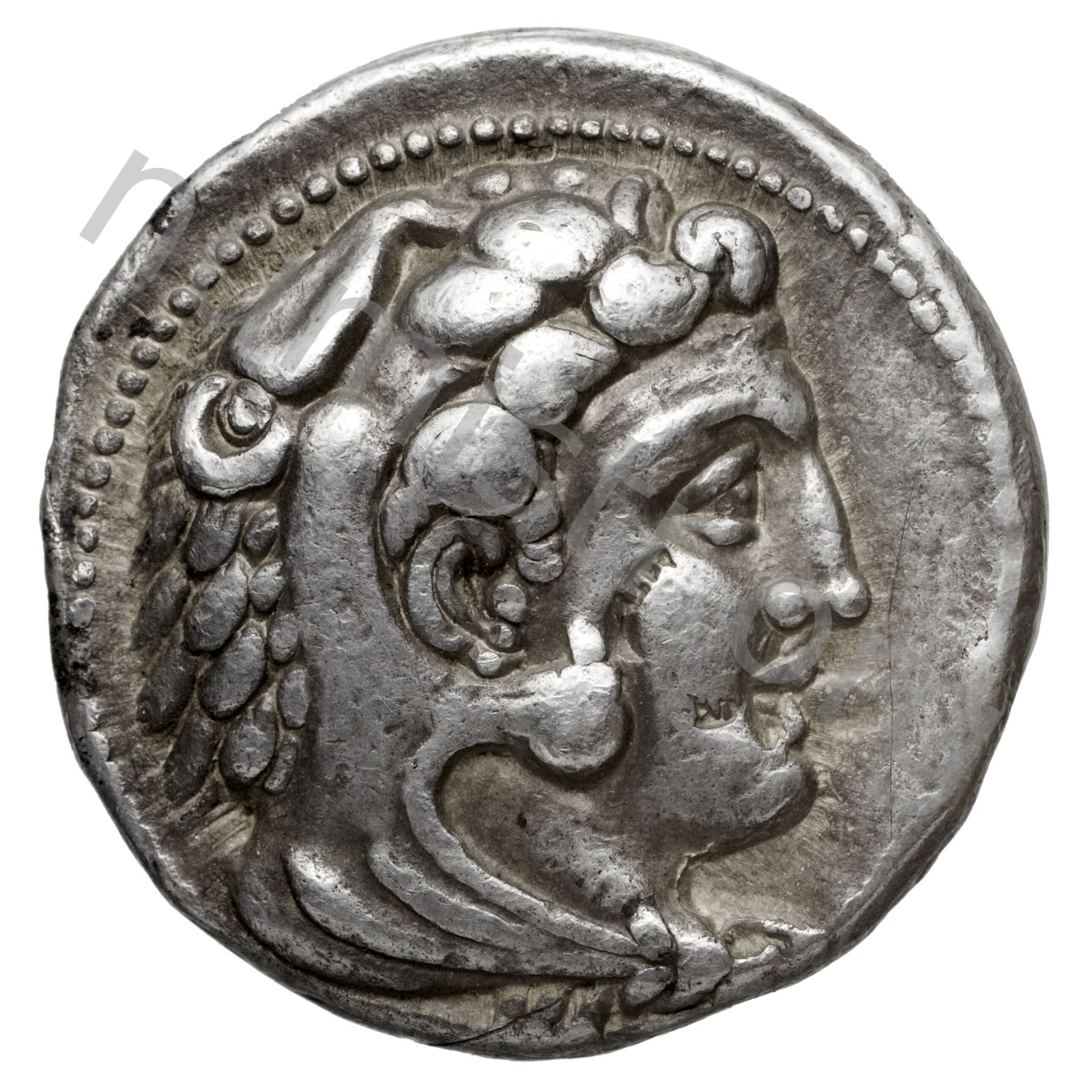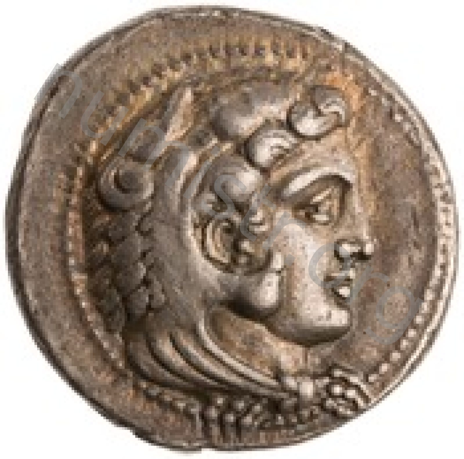 Head of beardless Heracles right wearing lion skin headdress -[en]