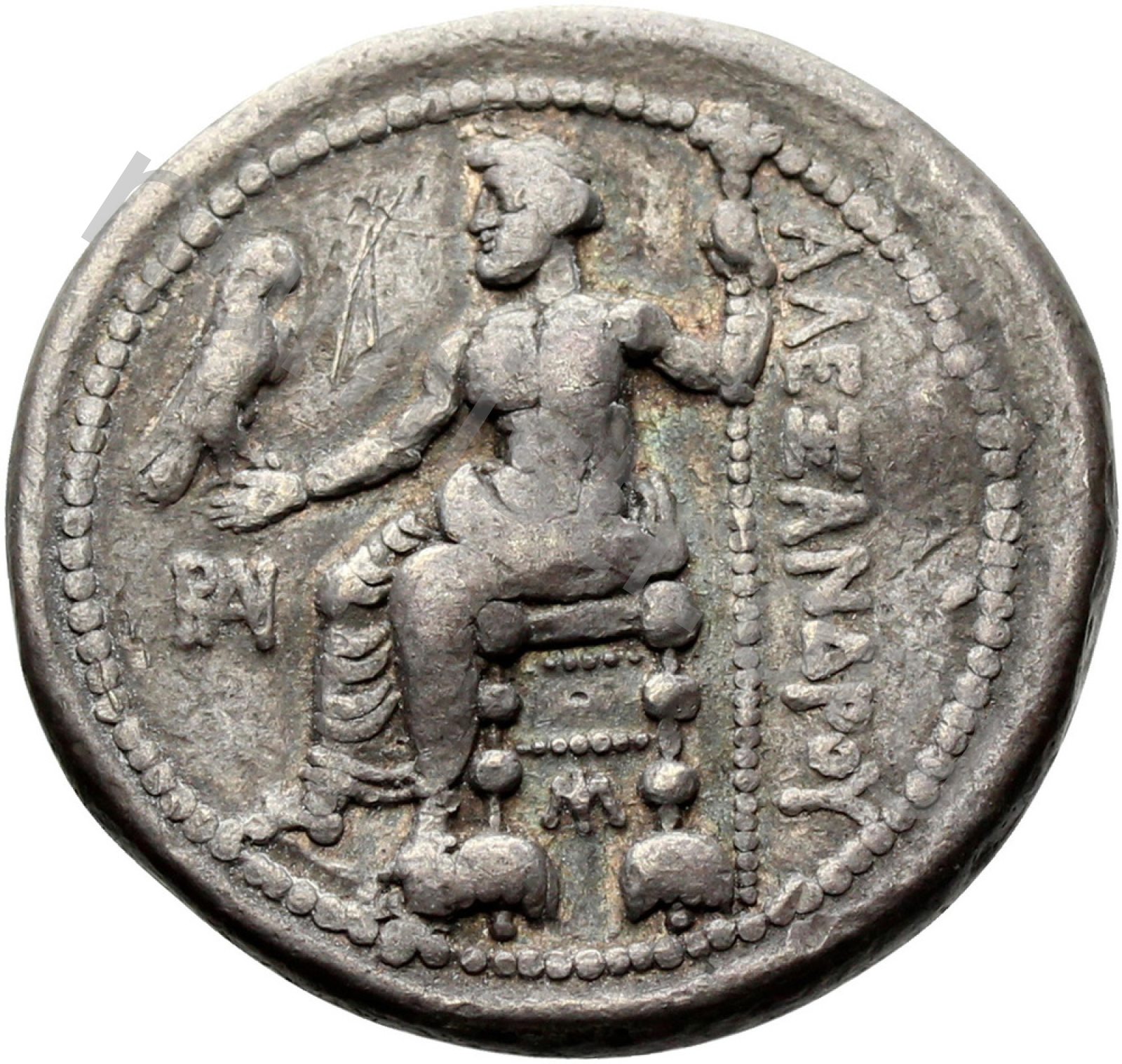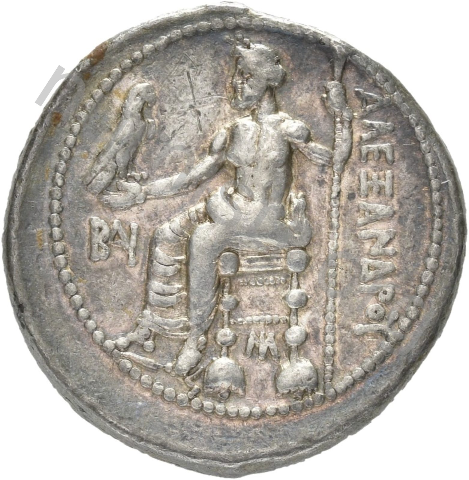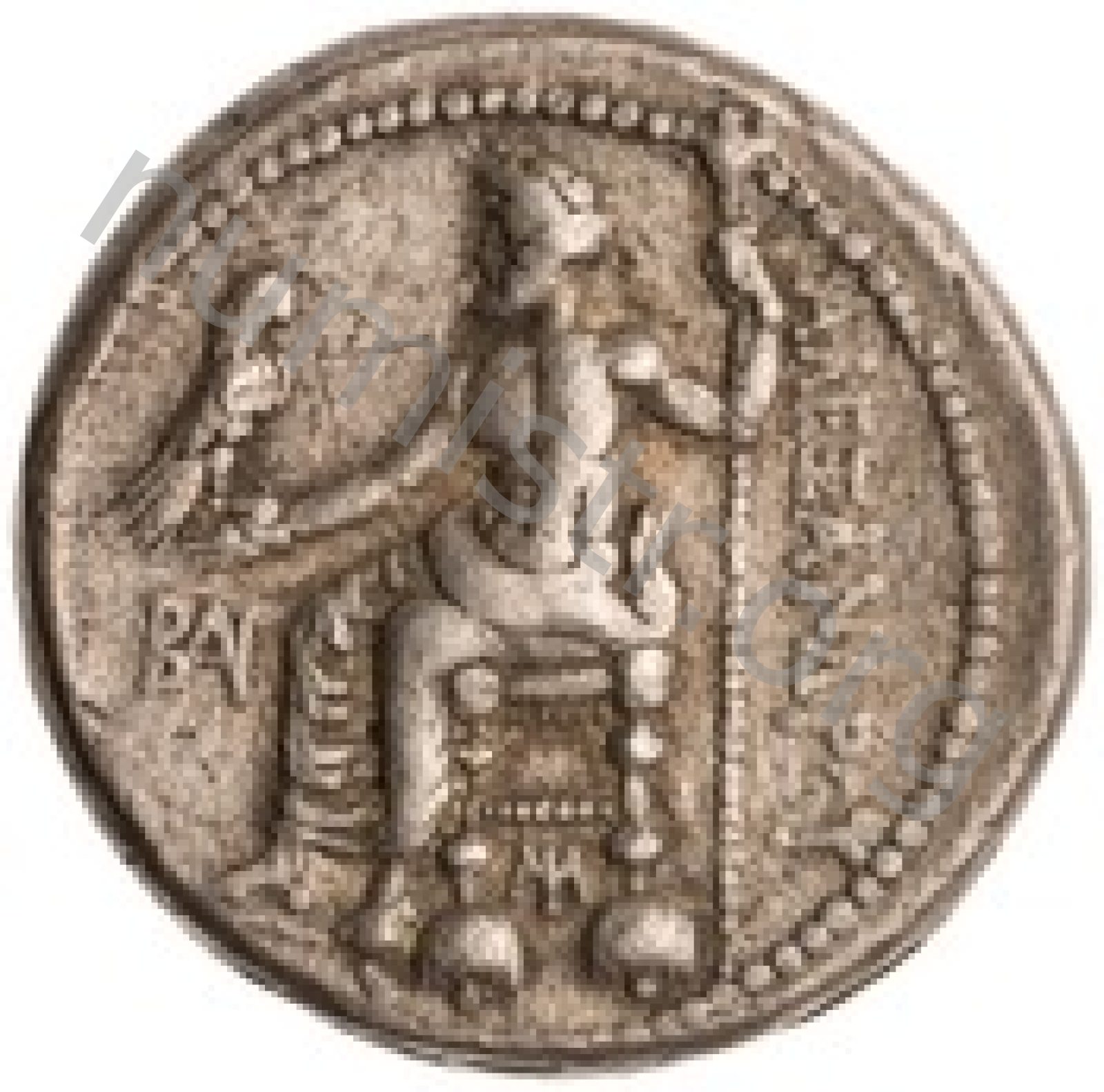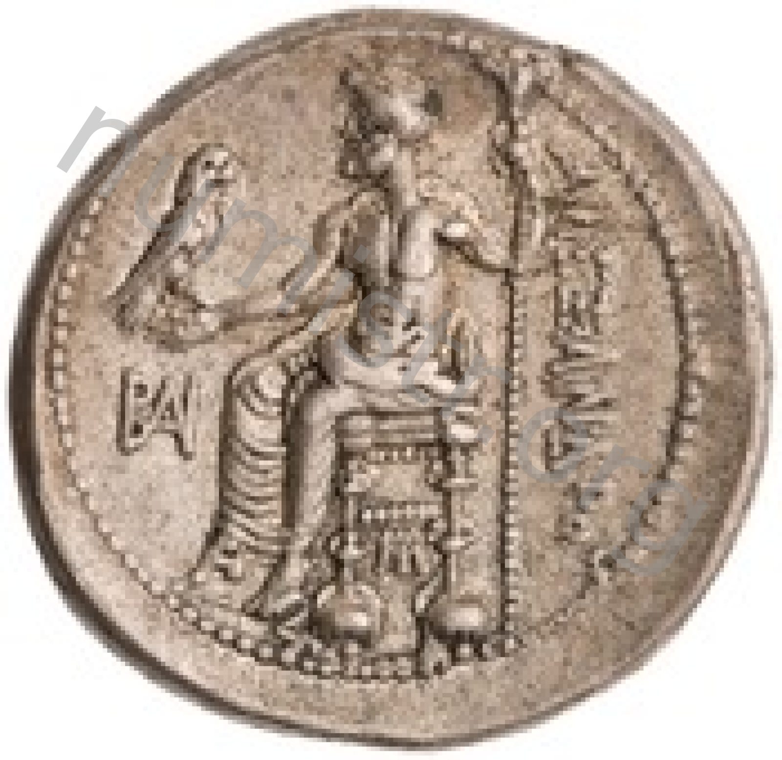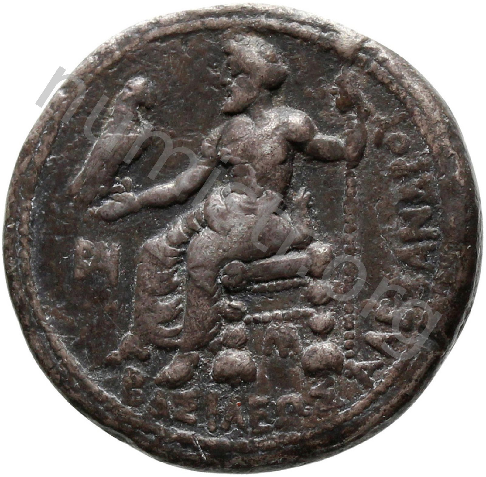 Zeus seated on stool-throne left eagle on outstretched right hand sceptre in left hand -[en]