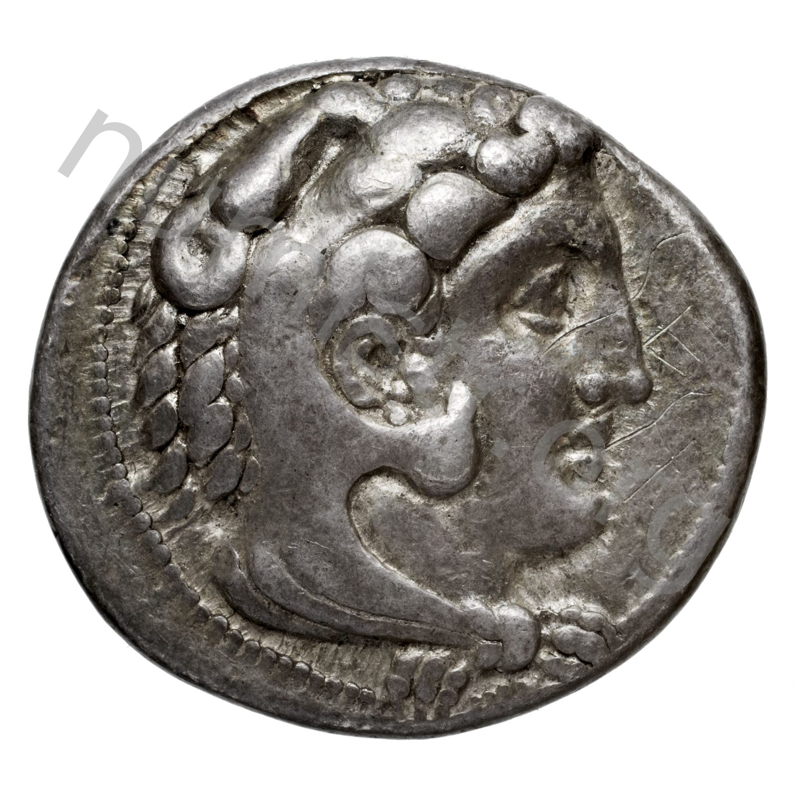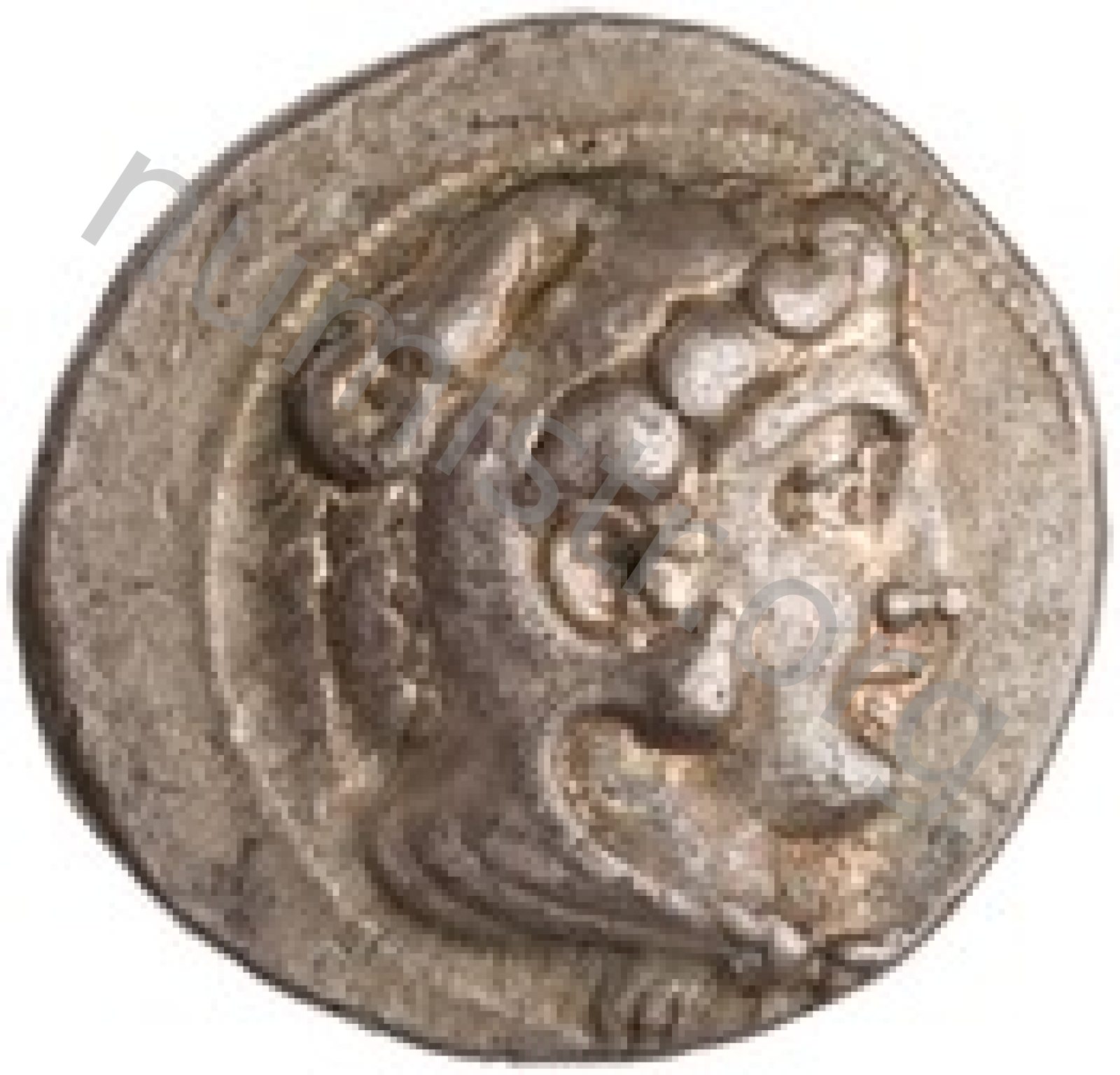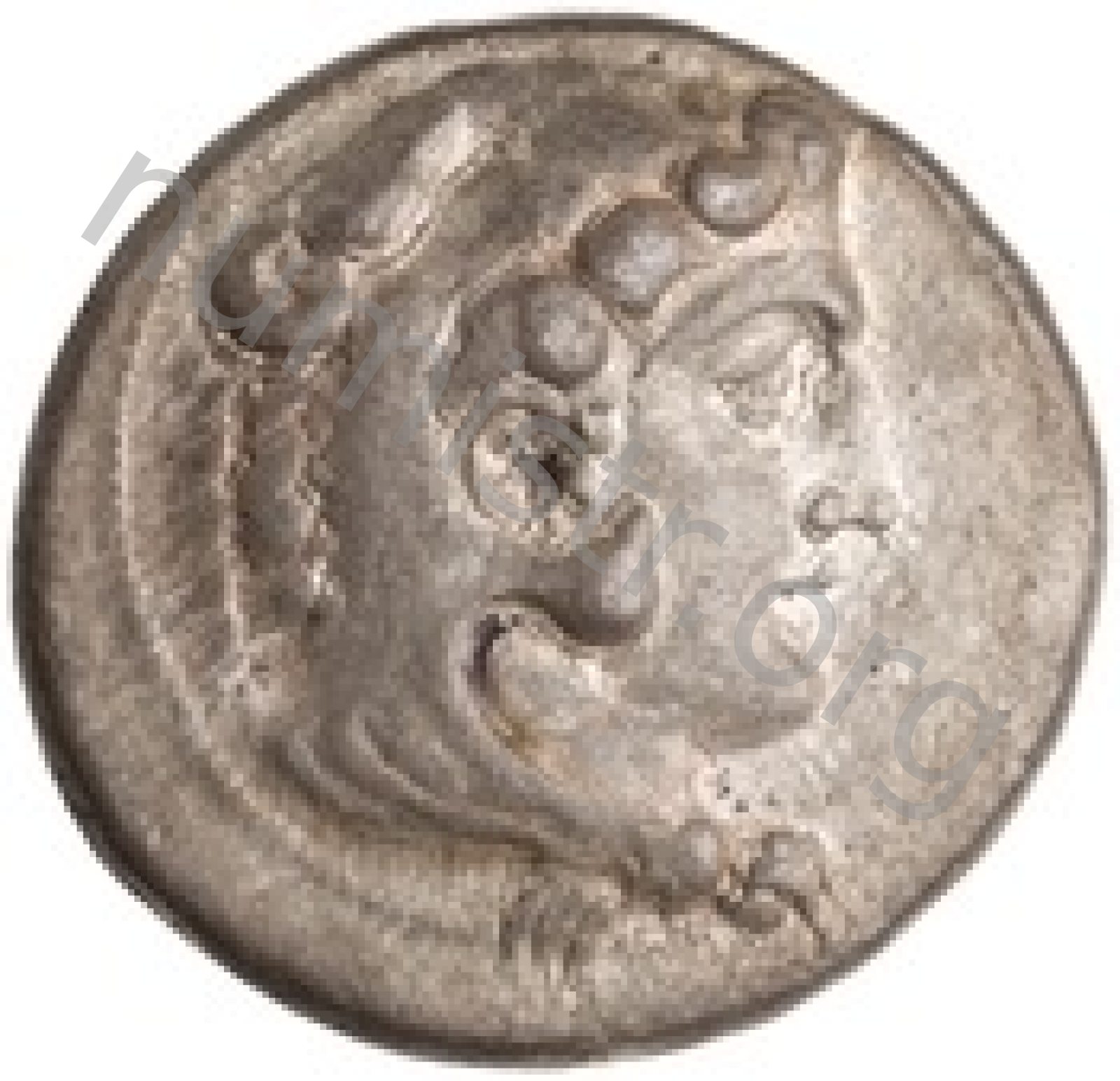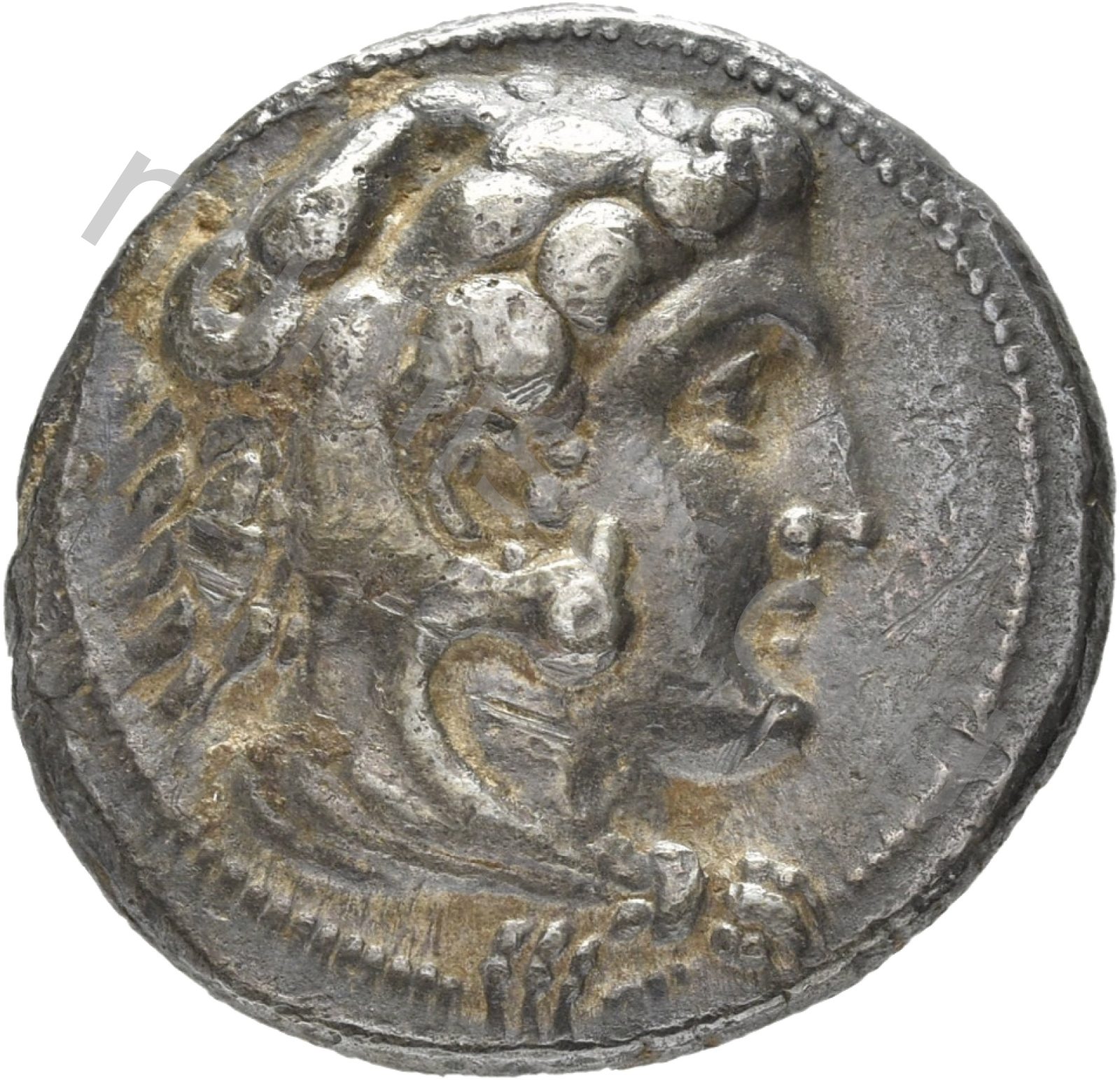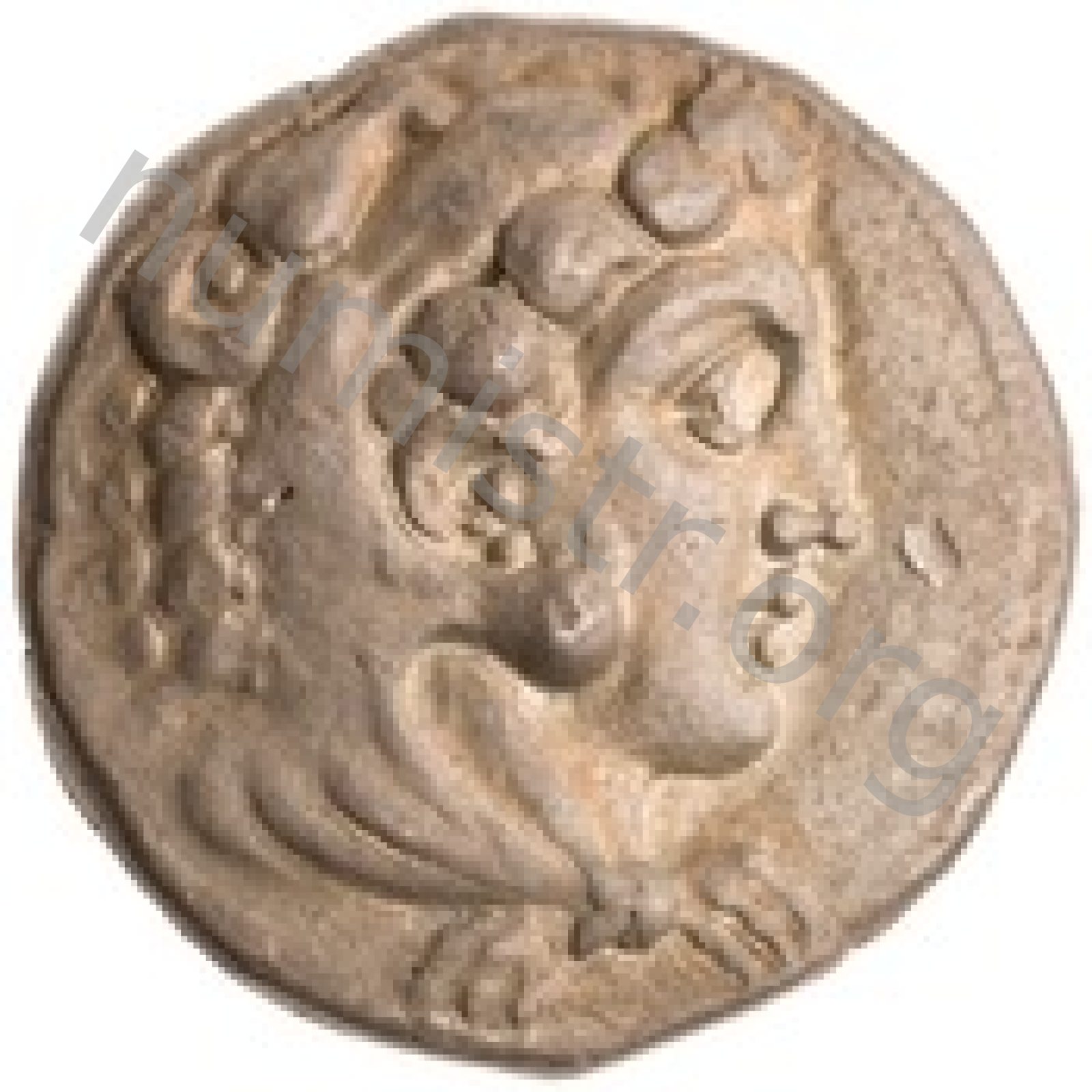 Head of beardless Heracles right wearing lion skin headdress -[en]