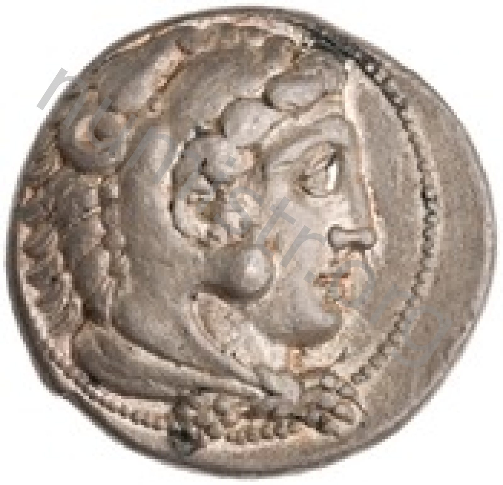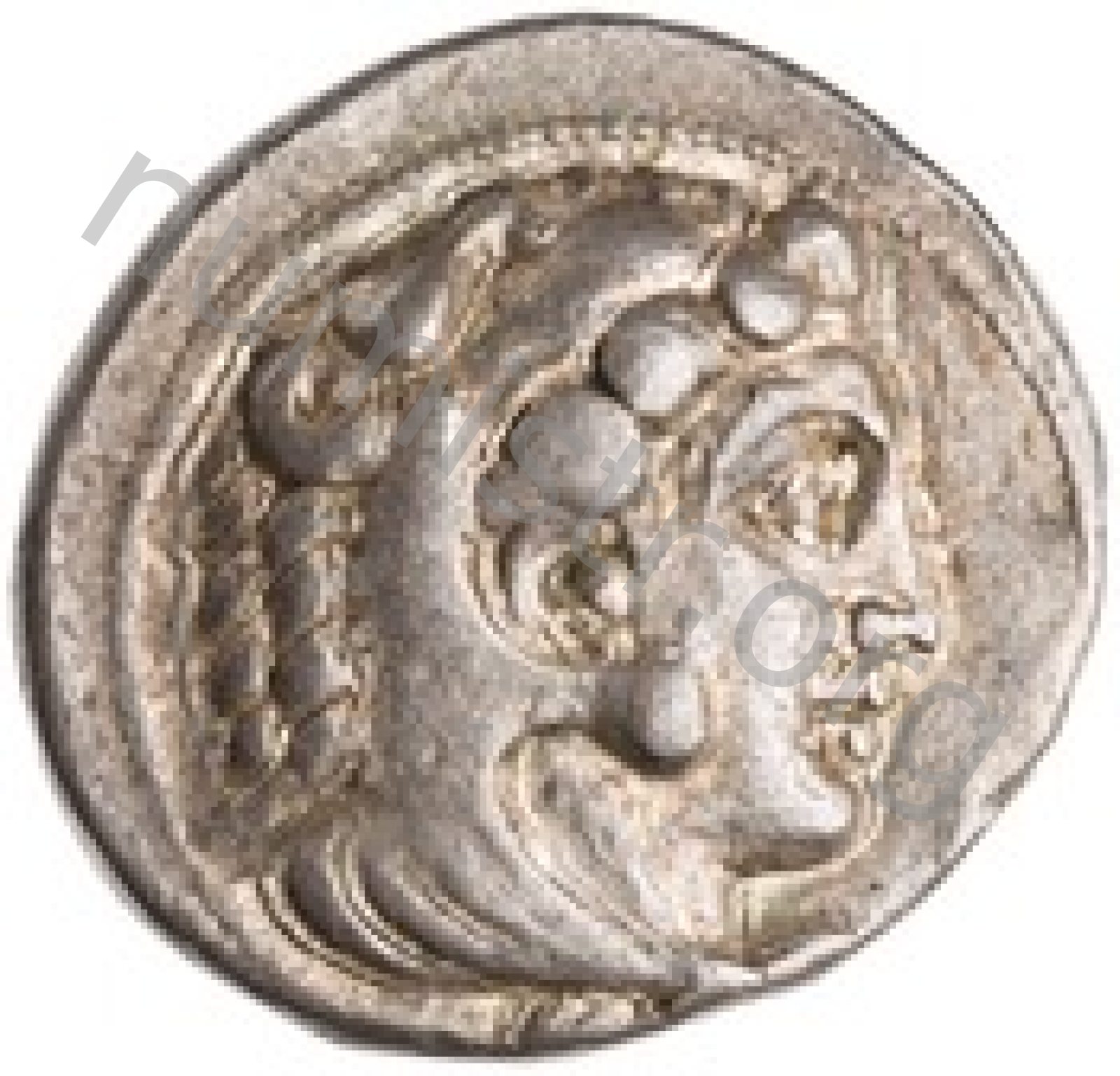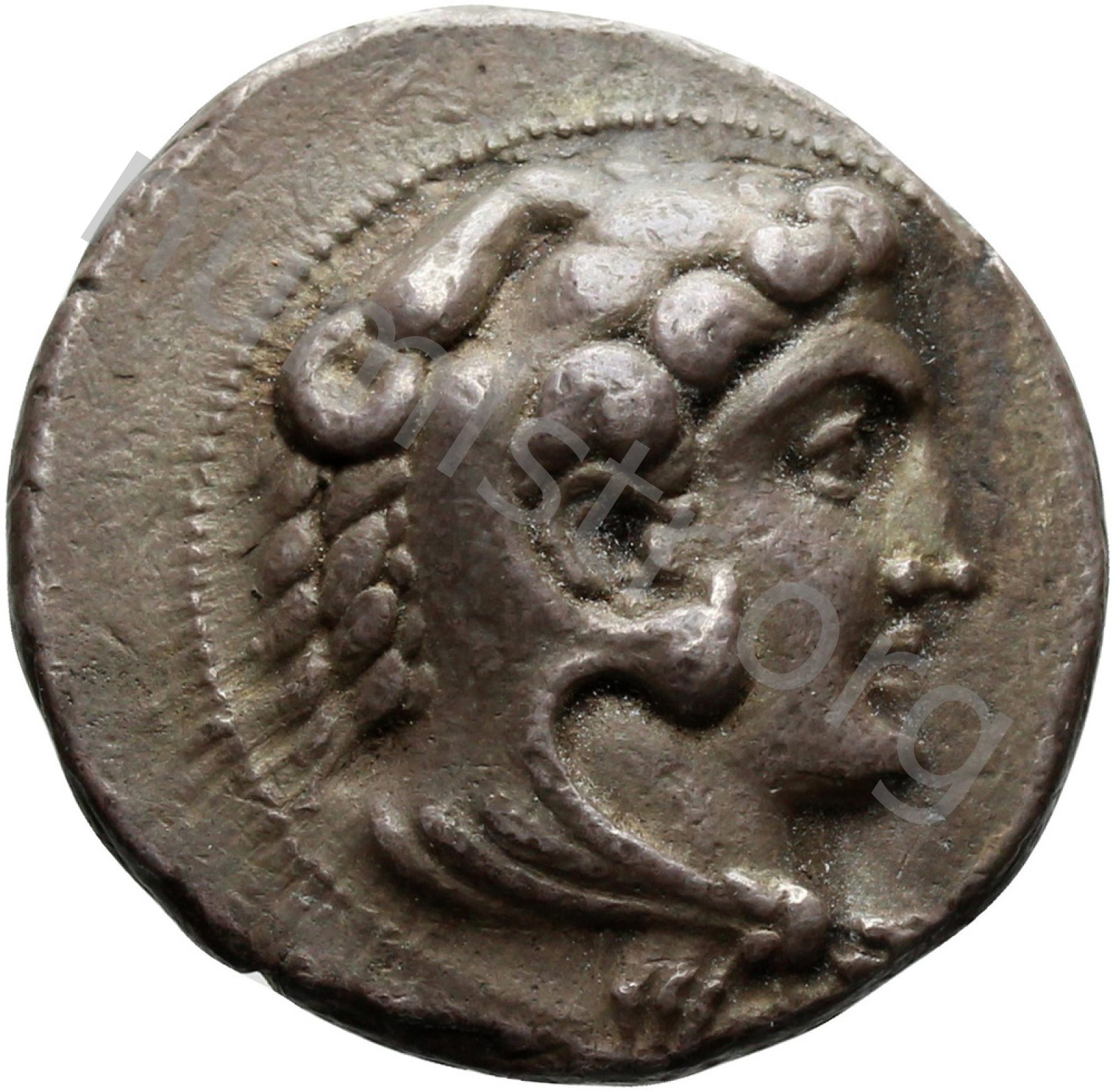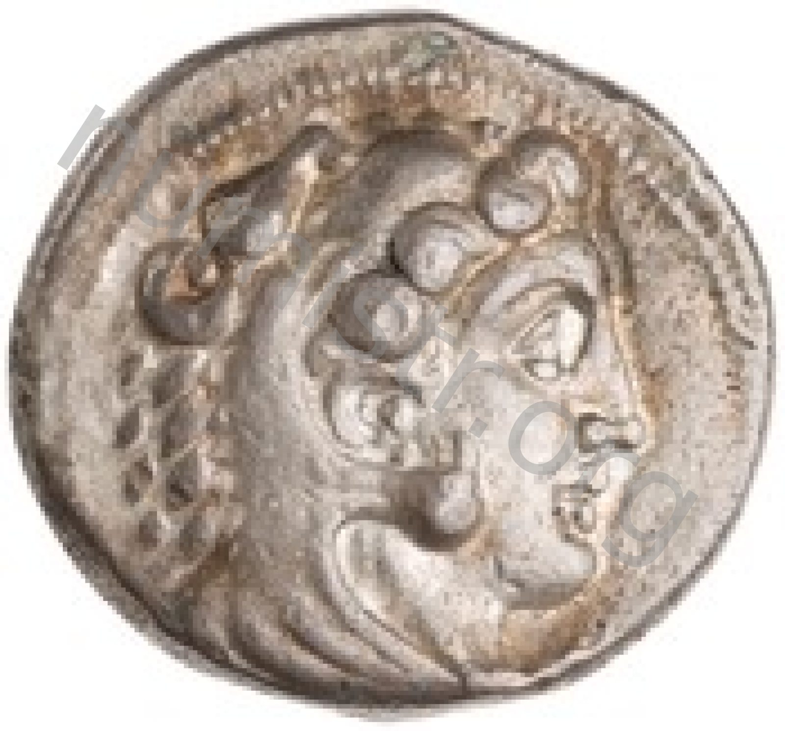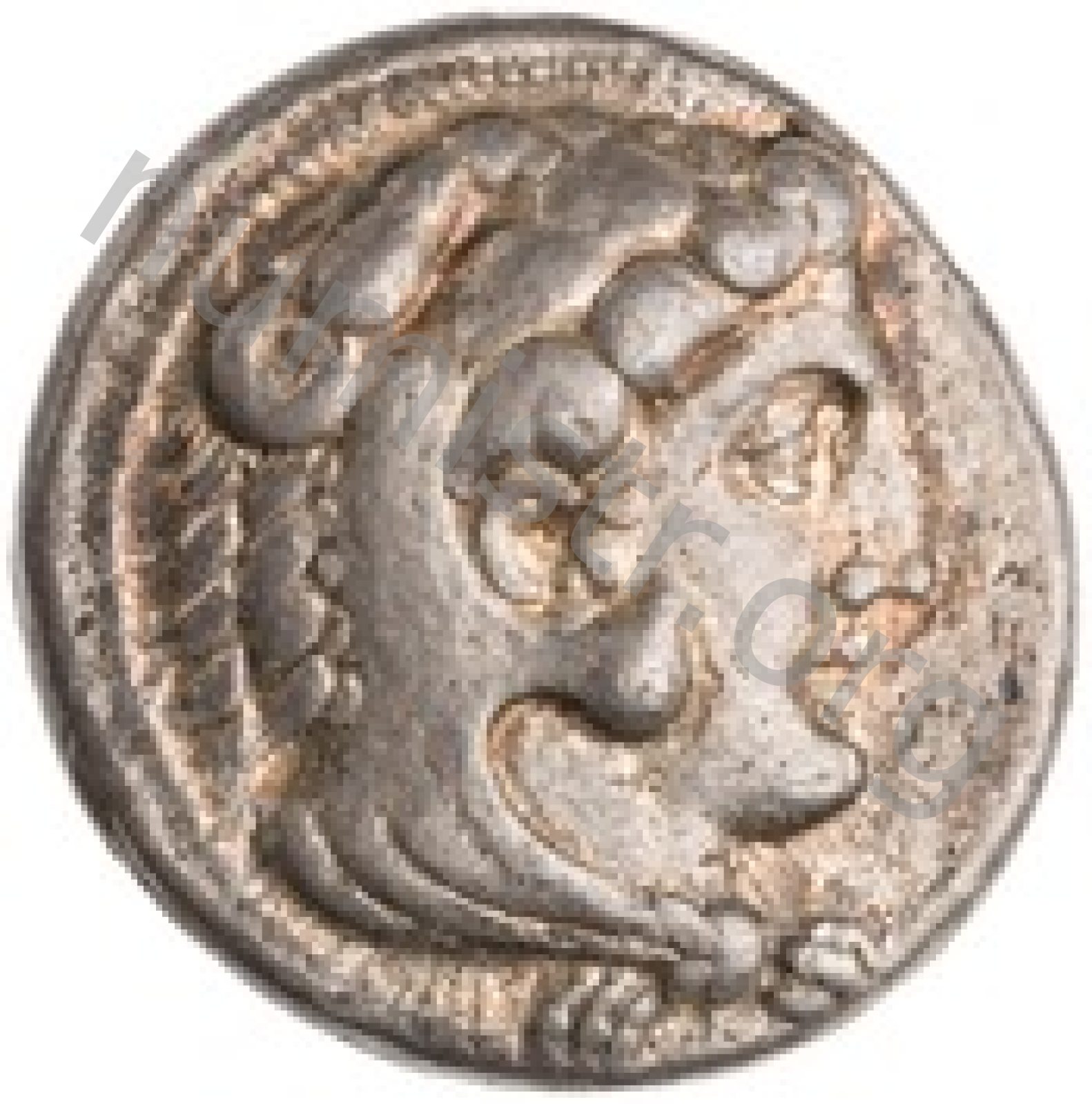 Head of beardless Heracles right wearing lion skin headdress -[en]
