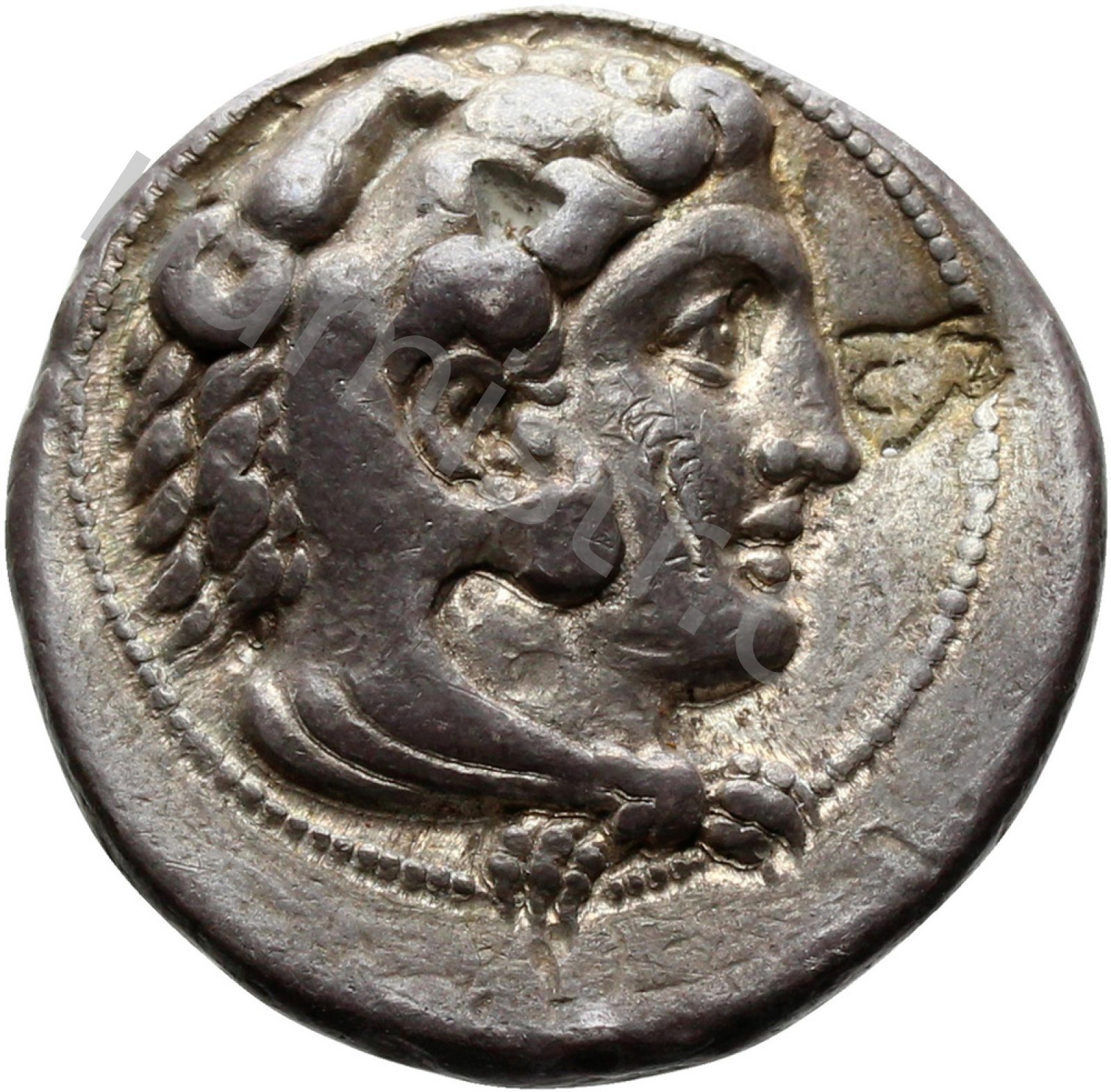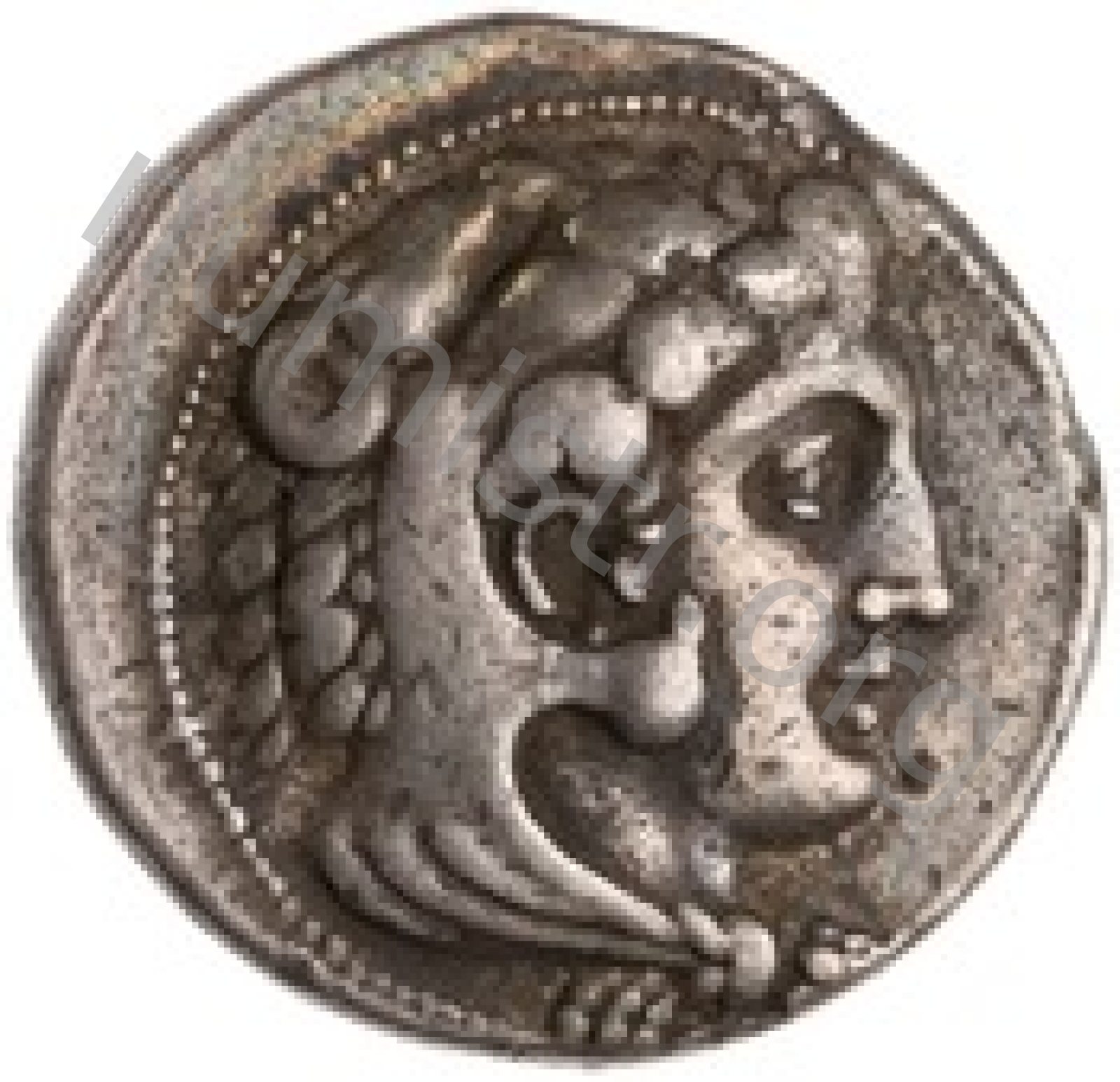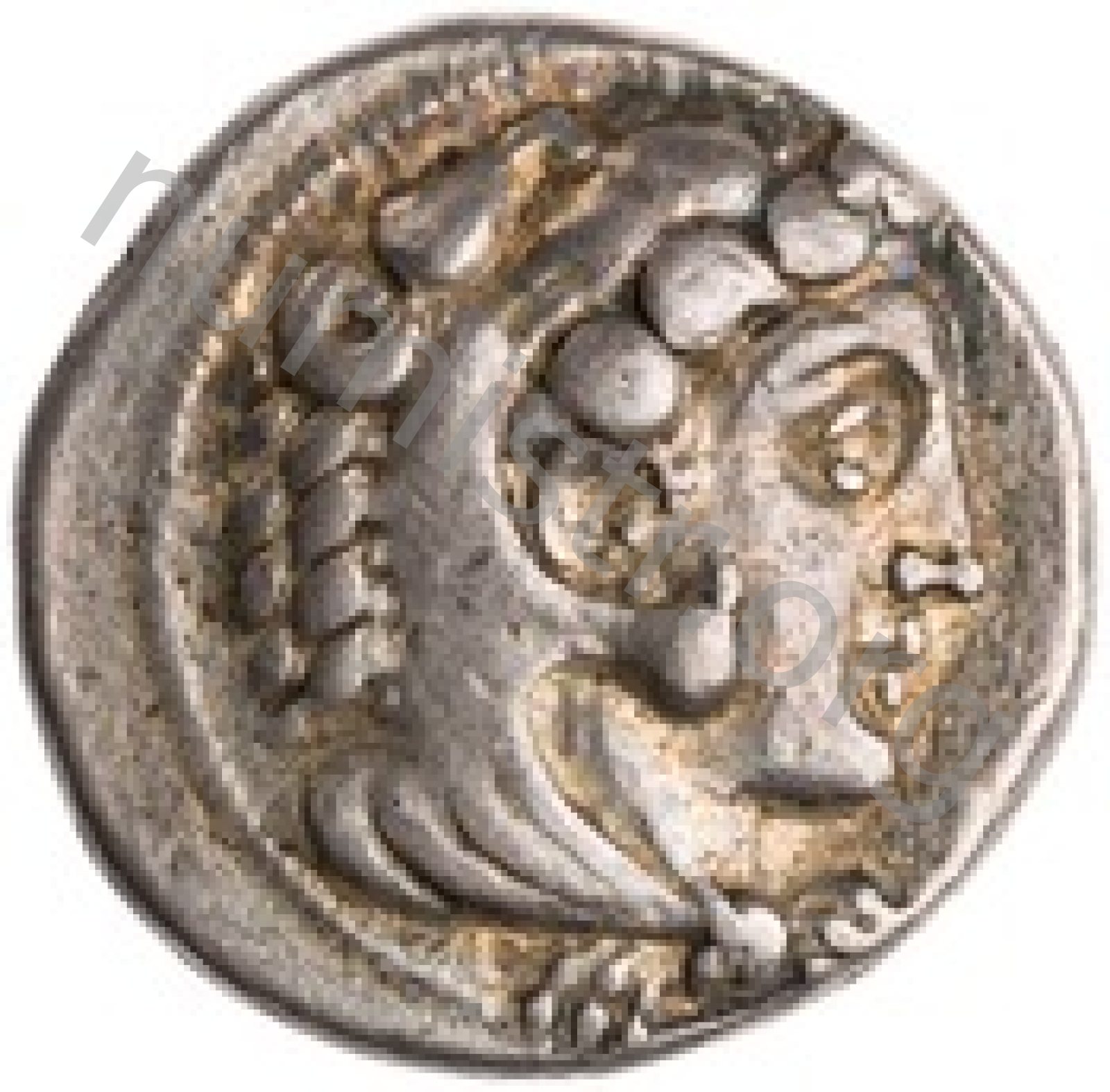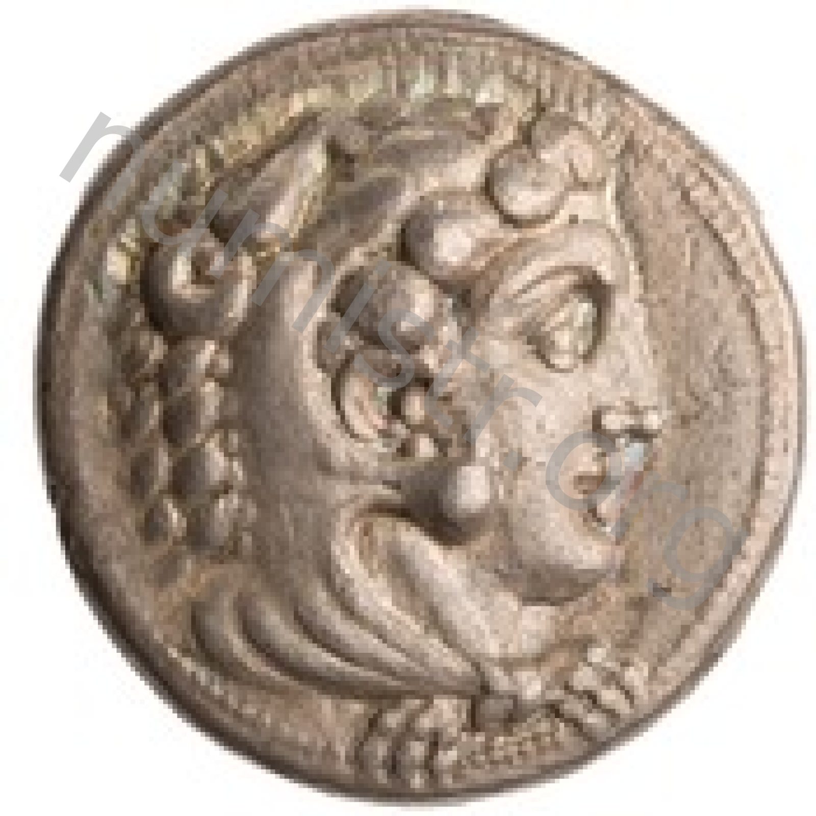 Head of beardless Heracles right wearing lion skin headdress -[en]