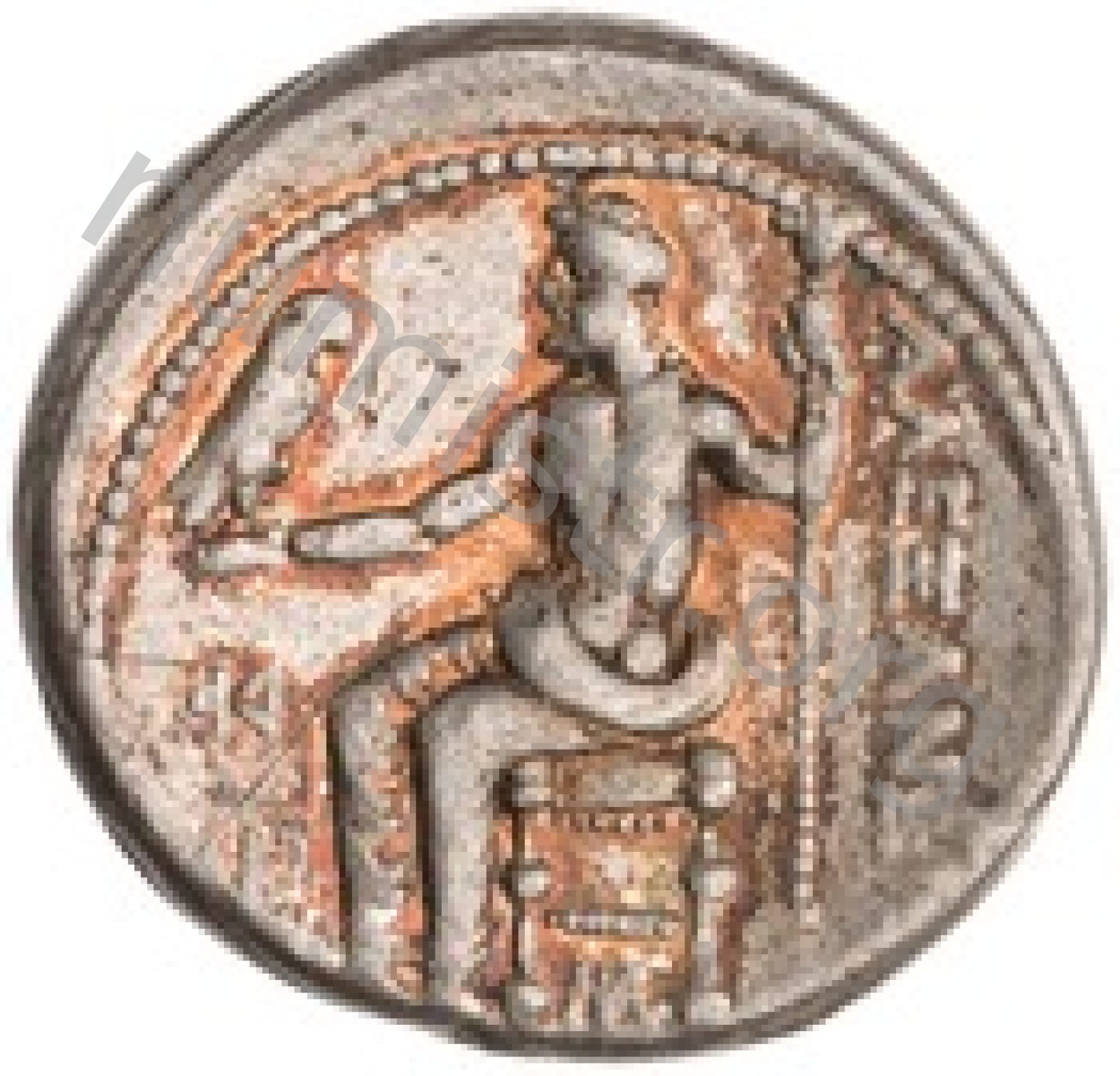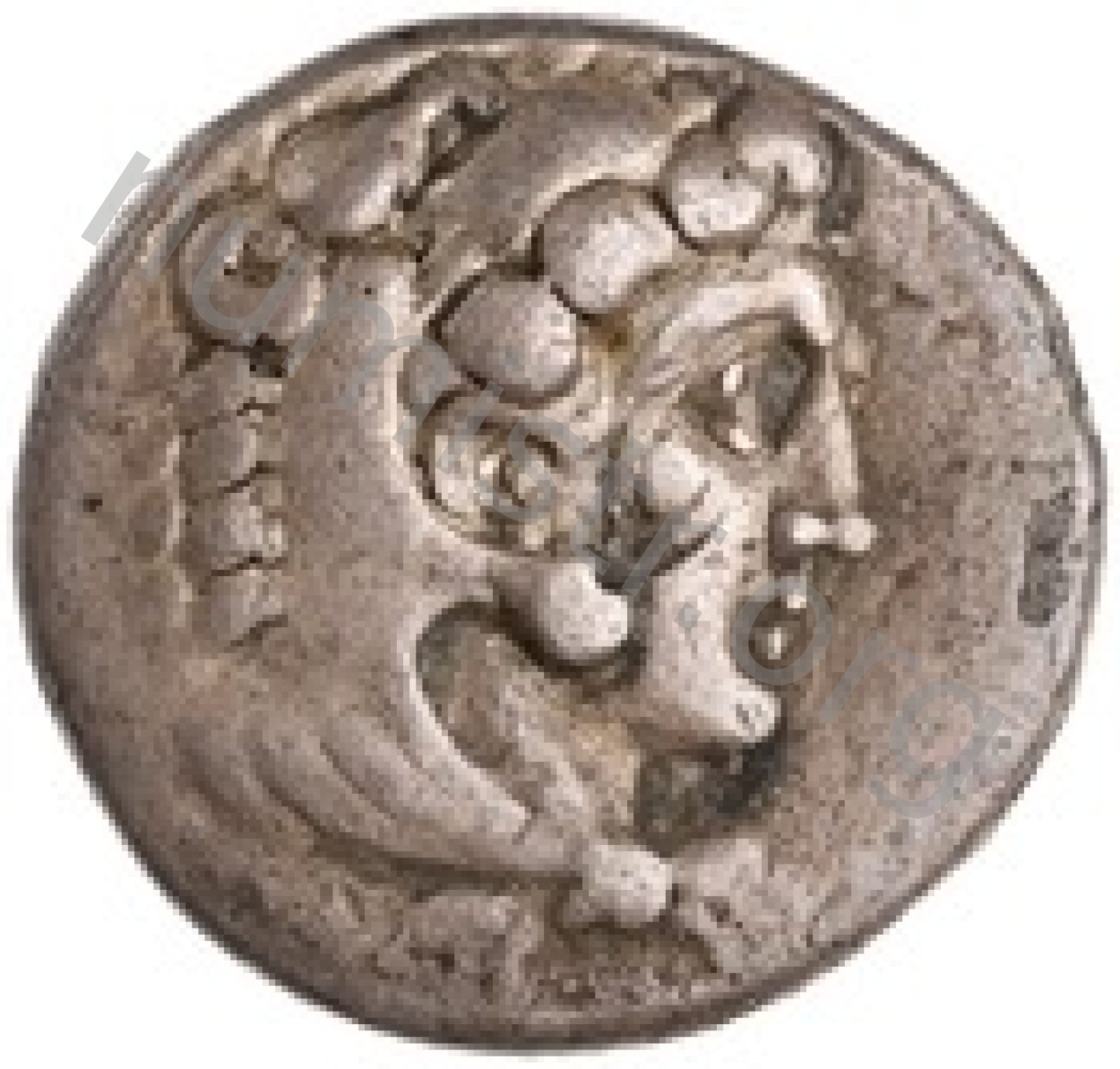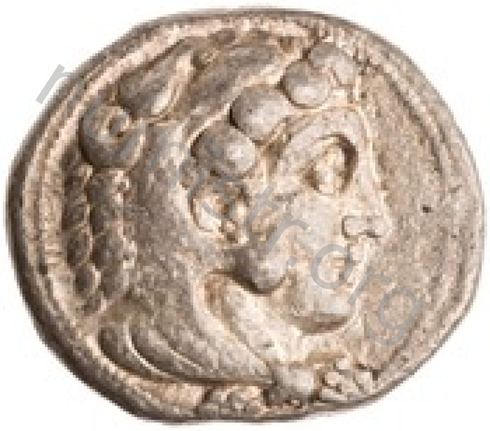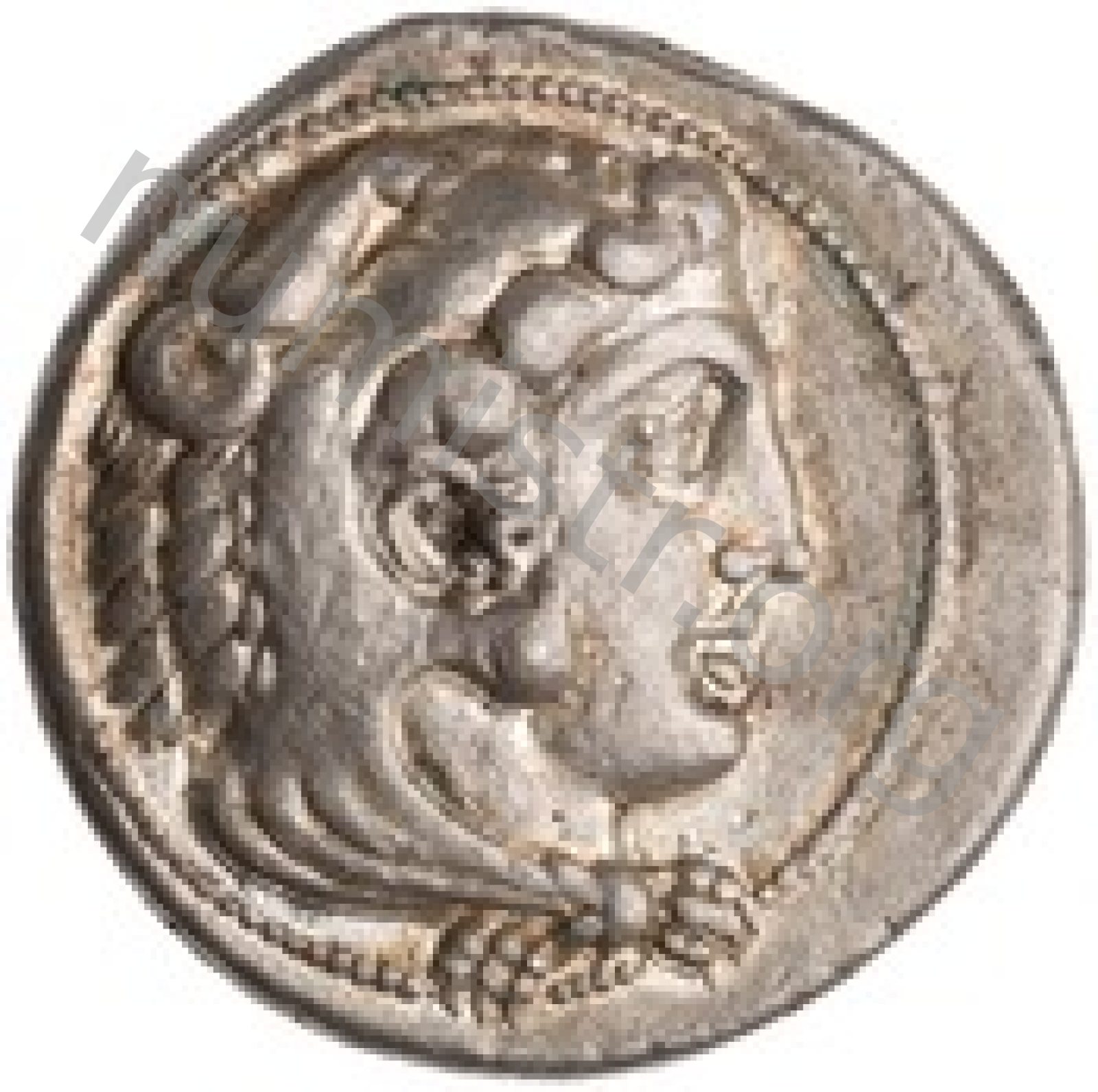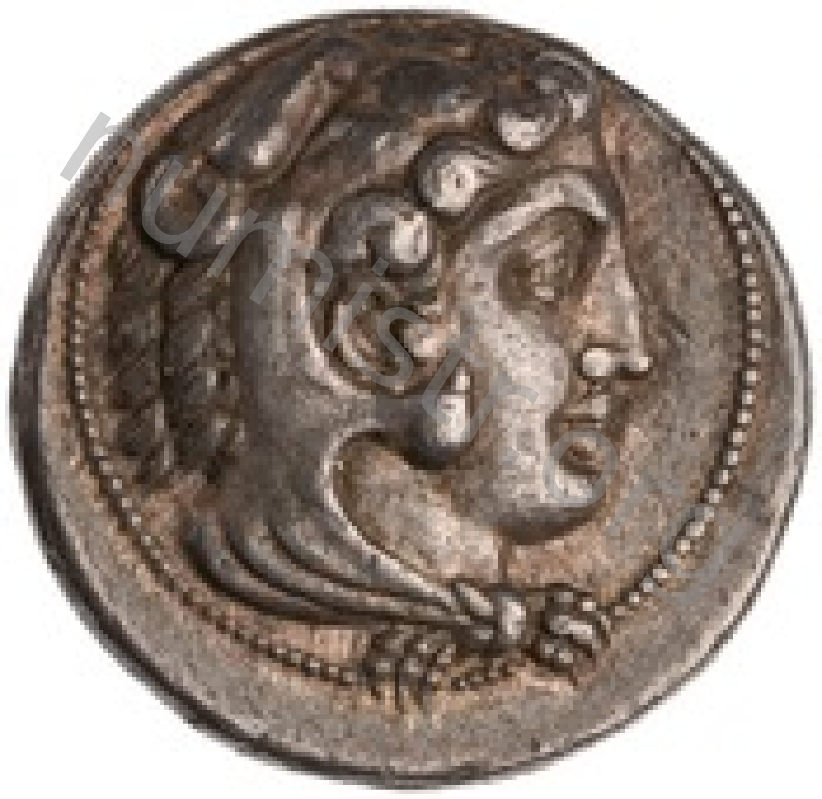 Head of beardless Heracles right wearing lion skin headdress -[en]