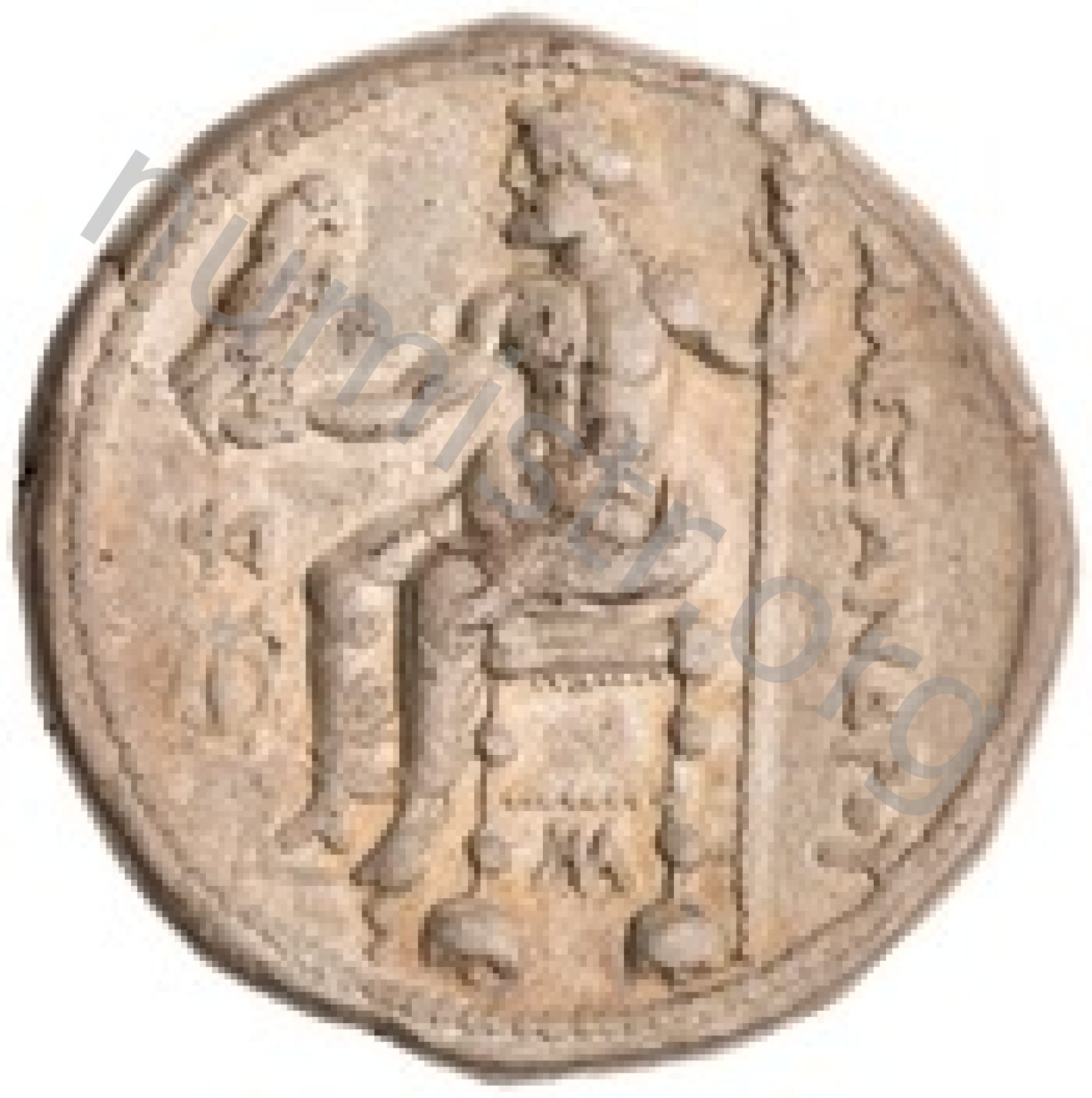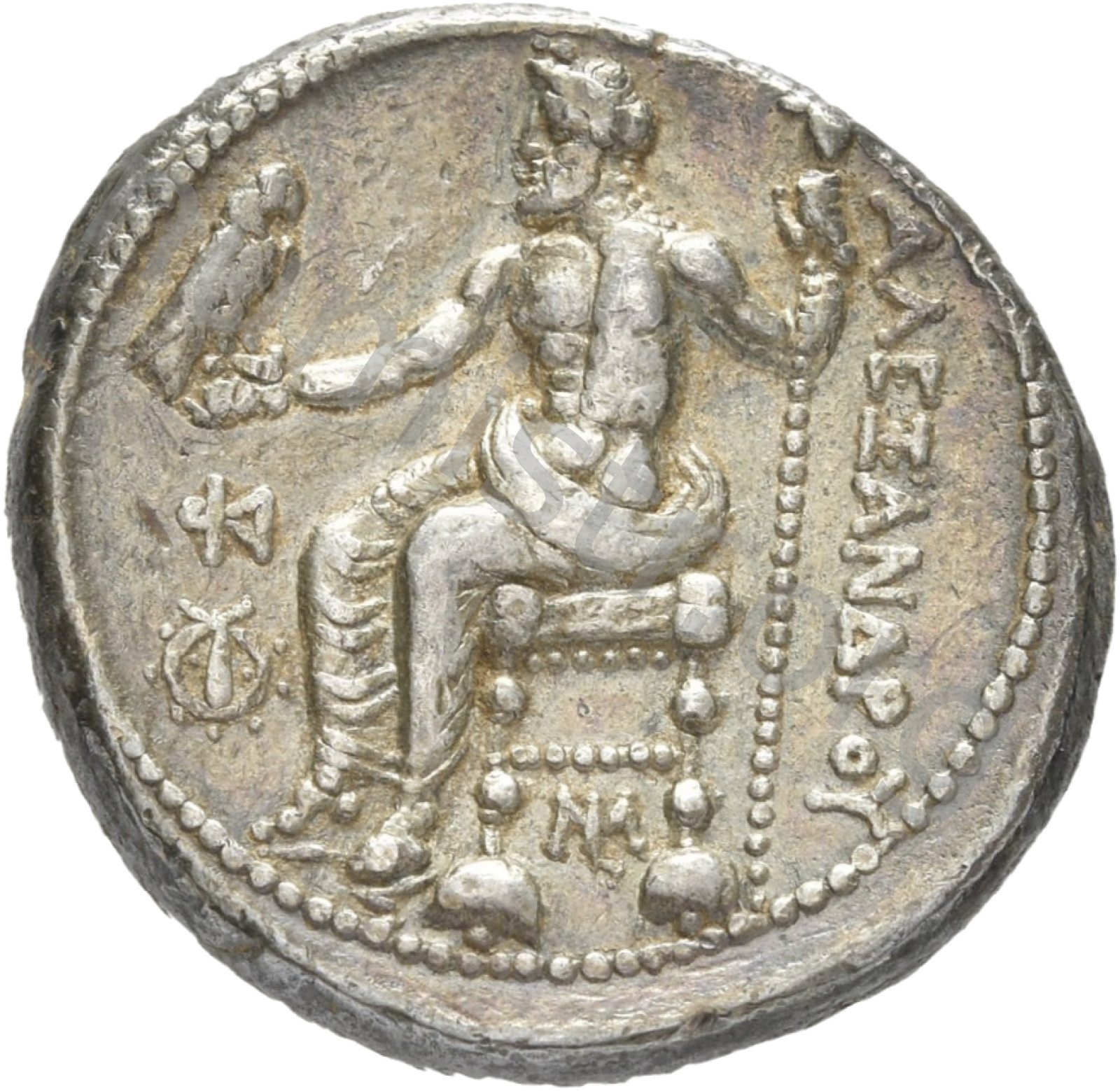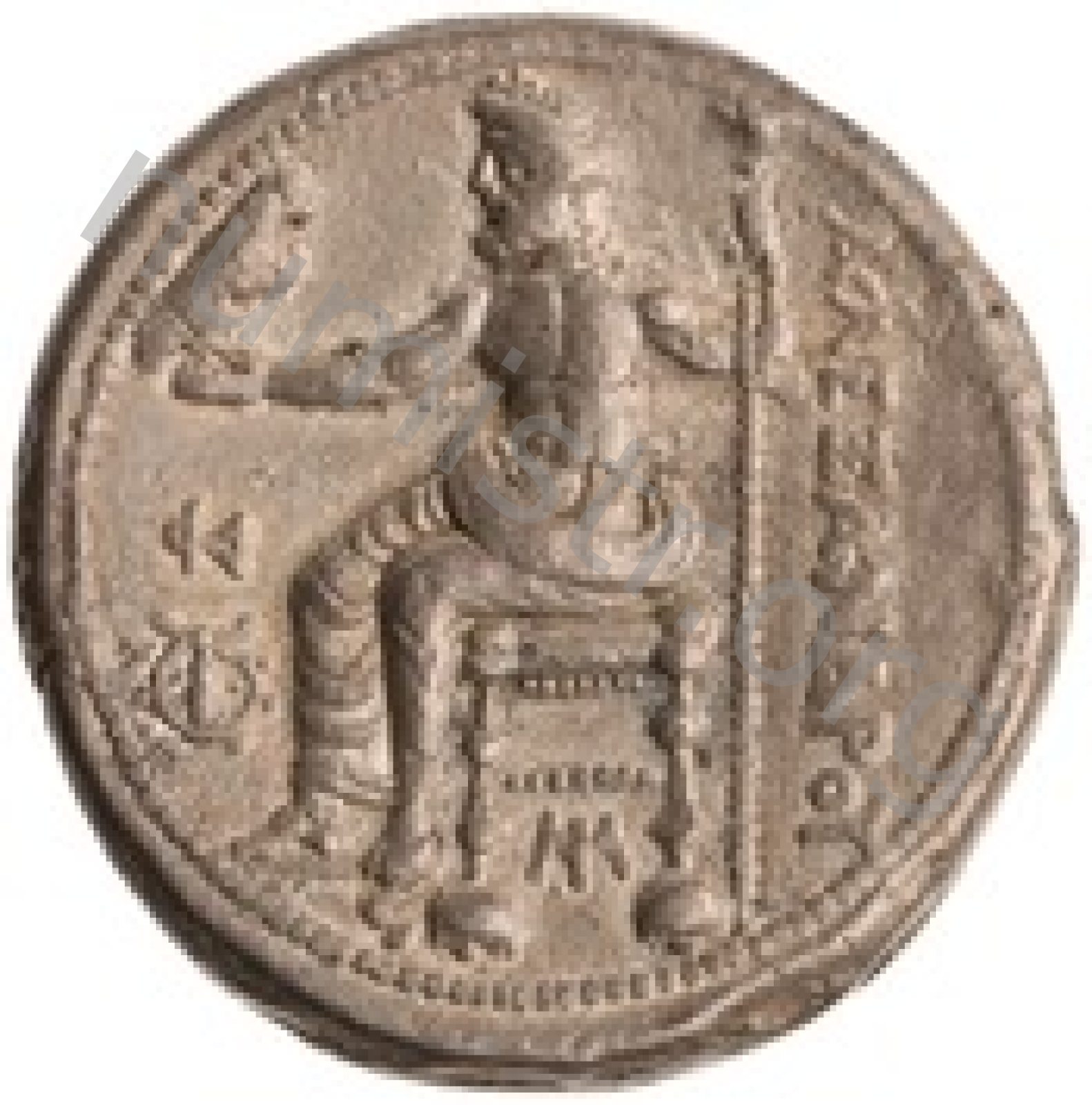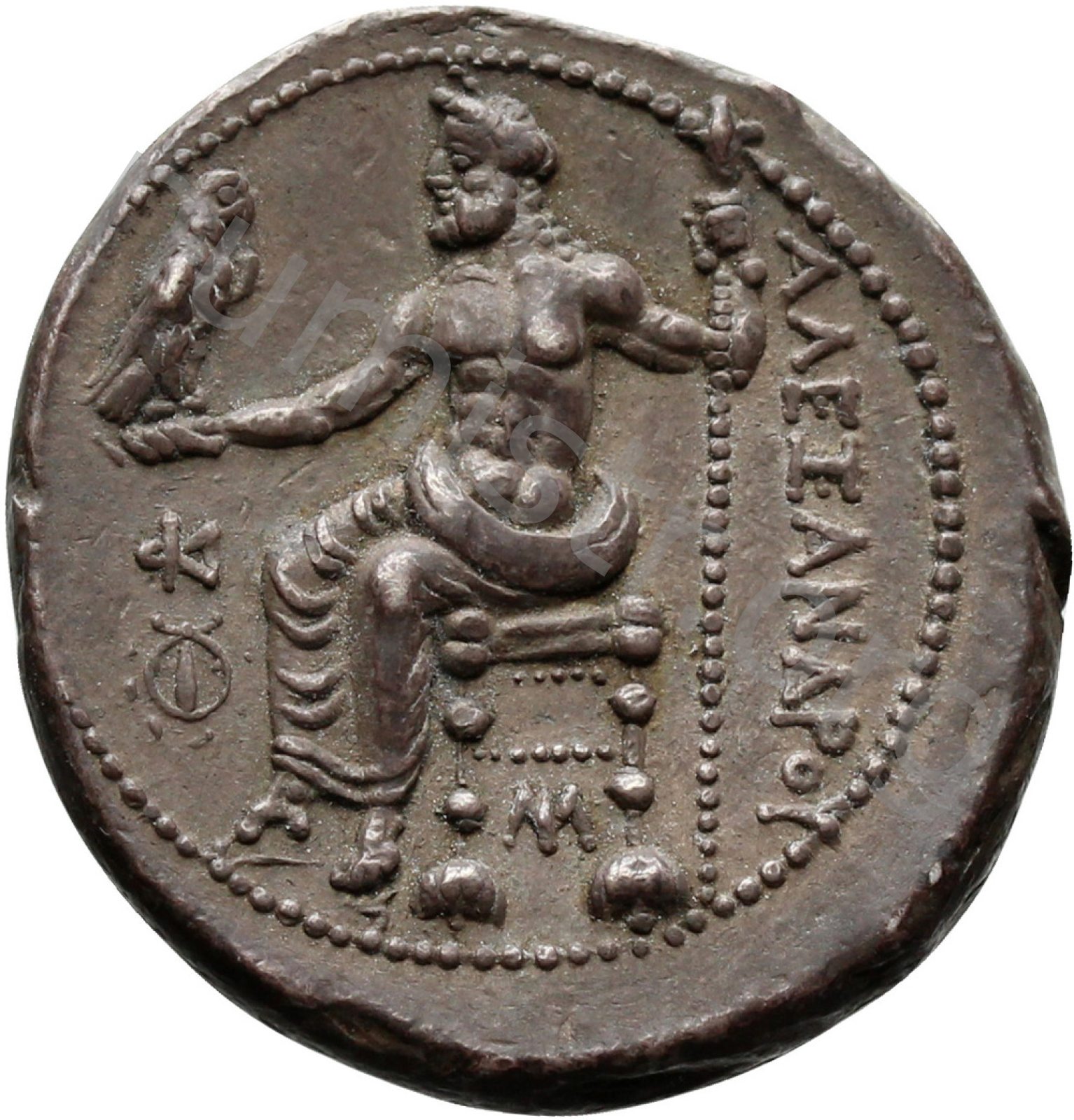 Zeus tabure-tahtta oturuyor sol elinde kartal sağ elinde asa var.