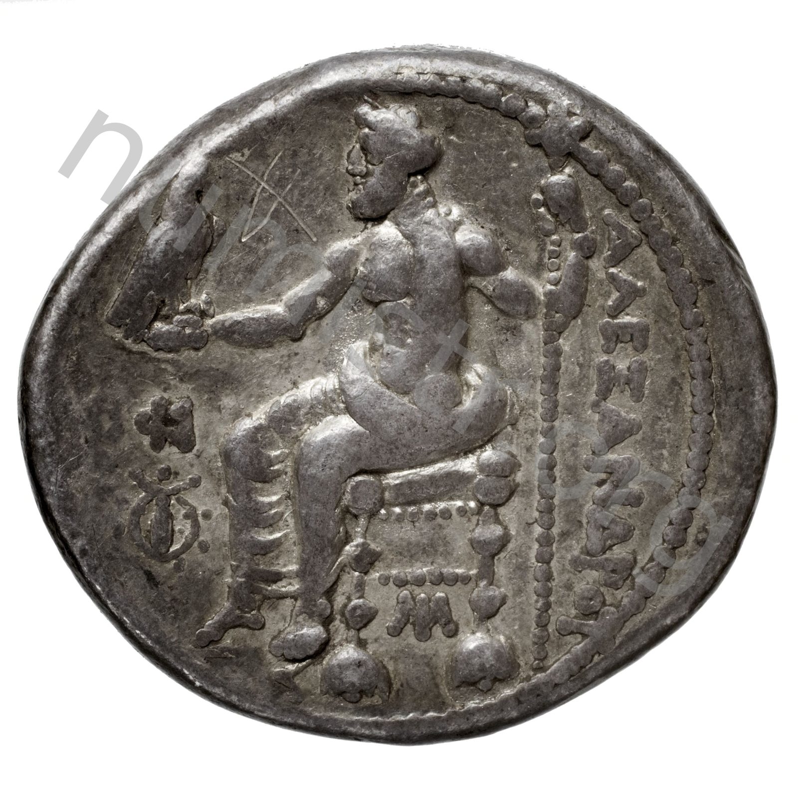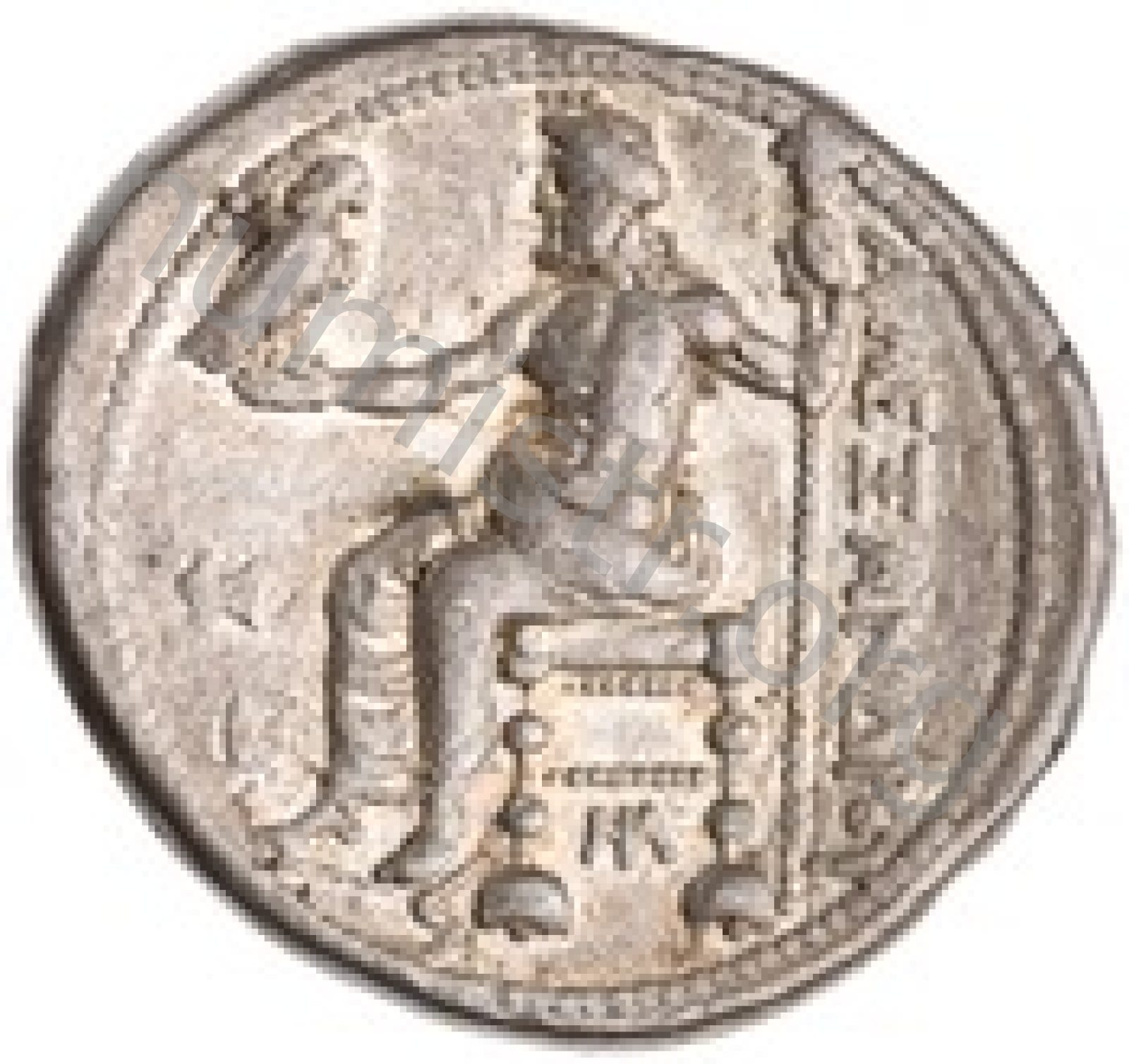Zeus seated on stool-throne left eagle on outstretched right hand sceptre in left hand -[en]