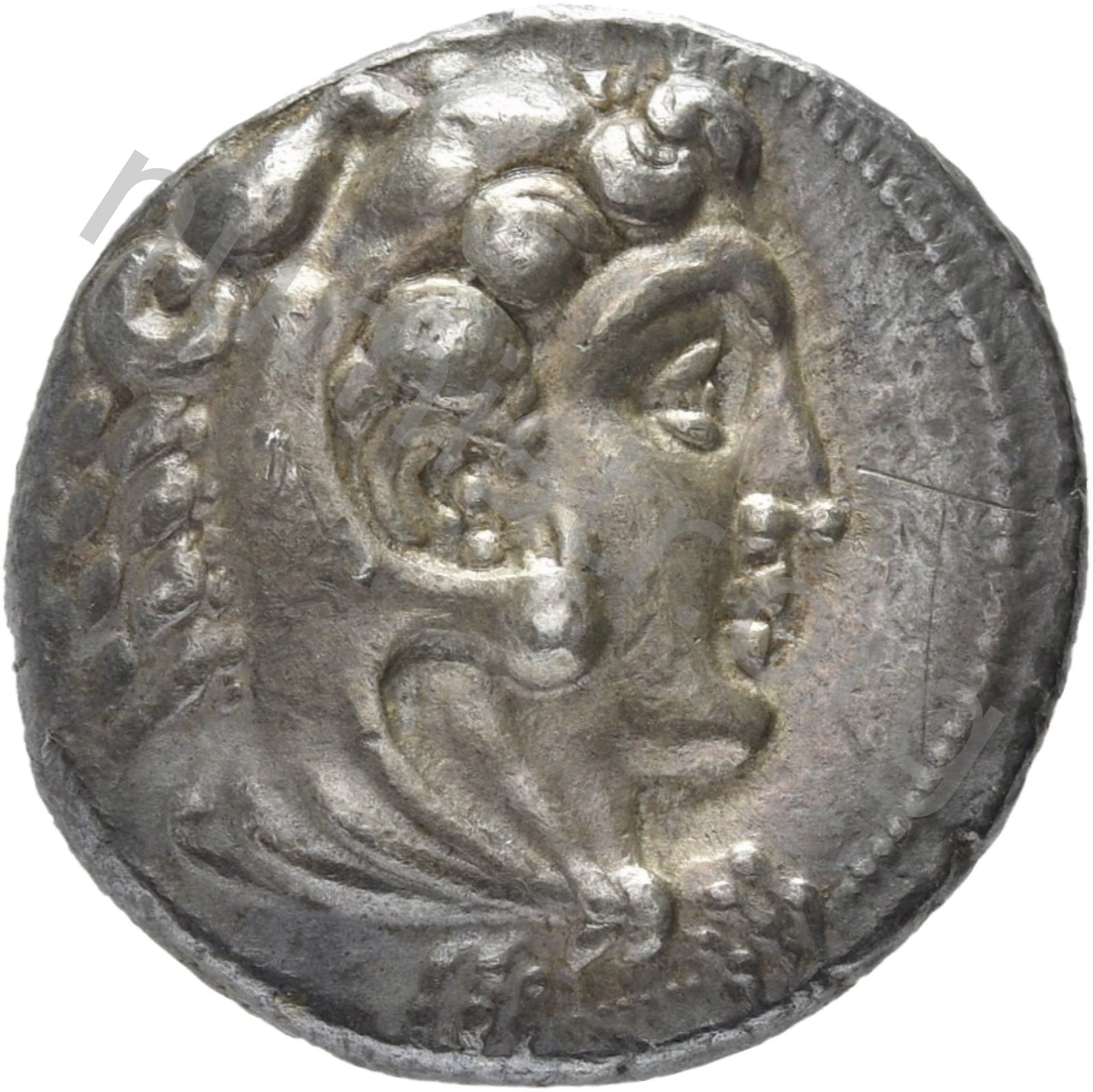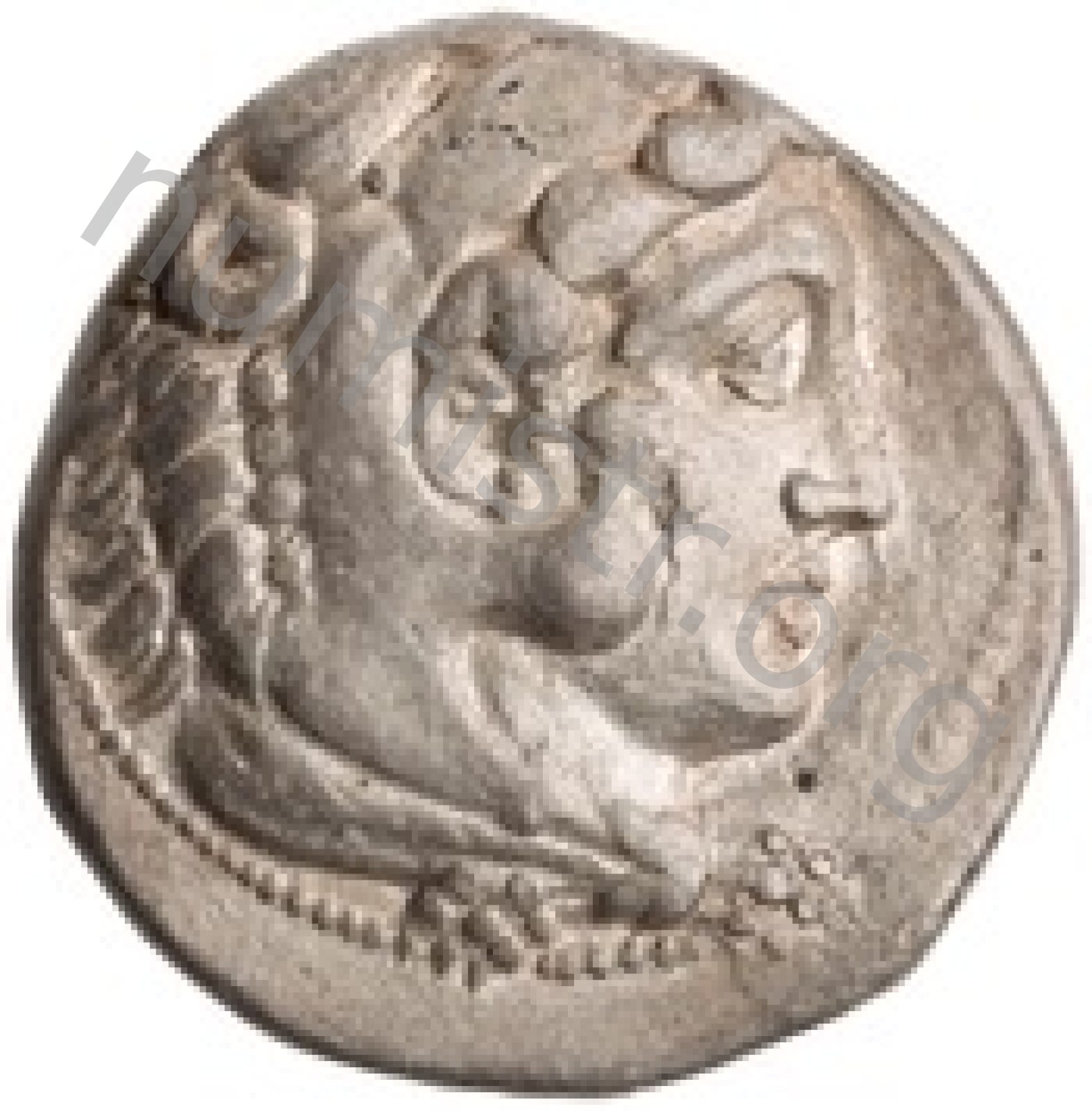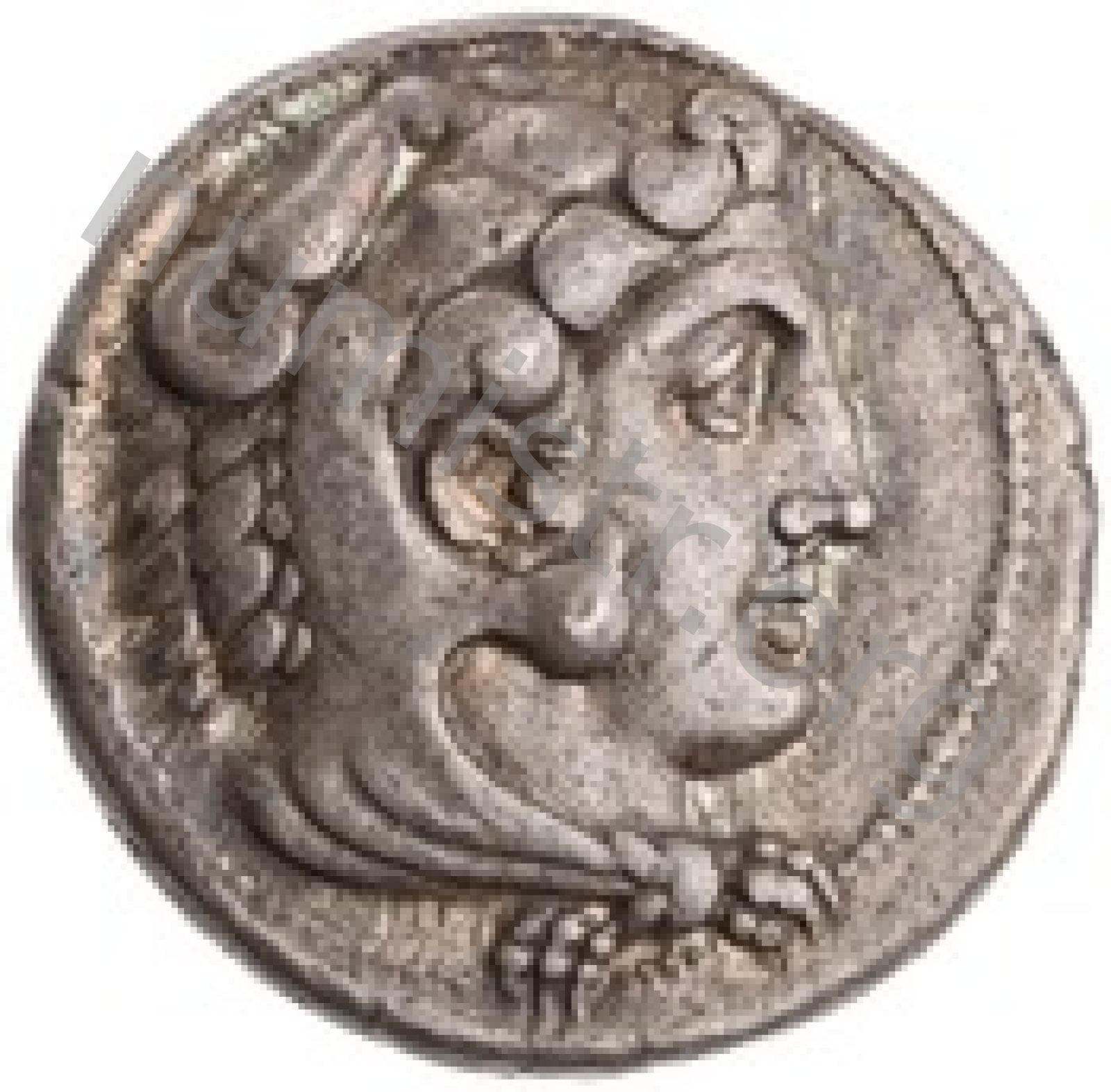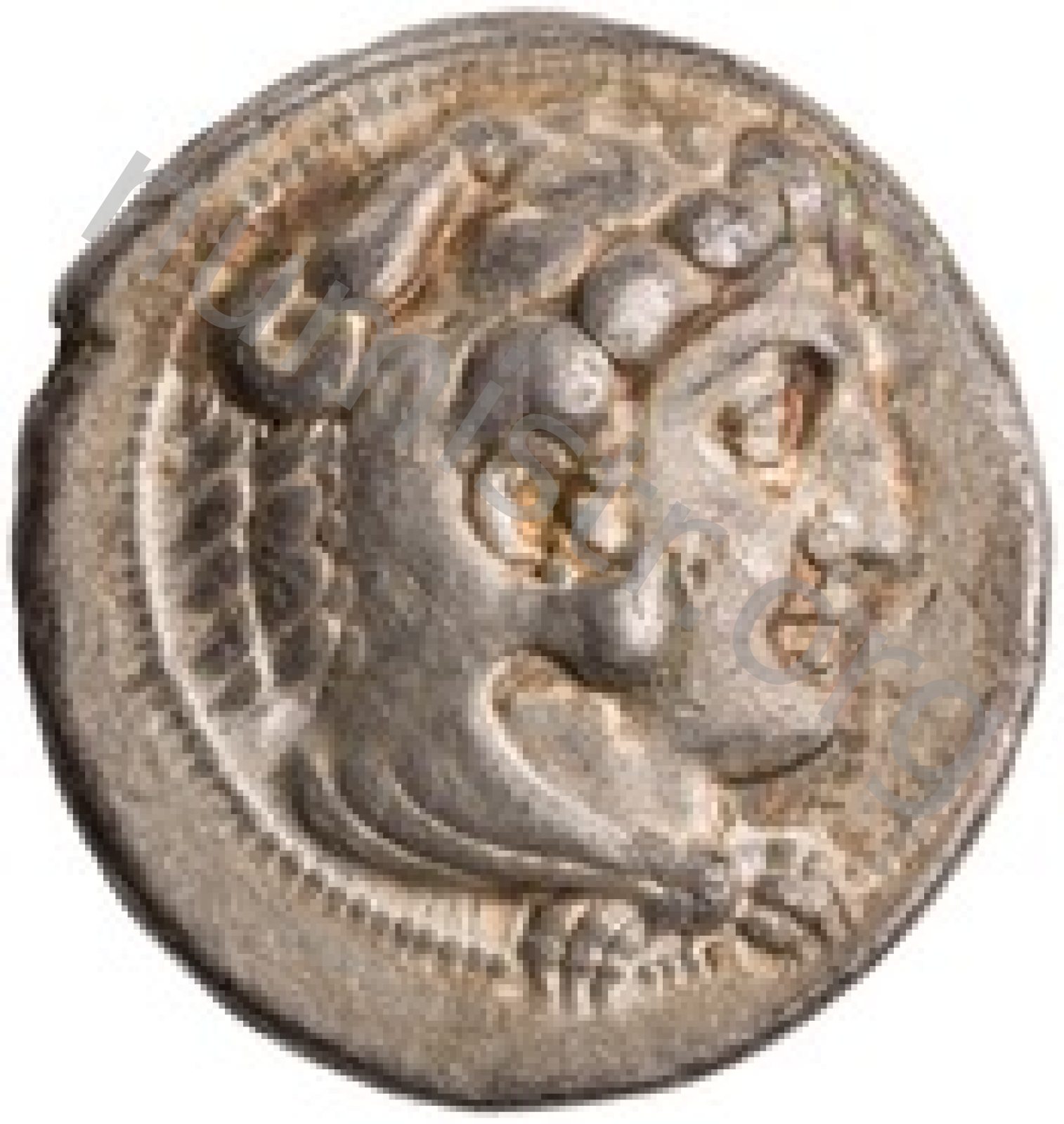 Head of beardless Heracles right wearing lion skin headdress -[en]